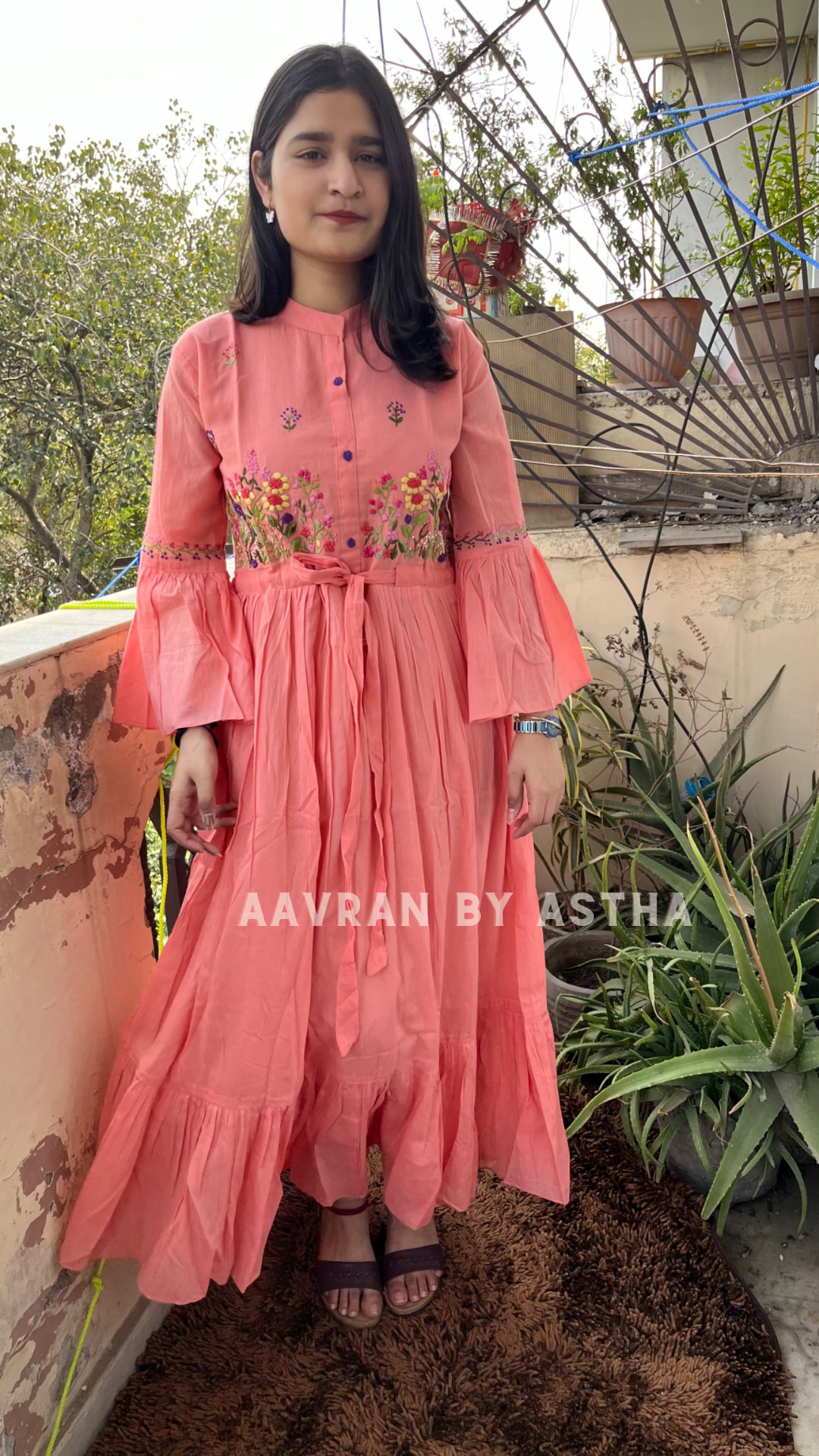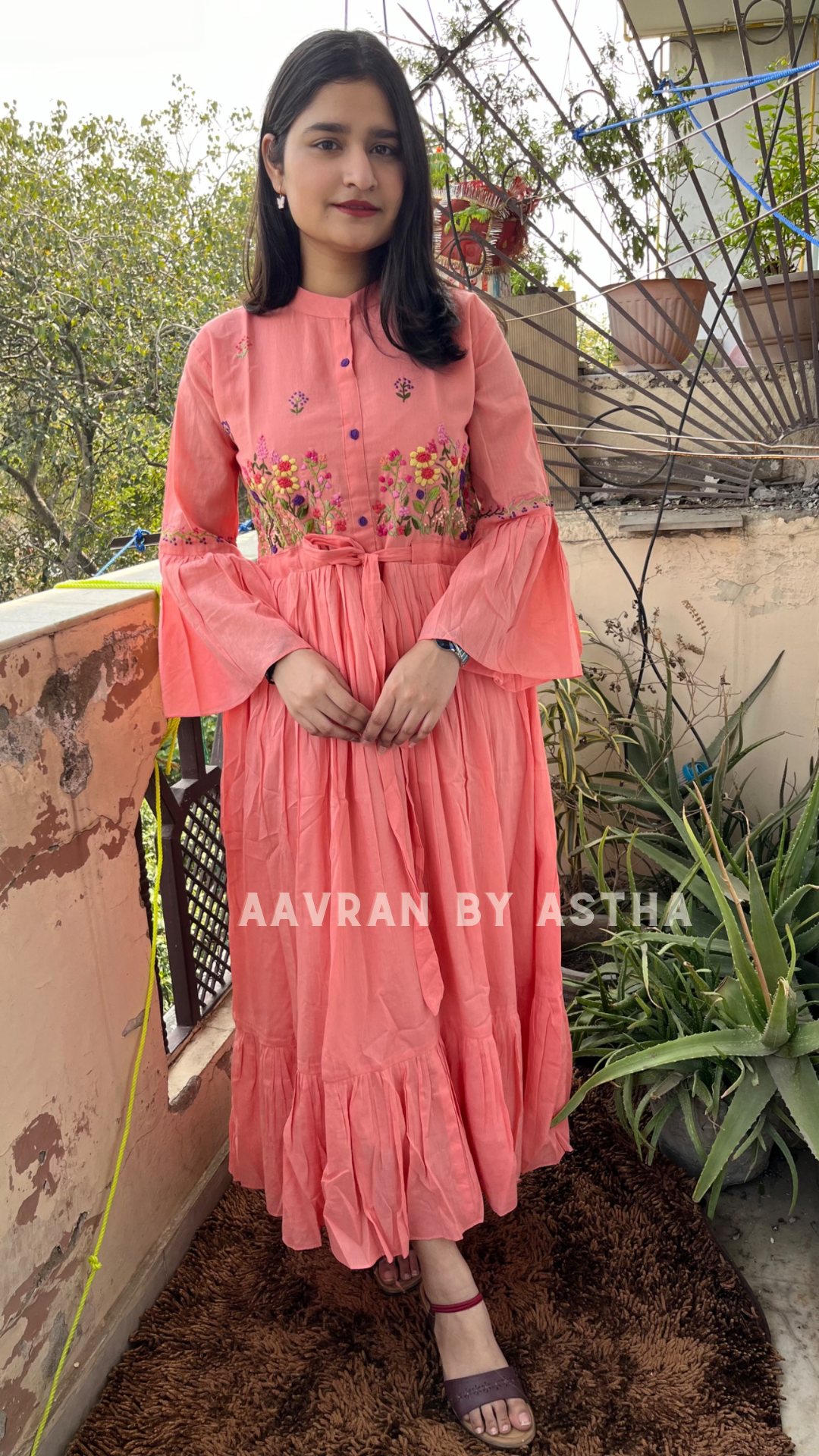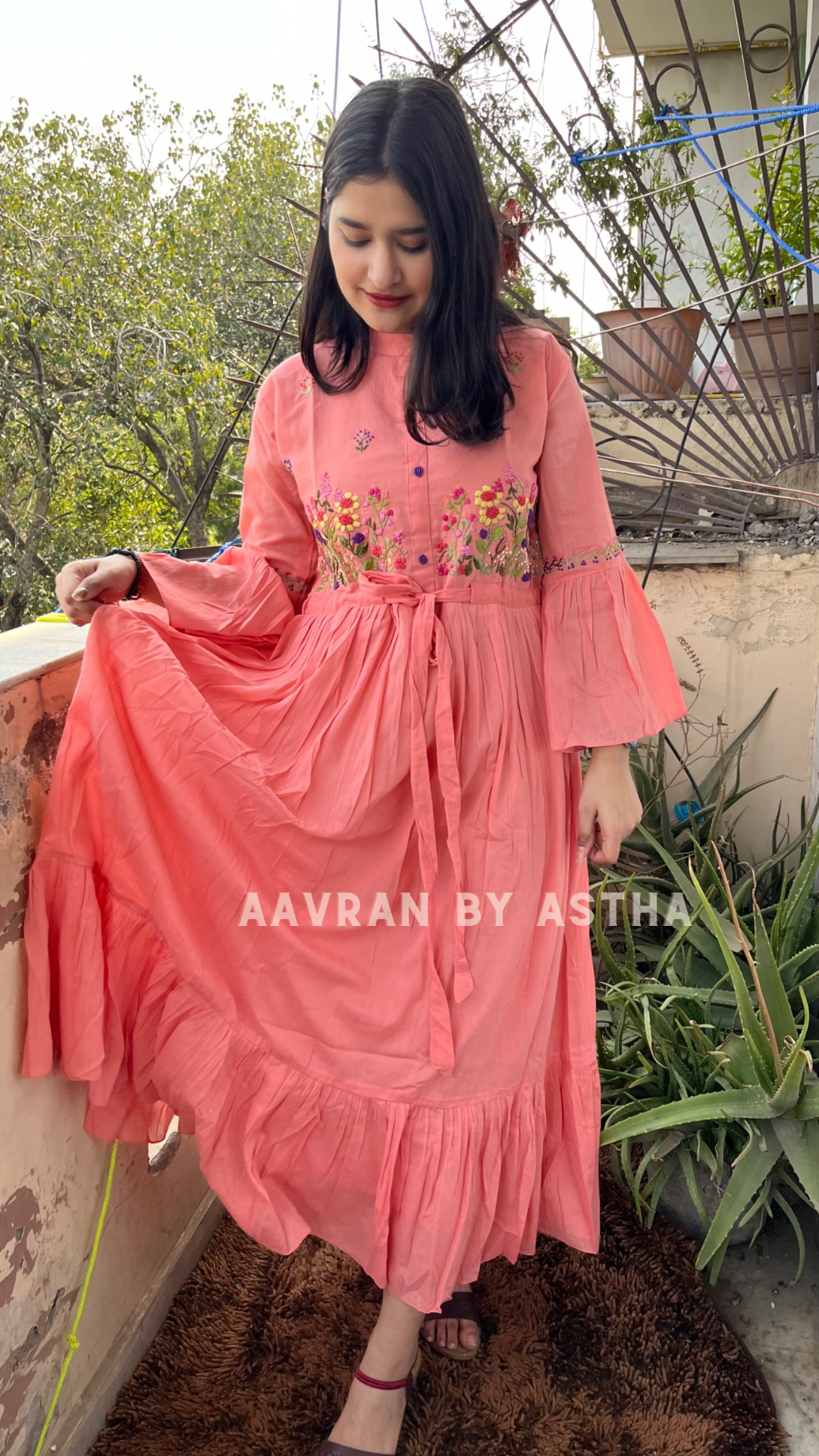 Aakhir.. A beautiful peach colored pure mul mul gown to add . It has its own charm due to beautiful combination of base color and perfect embroidery colors. The cloth material is mul mul. It is so comfortable and flowy, which is apt for killing summer weather.