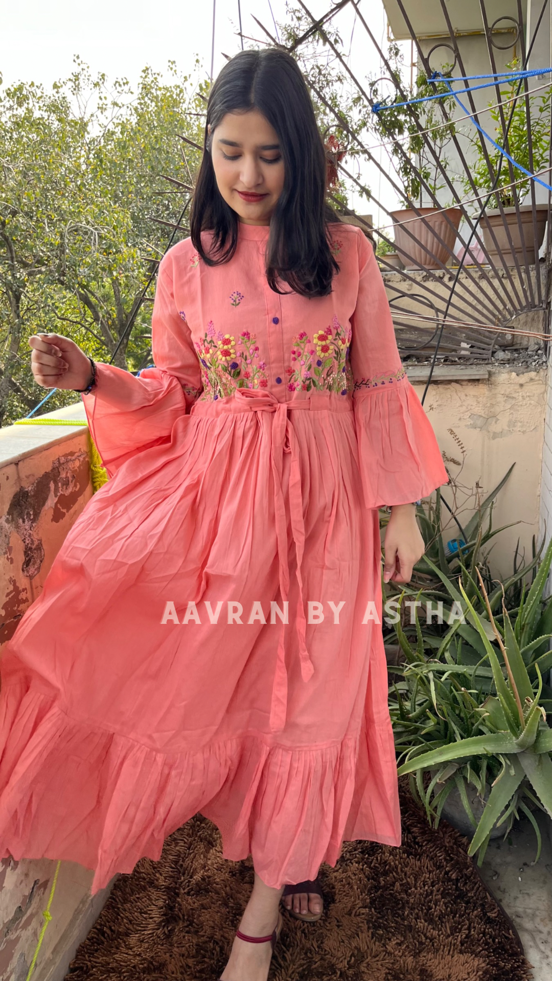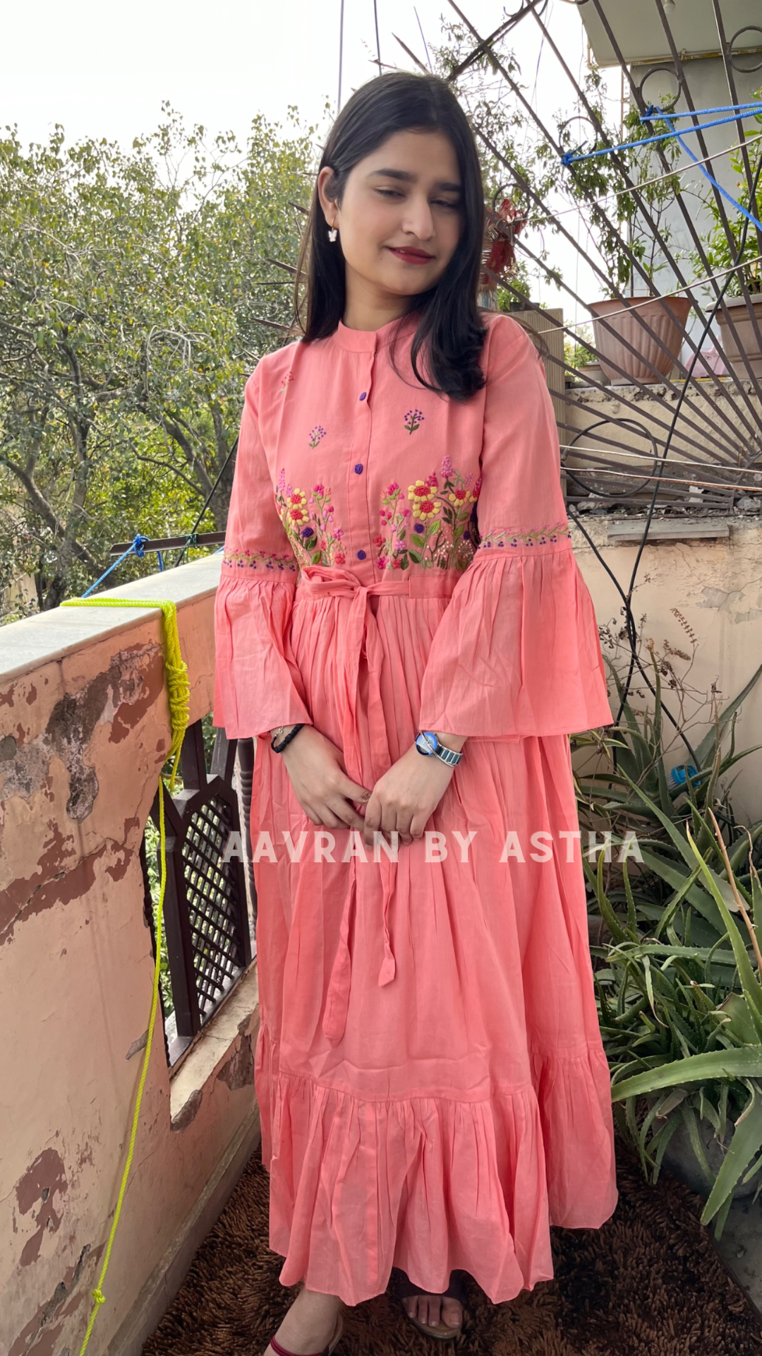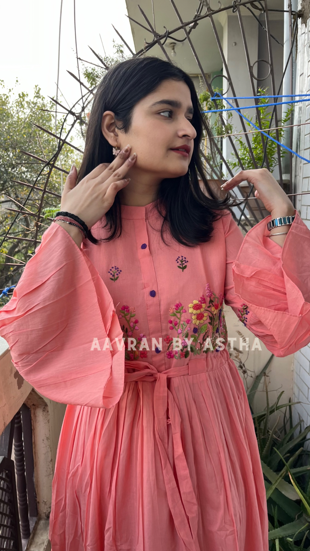 Aakhir.. A beautiful peach colored pure mul mul gown to add . It has its own charm due to beautiful combination of base color and perfect embroidery colors. The cloth material is mul mul. It is so comfortable and flowy, which is apt for killing summer weather.