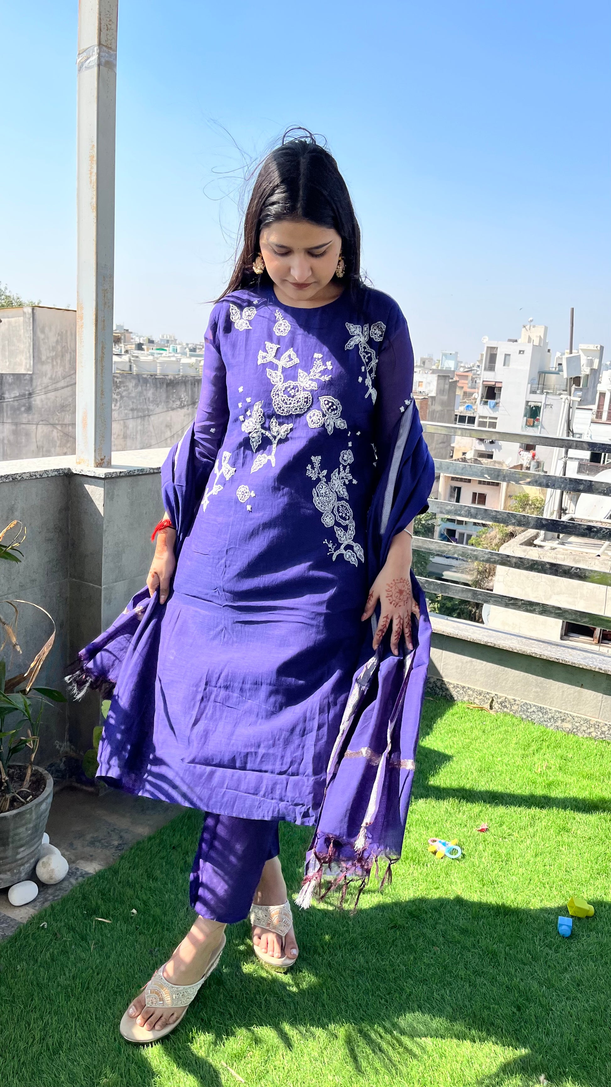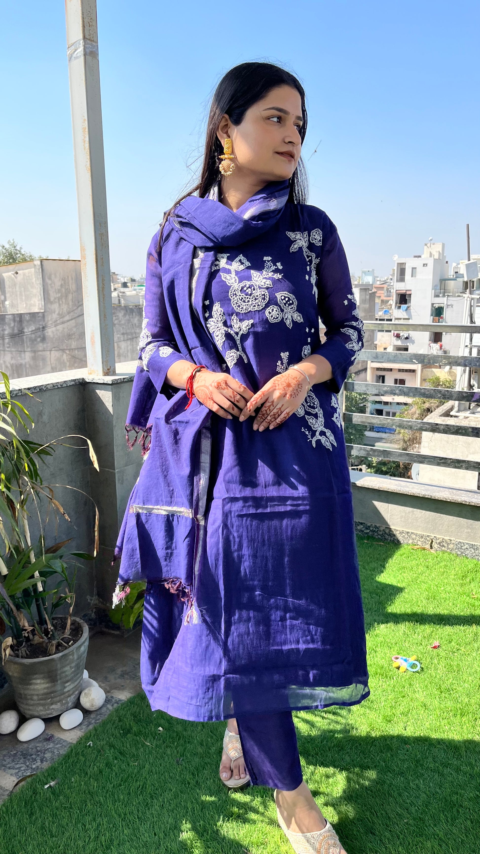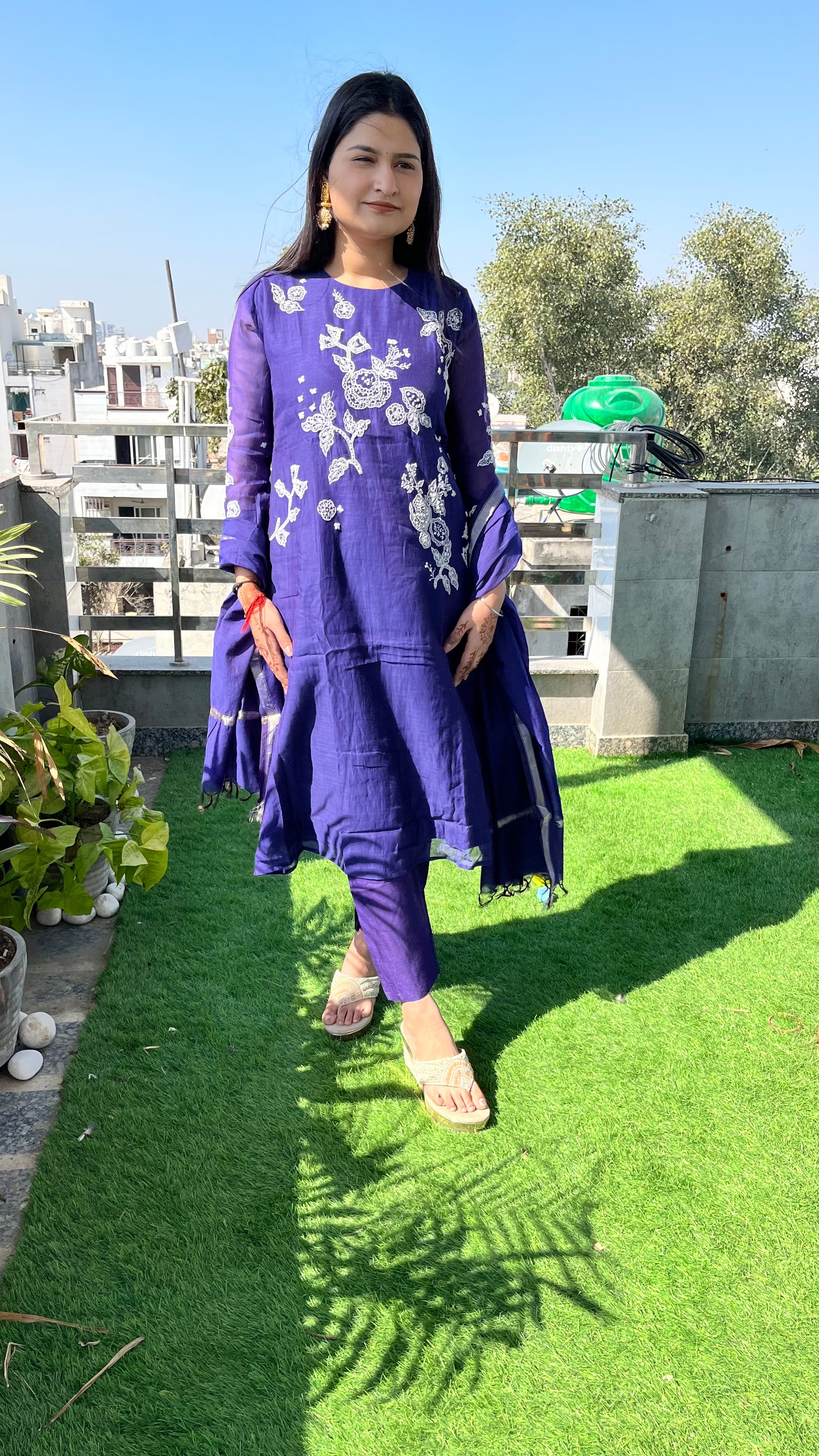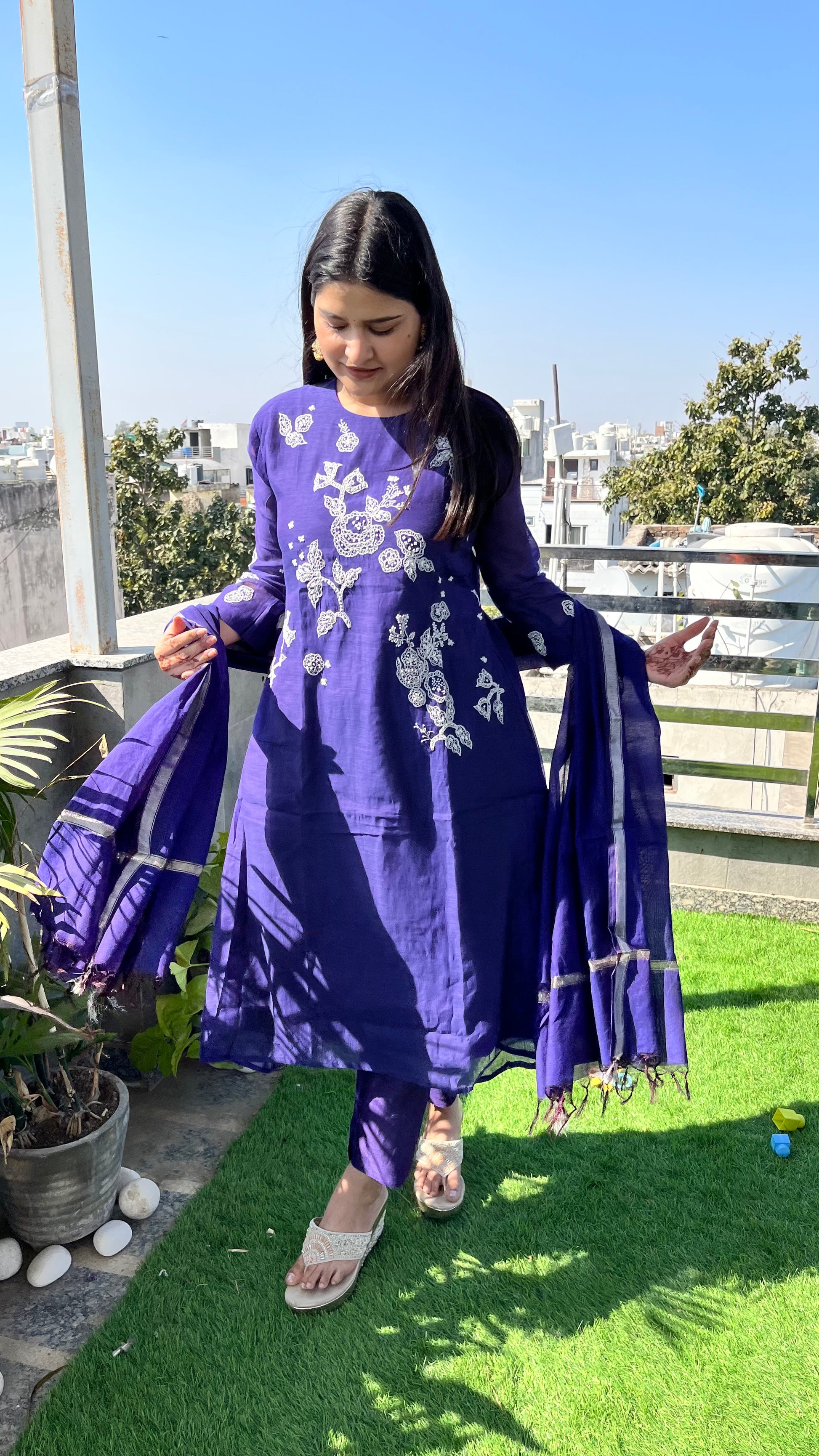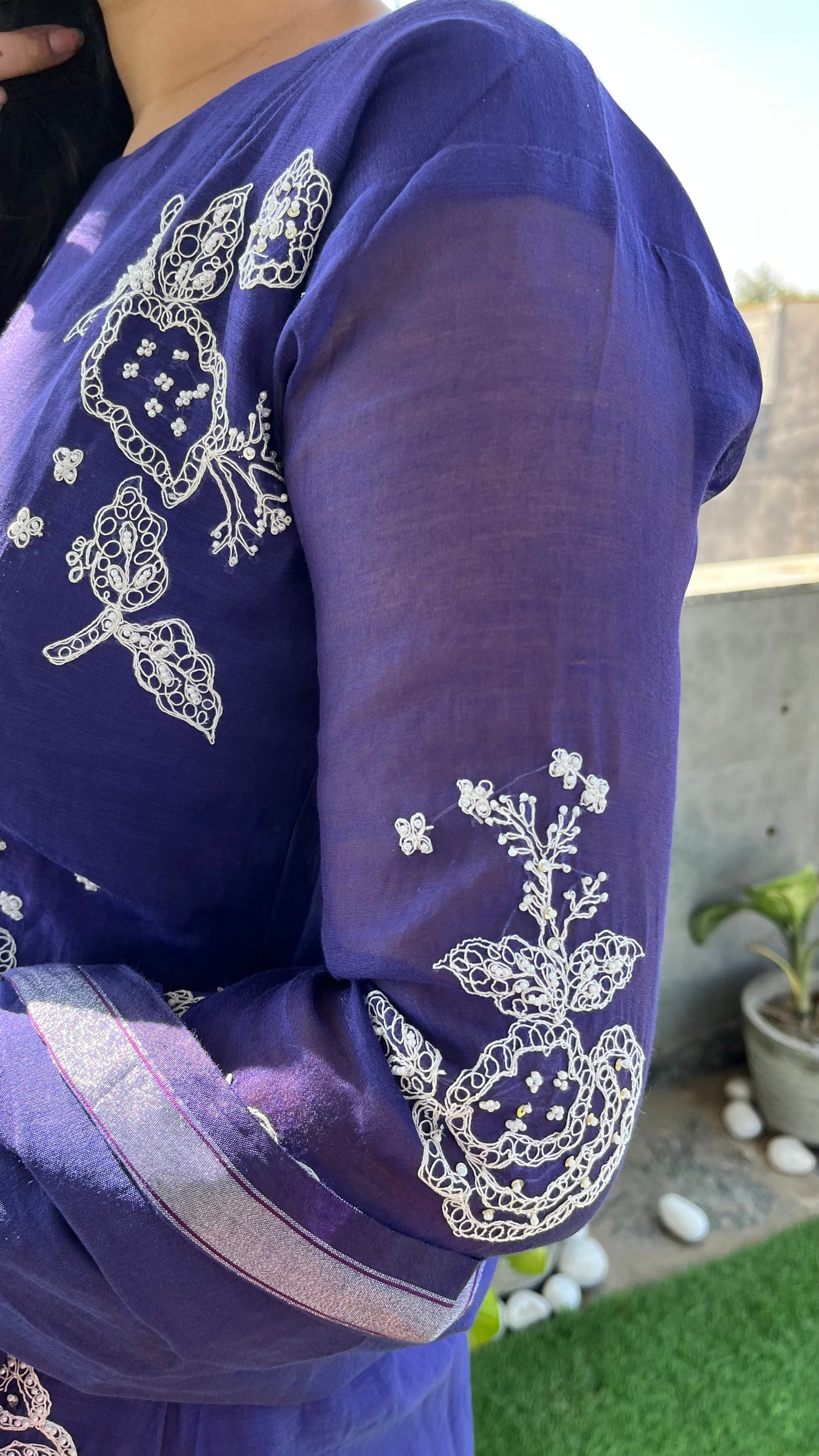 - This exquisite three-piece suit set is crafted from luxurious Mul Chanderi fabric, known for its lightweight, breathable texture and subtle sheen
