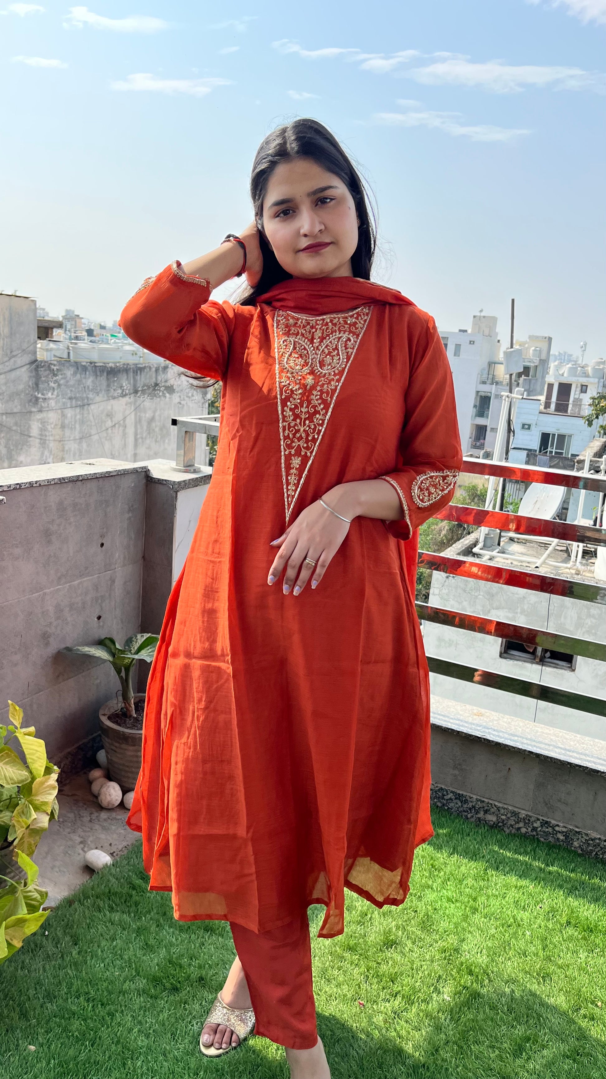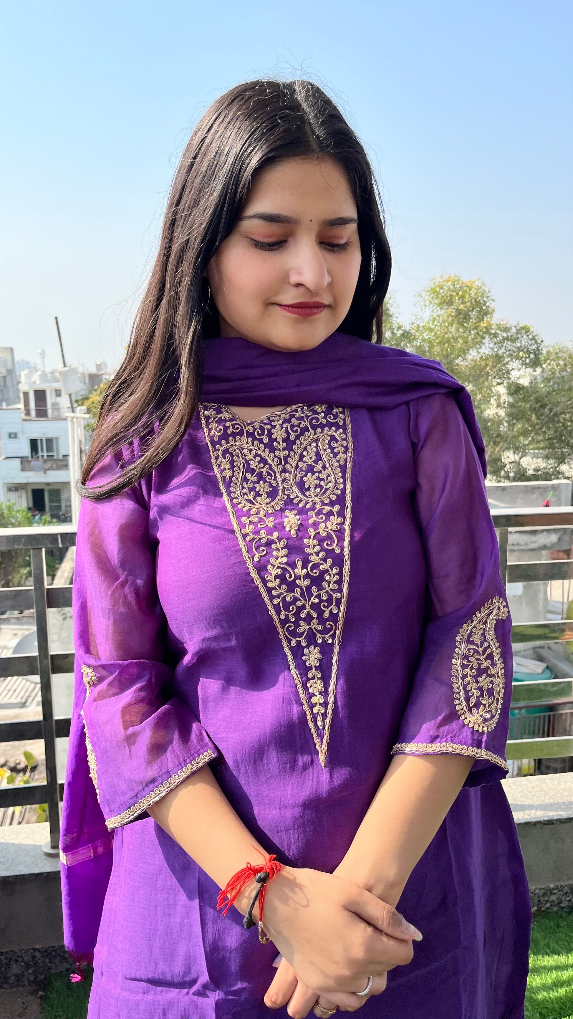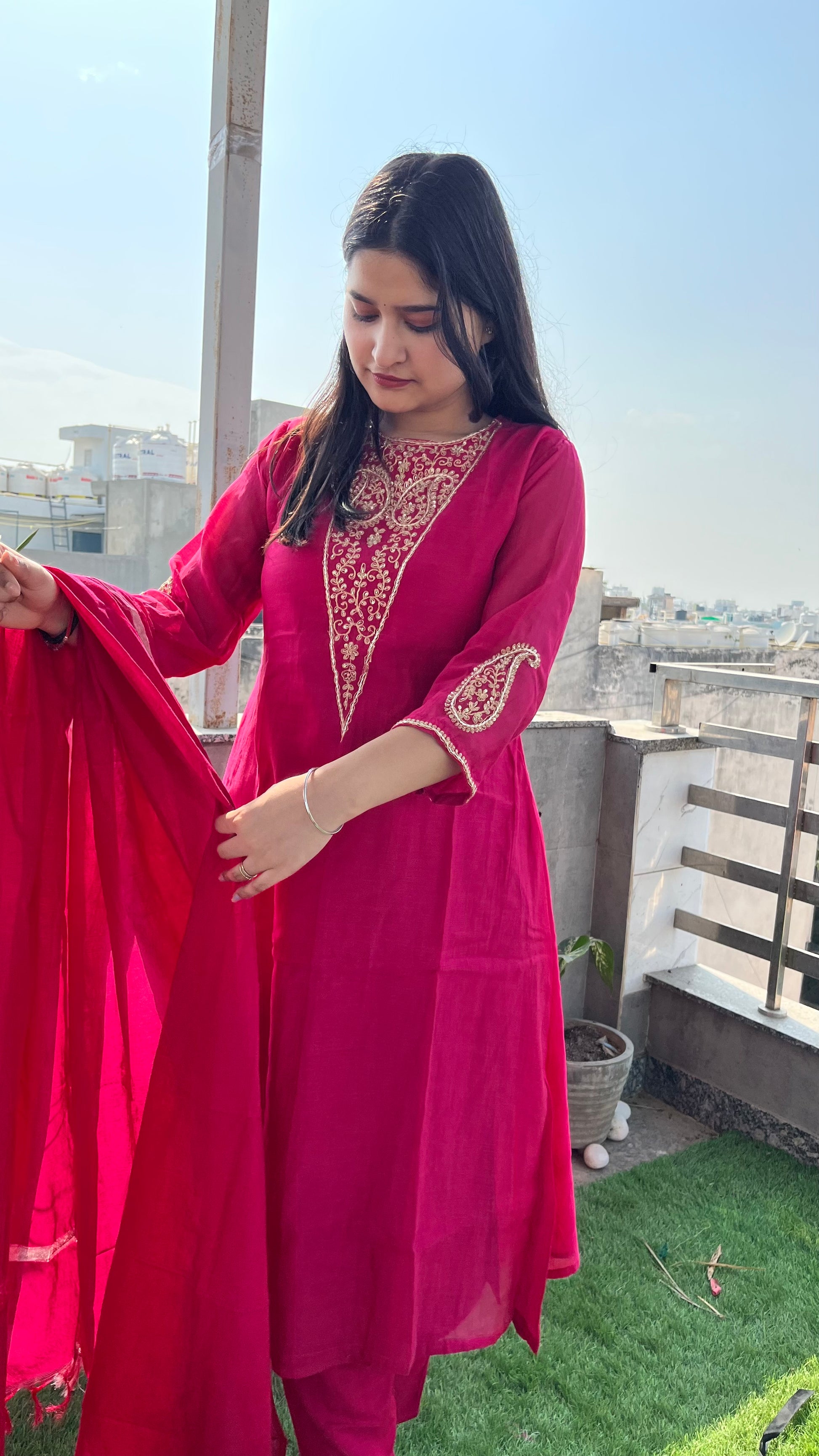 - This exquisite three-piece suit set is crafted from luxurious Mul Chanderi fabric, known for its lightweight, breathable texture and subtle sheen