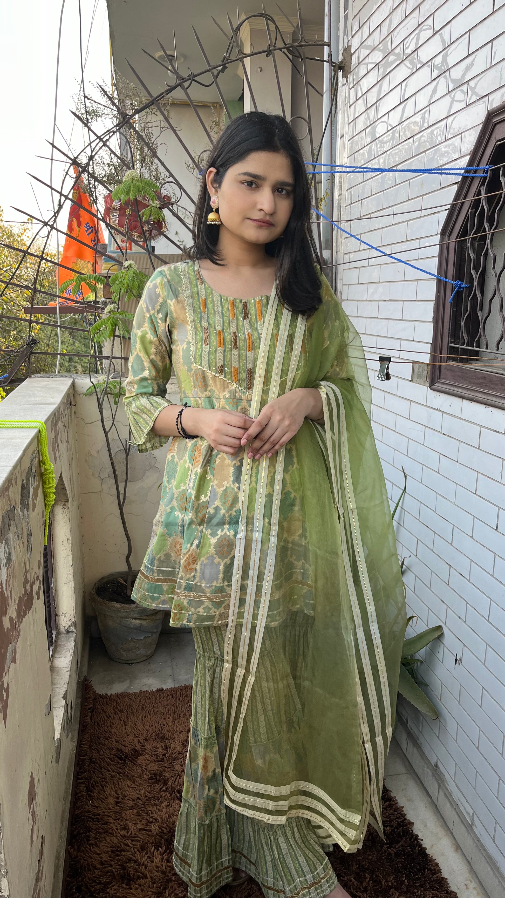 - Crafted from high-quality modal muslin fabric, the Anu 3 piece sharara set boasts exquisite zari work and a beautiful dupatta.