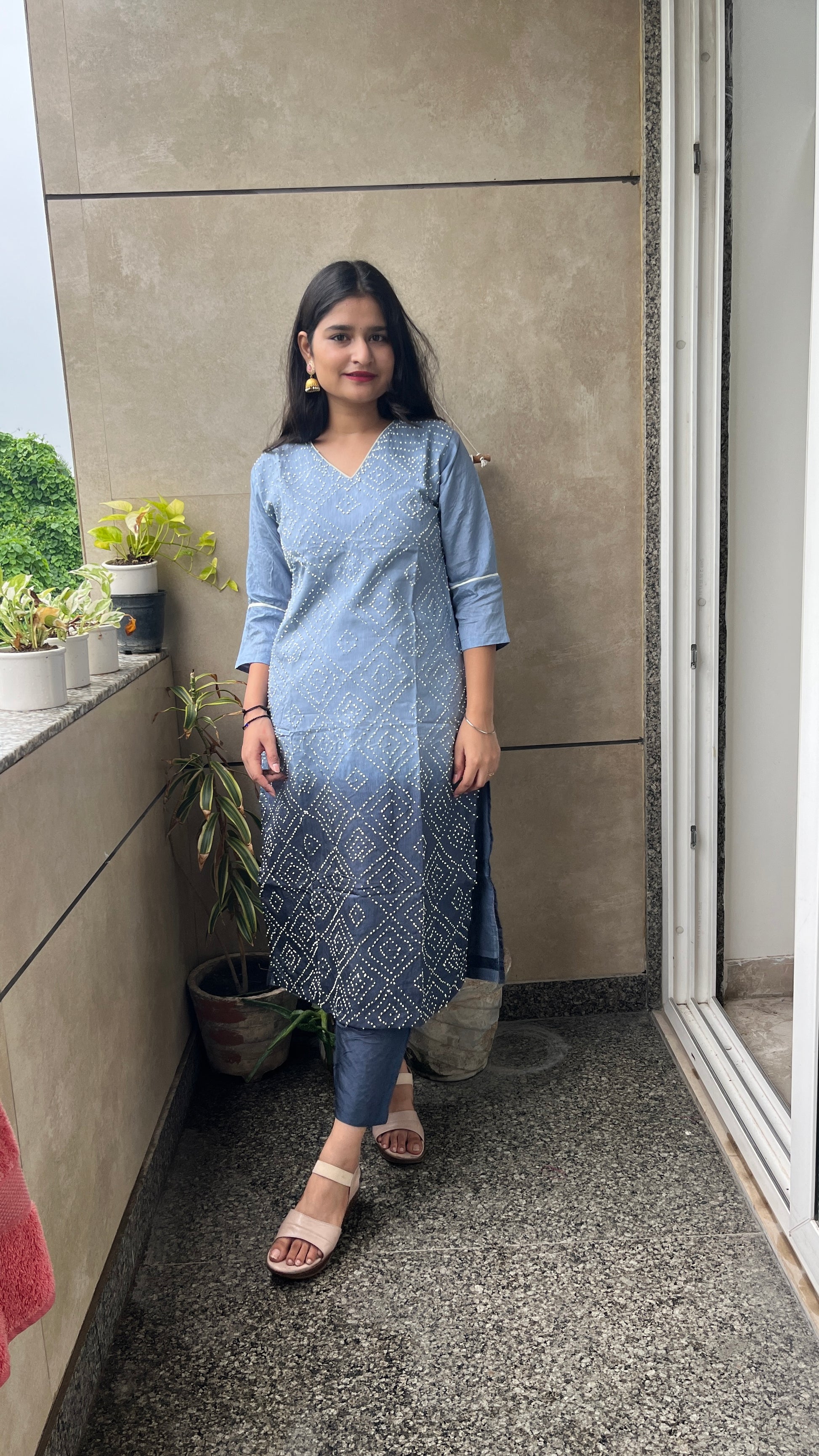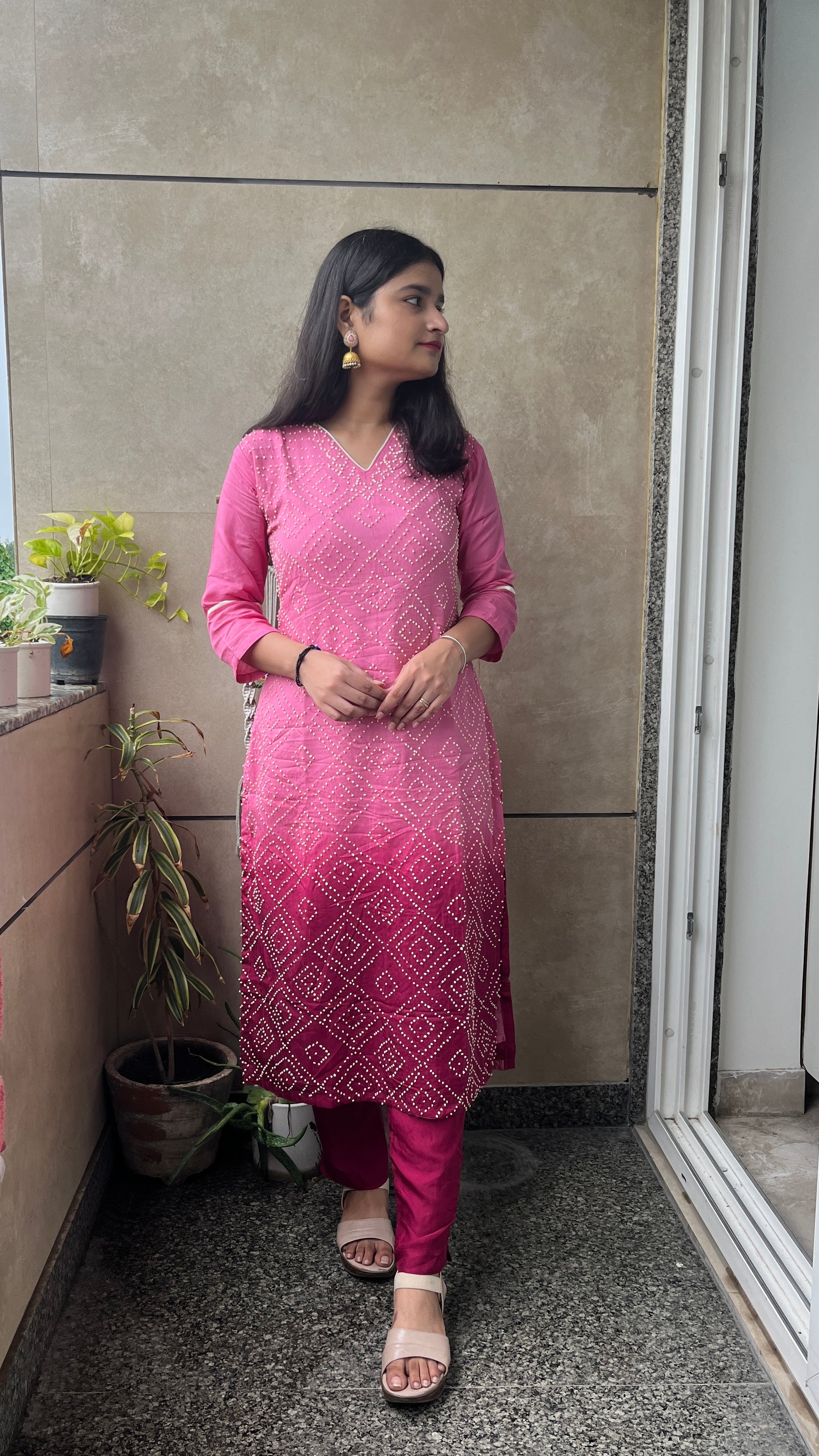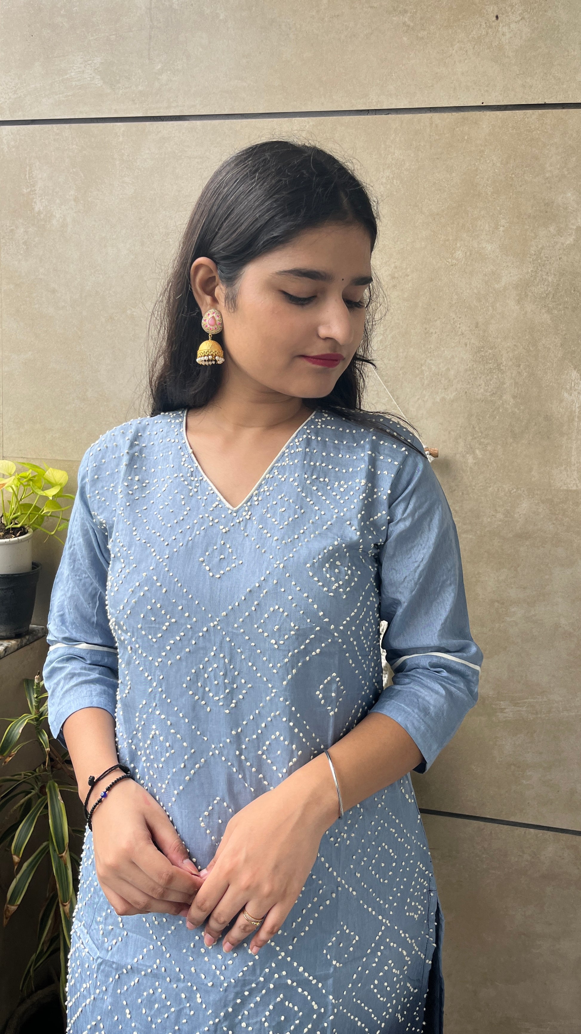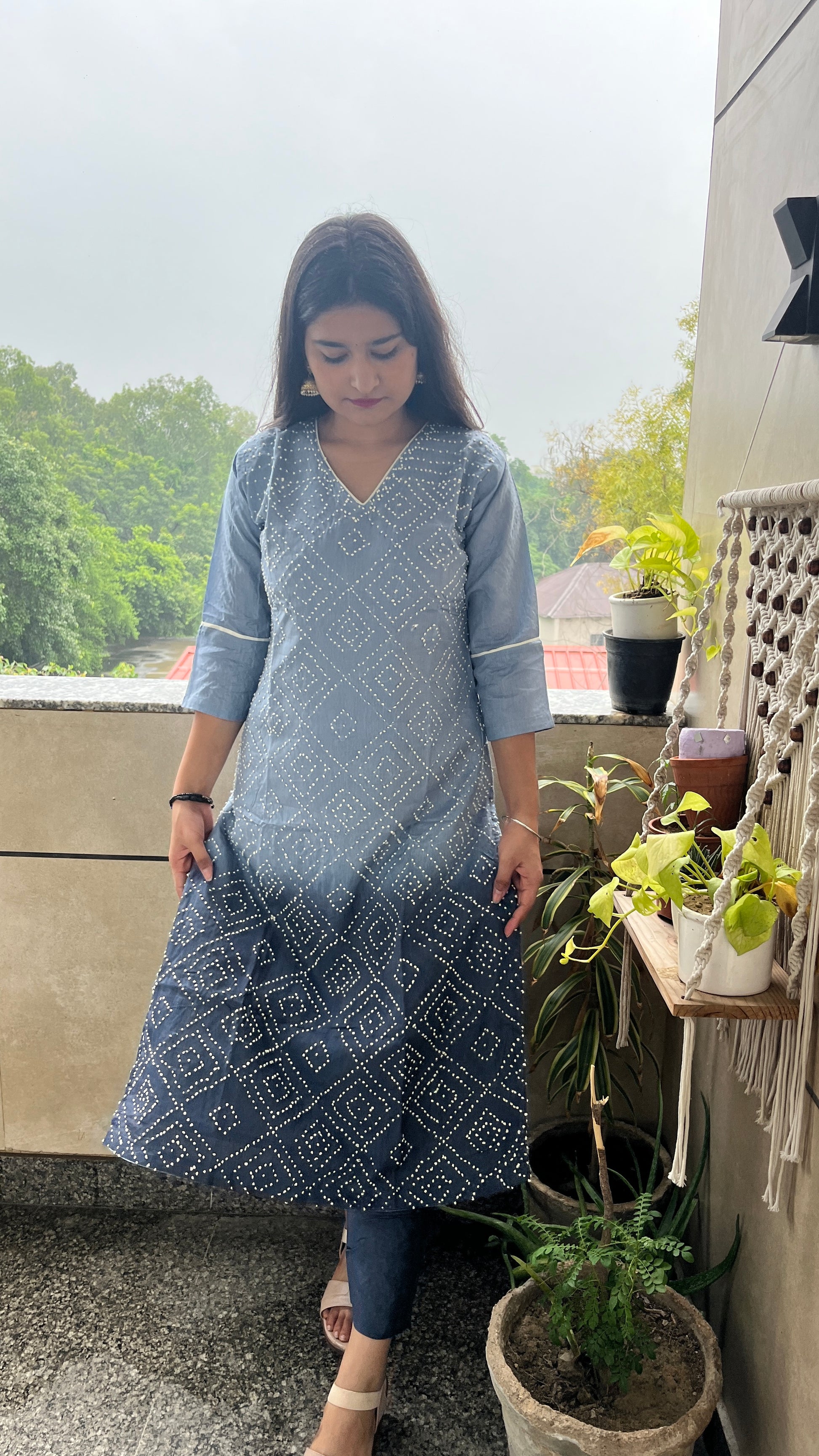 - The highlight of the ensemble is the intricate hand embroidery, which mimics the appearance of traditional bandhani print with meticulously placed dotted patterns.