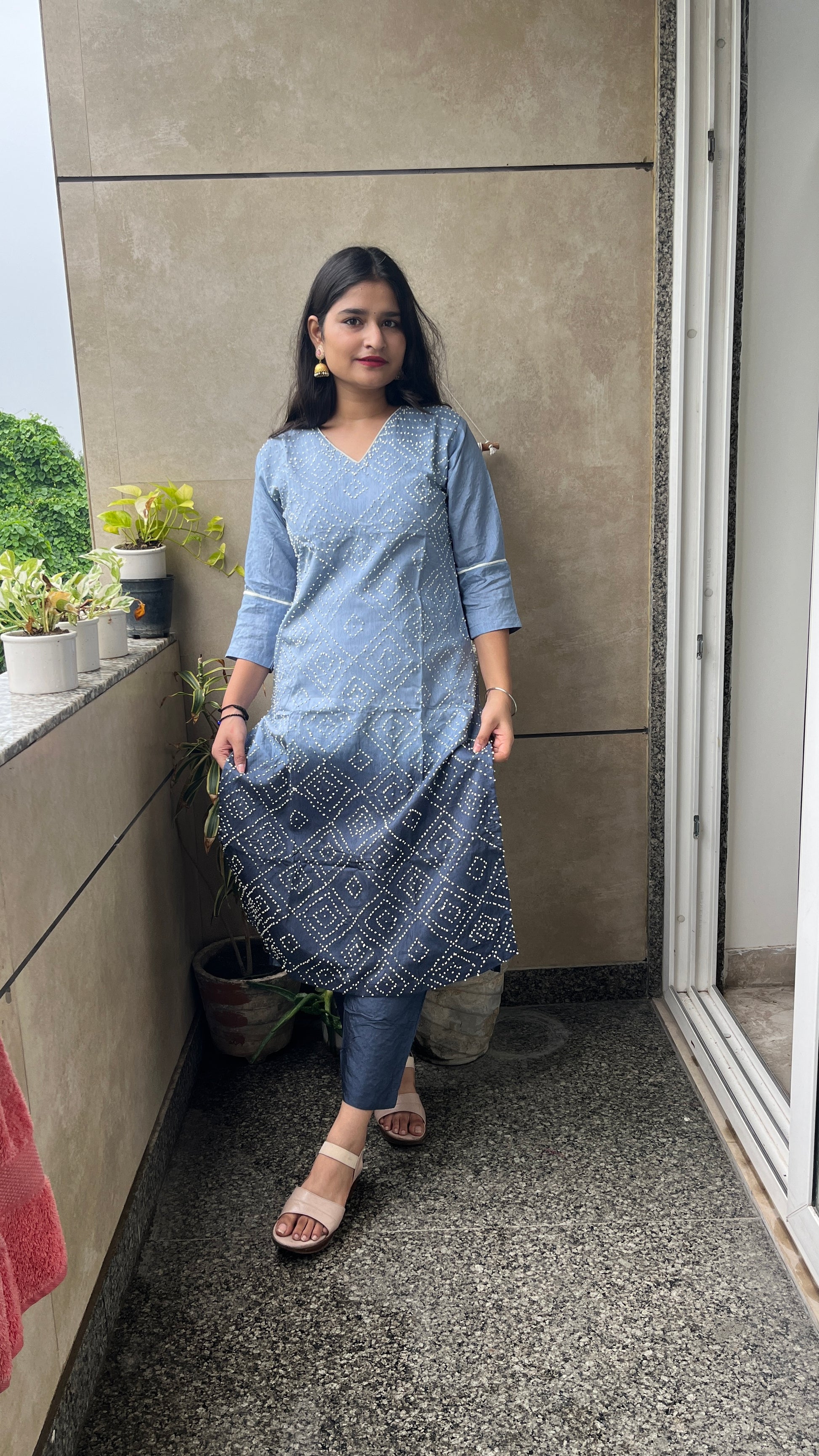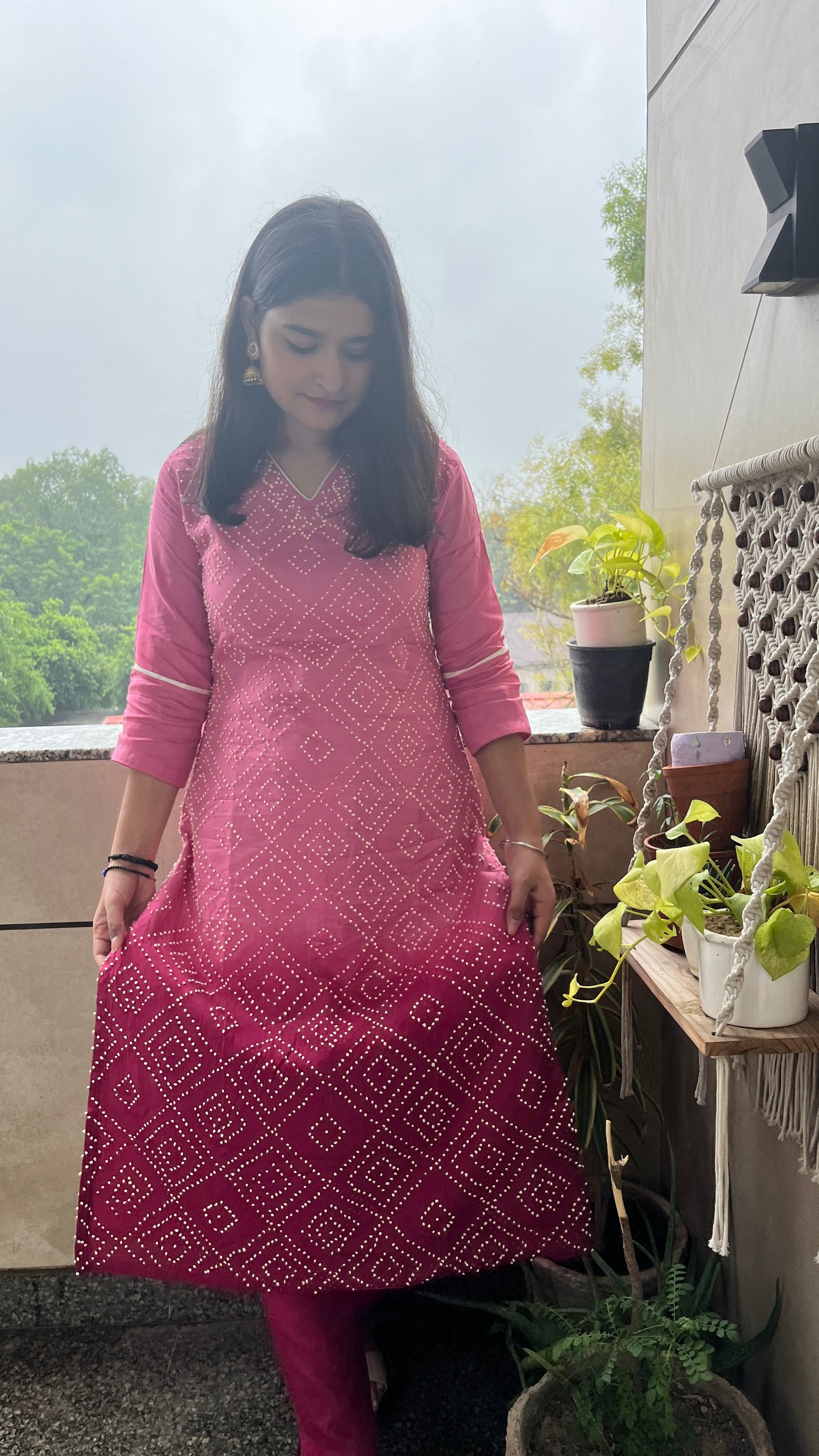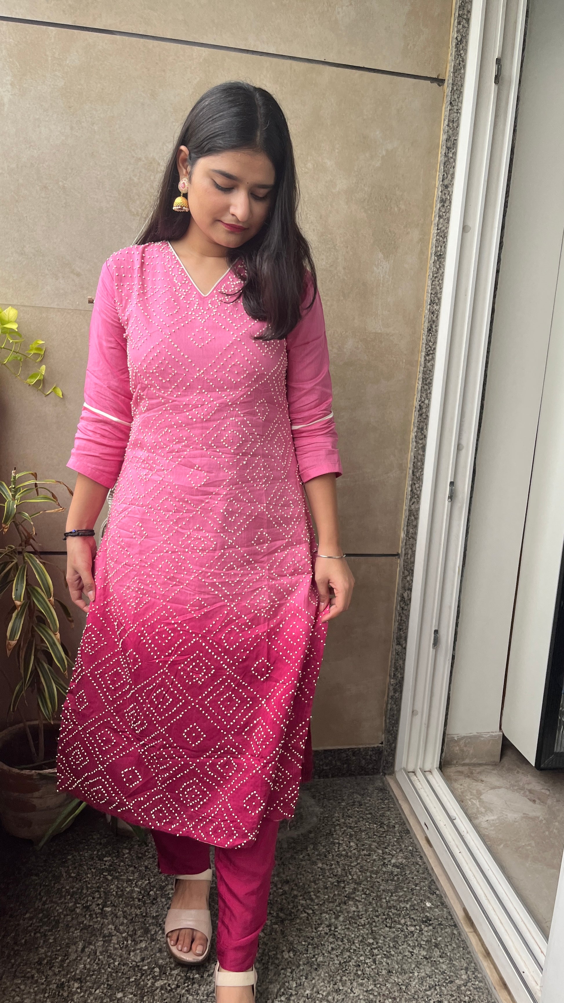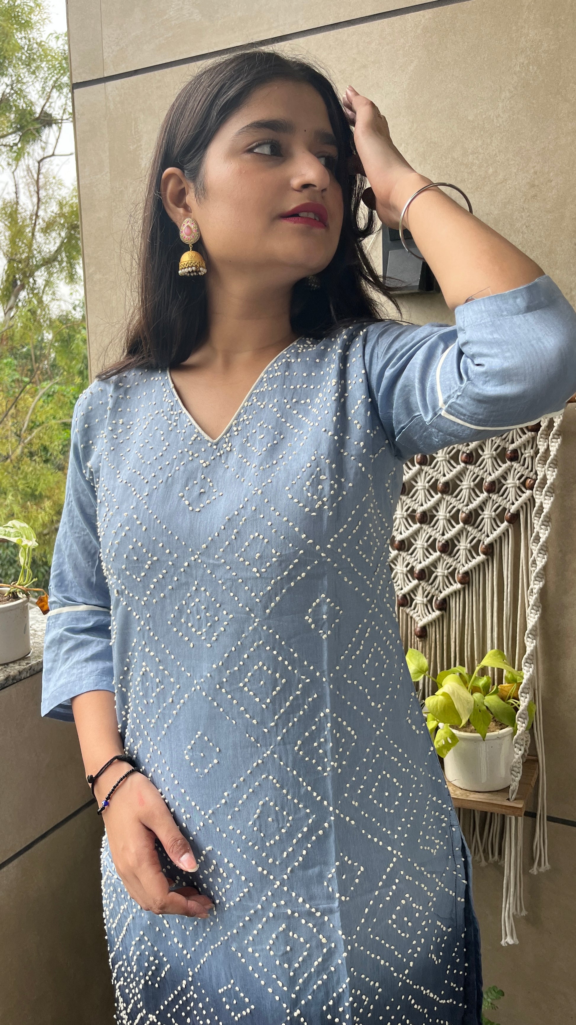 - The highlight of the ensemble is the intricate hand embroidery, which mimics the appearance of traditional bandhani print with meticulously placed dotted patterns.