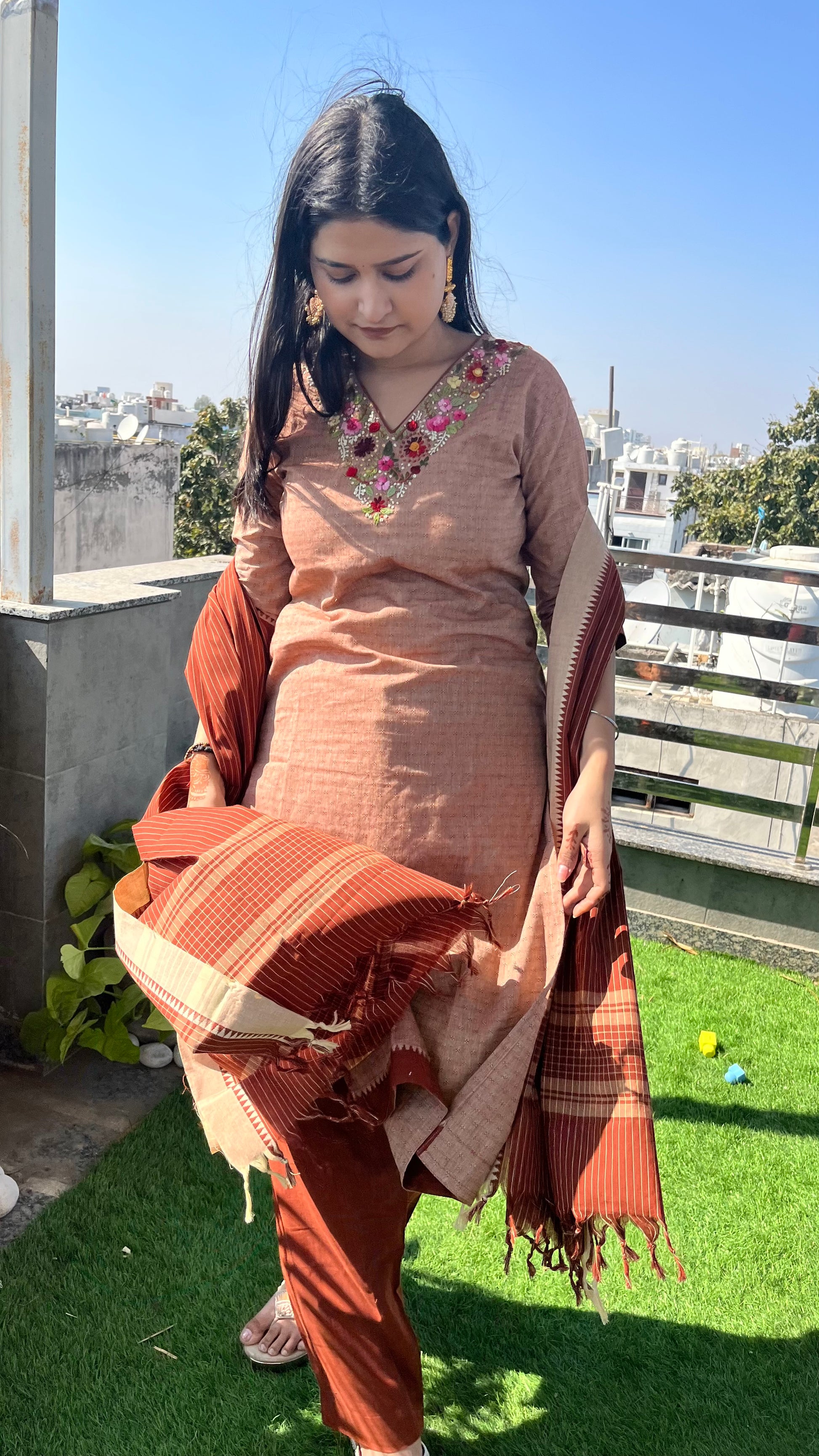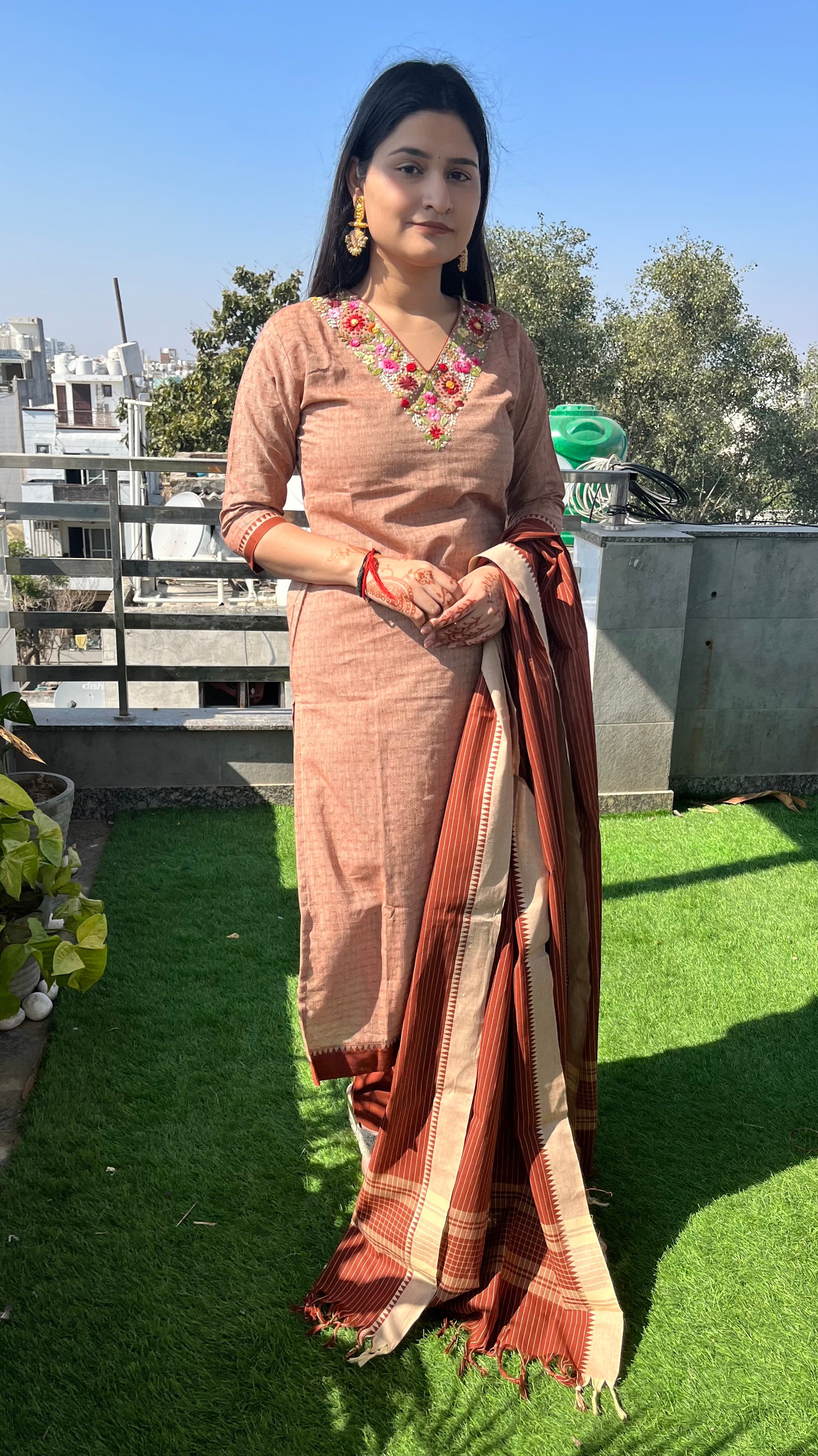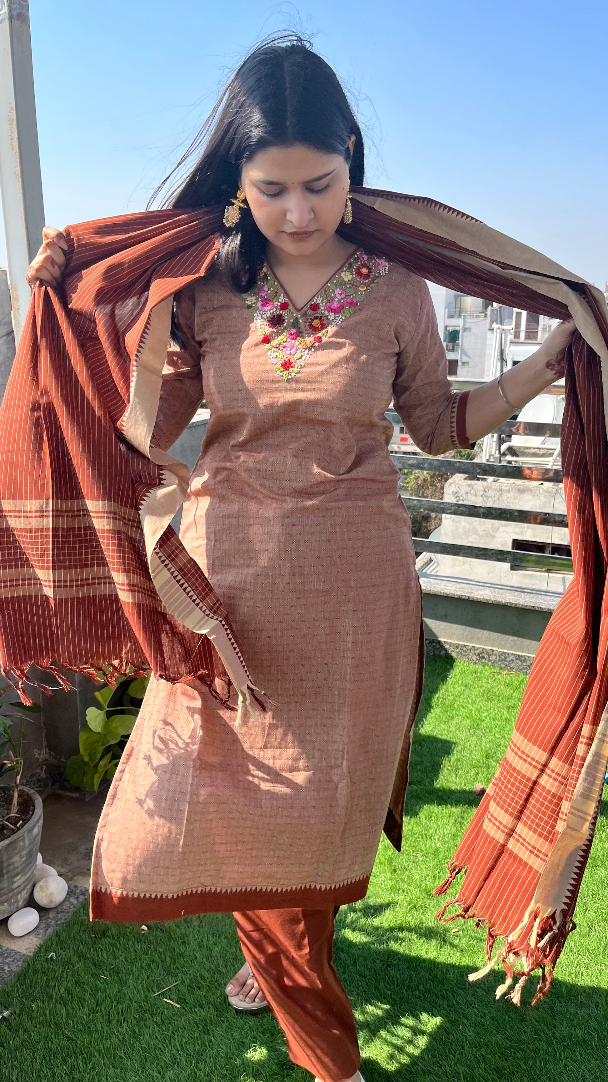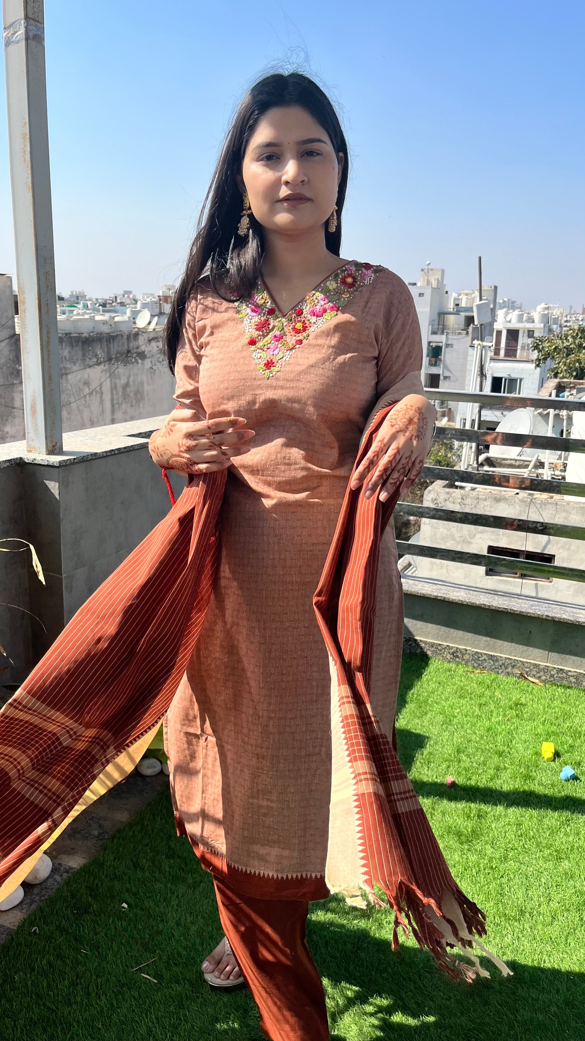 This elegant suit is crafted from premium handloom fabric, ensuring a soft, breathable, and eco-friendly wear.