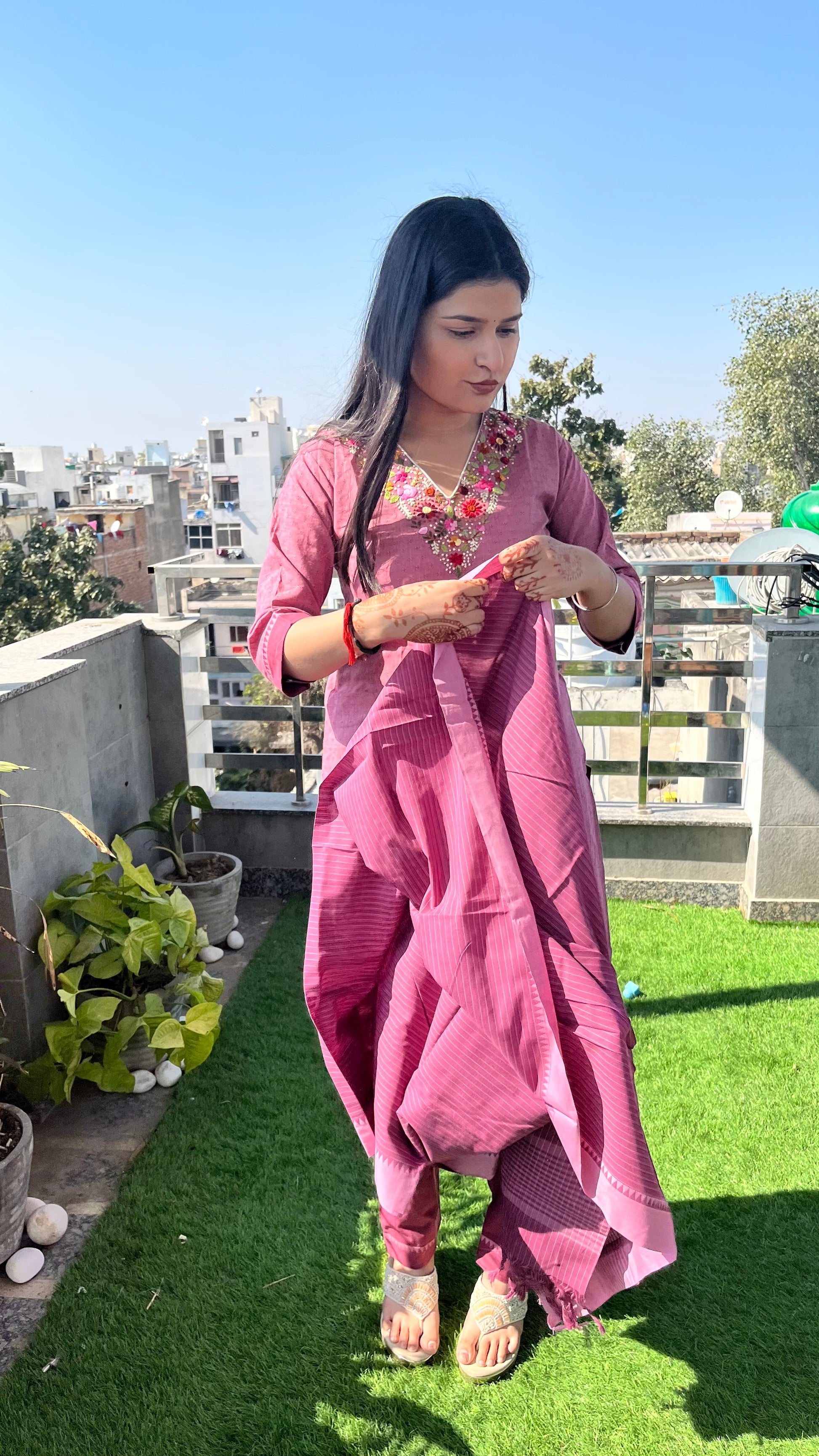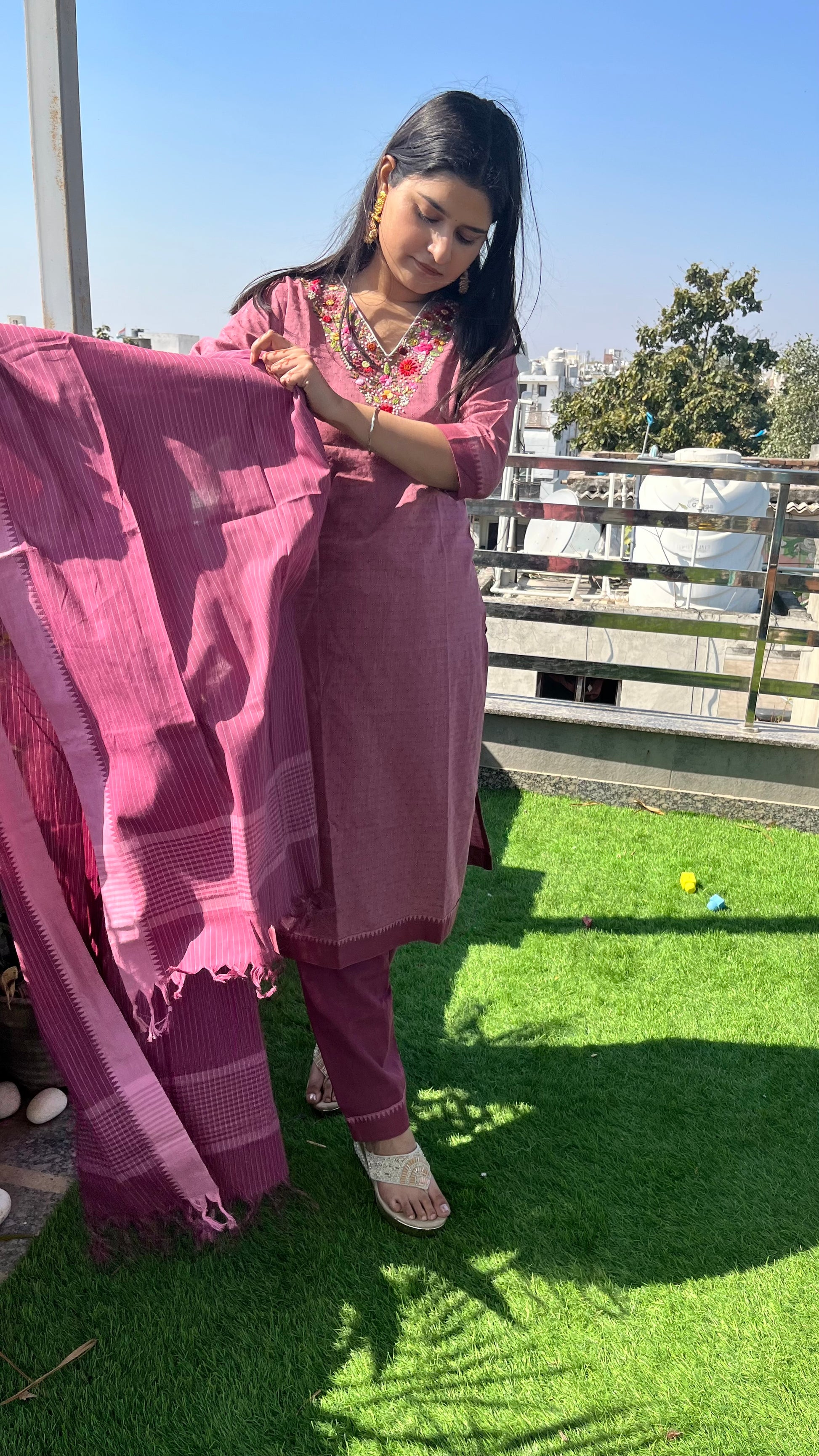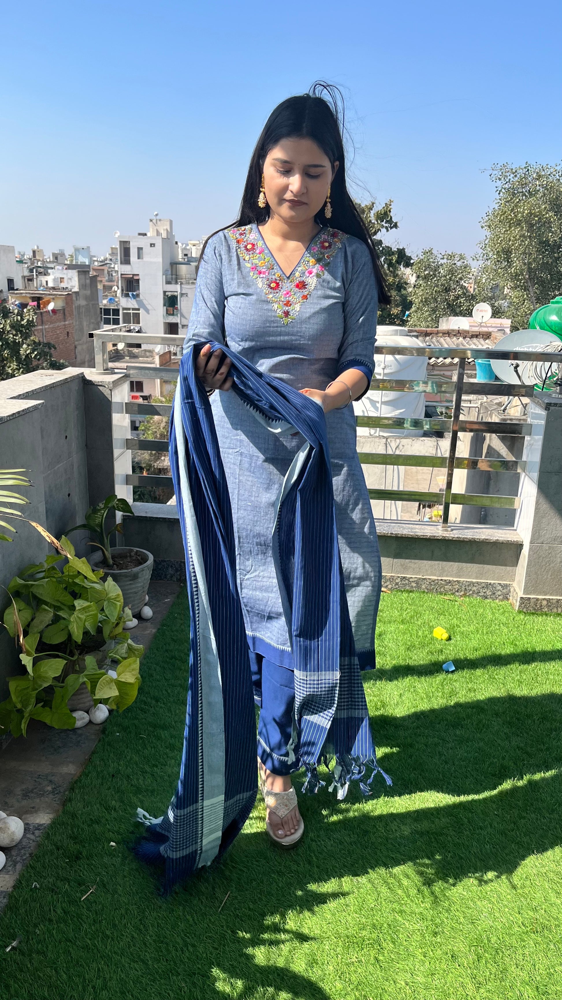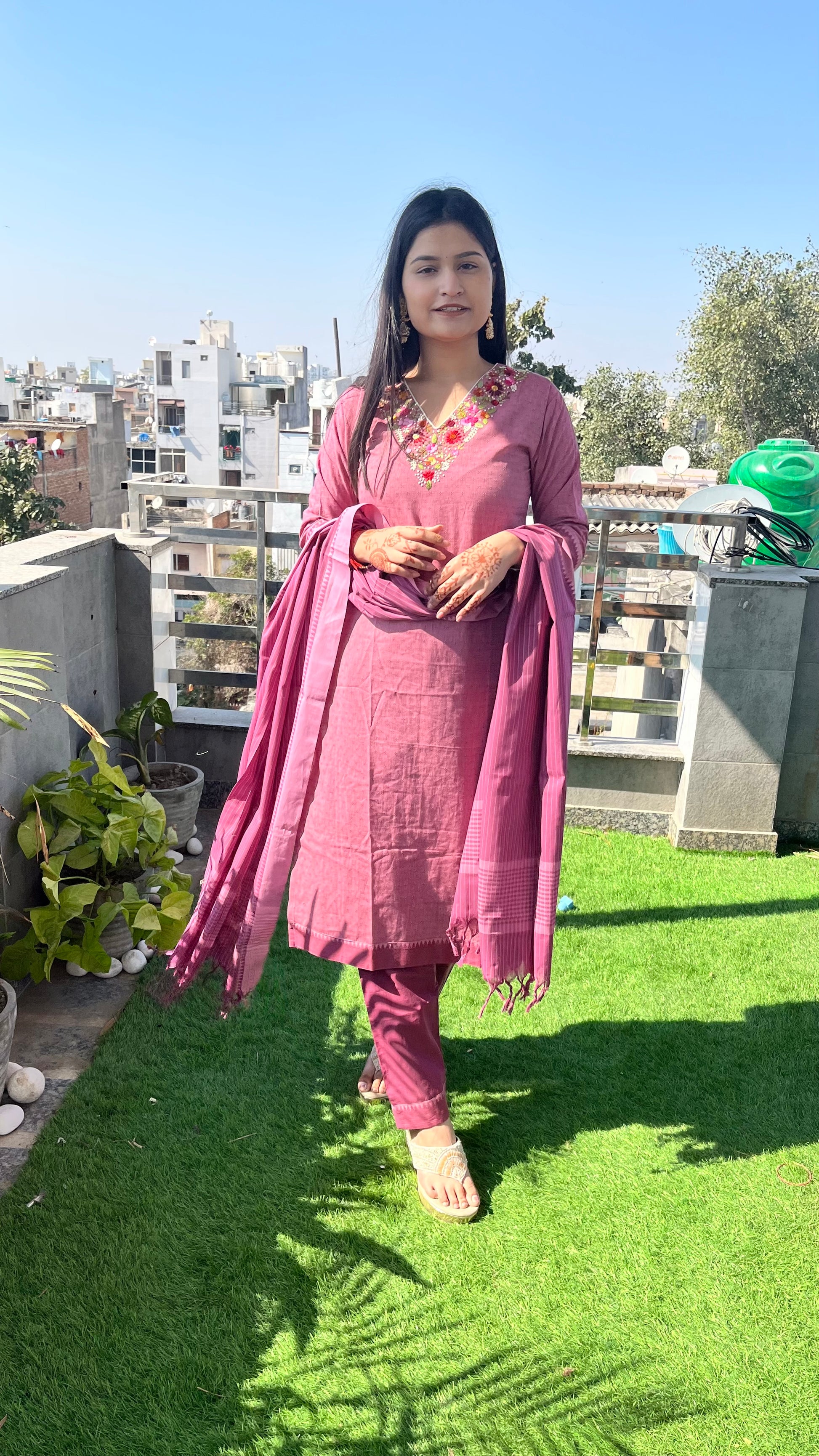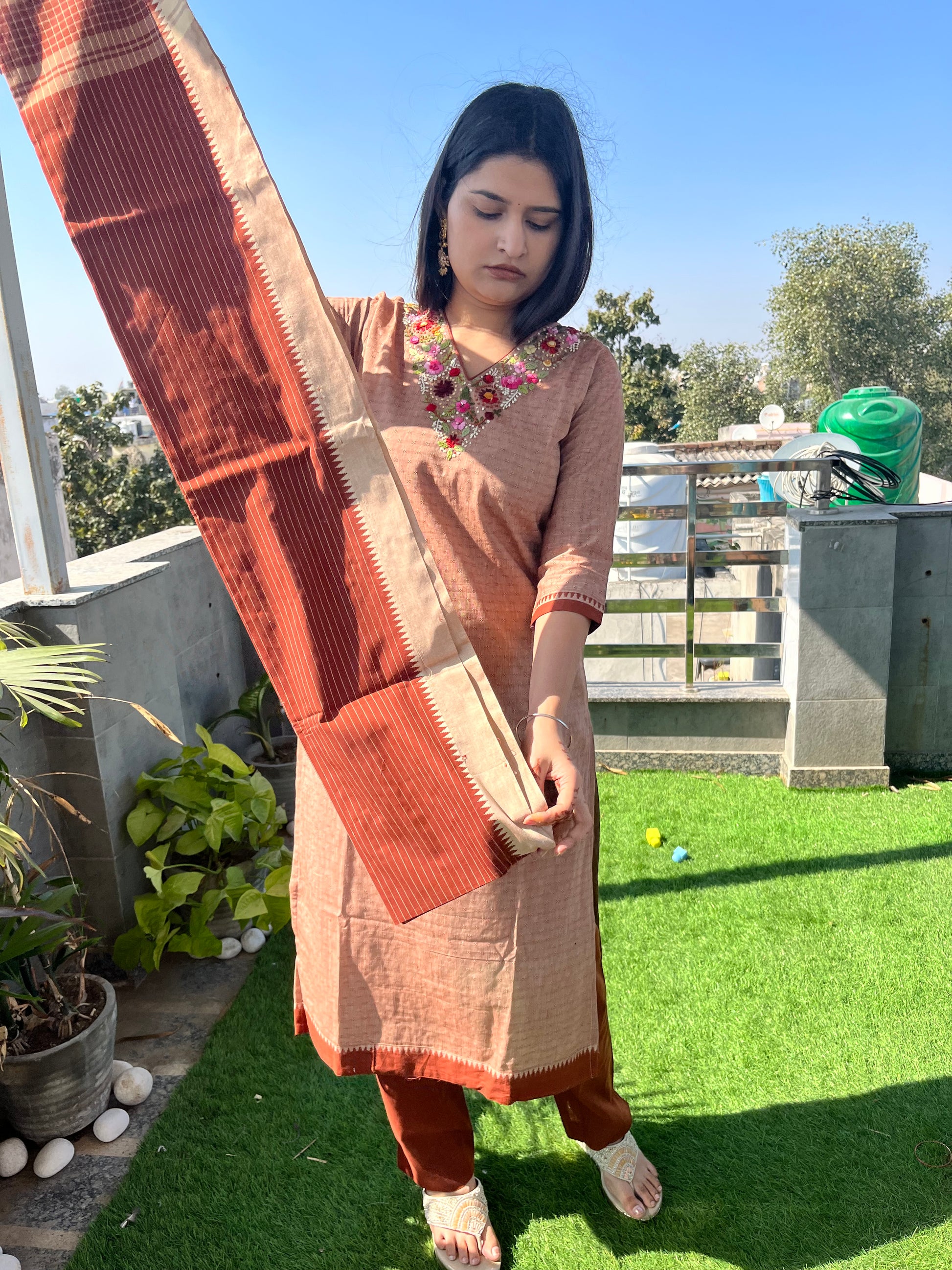This elegant suit is crafted from premium handloom fabric, ensuring a soft, breathable, and eco-friendly wear.