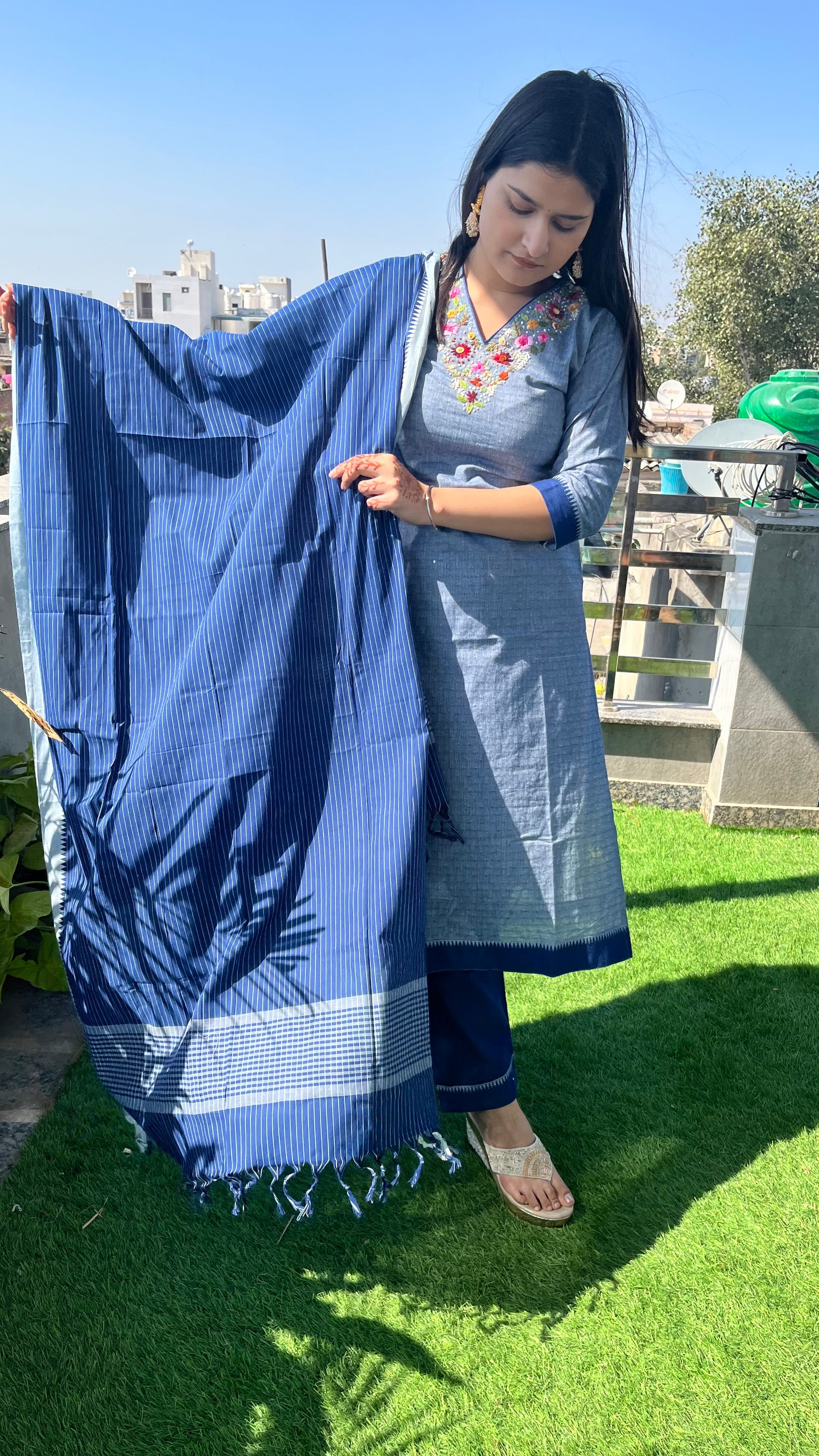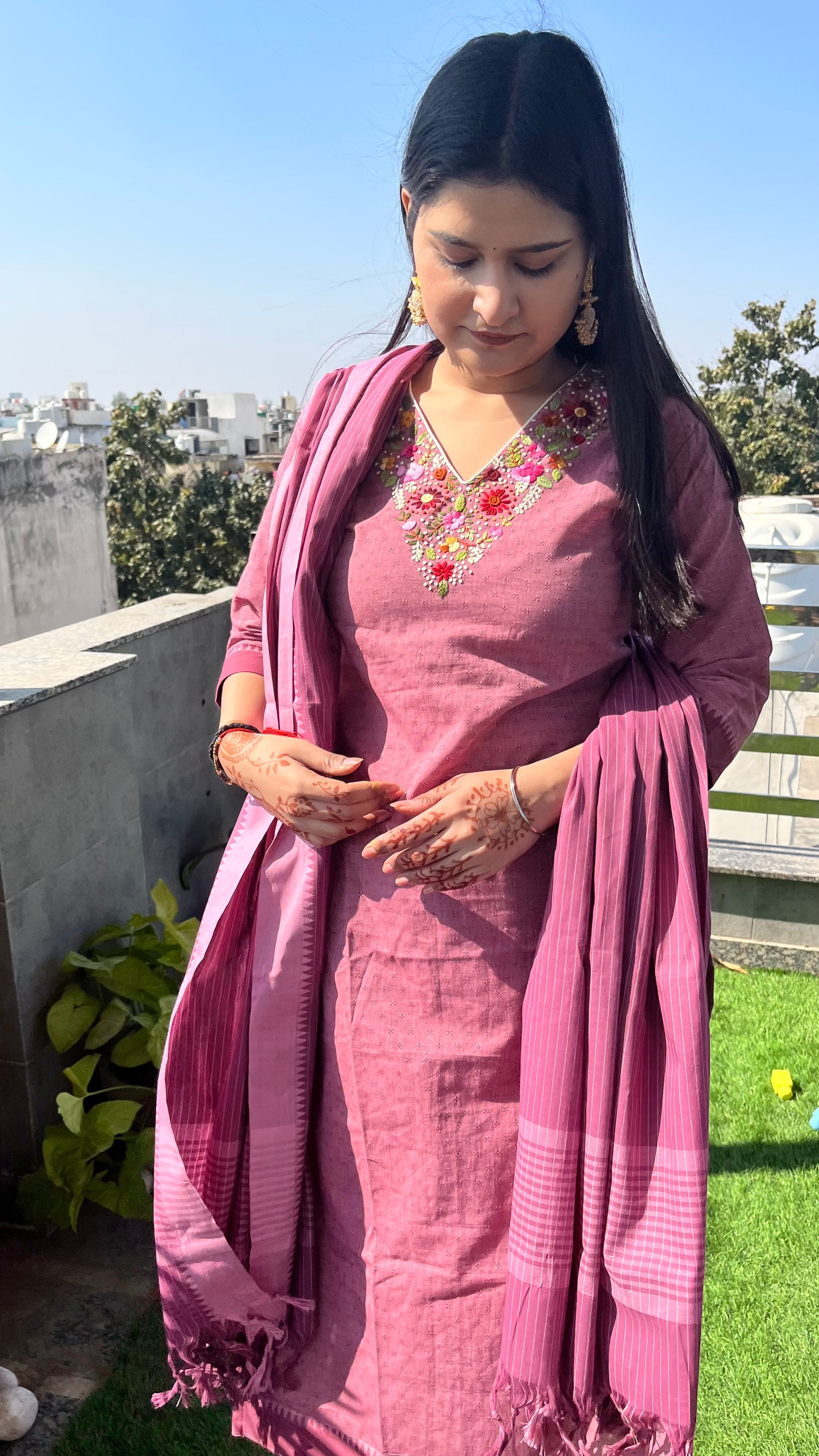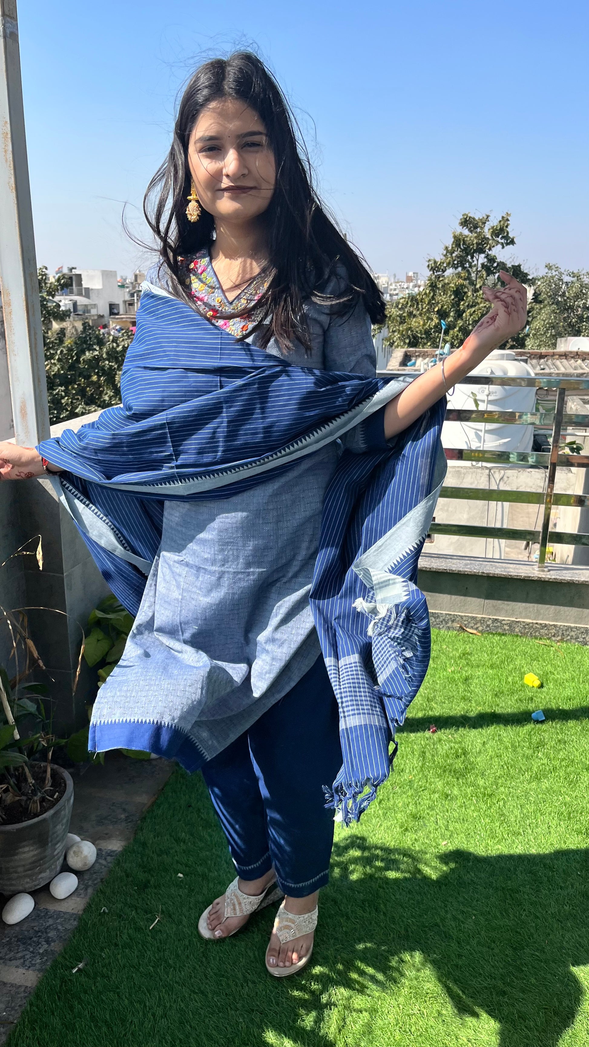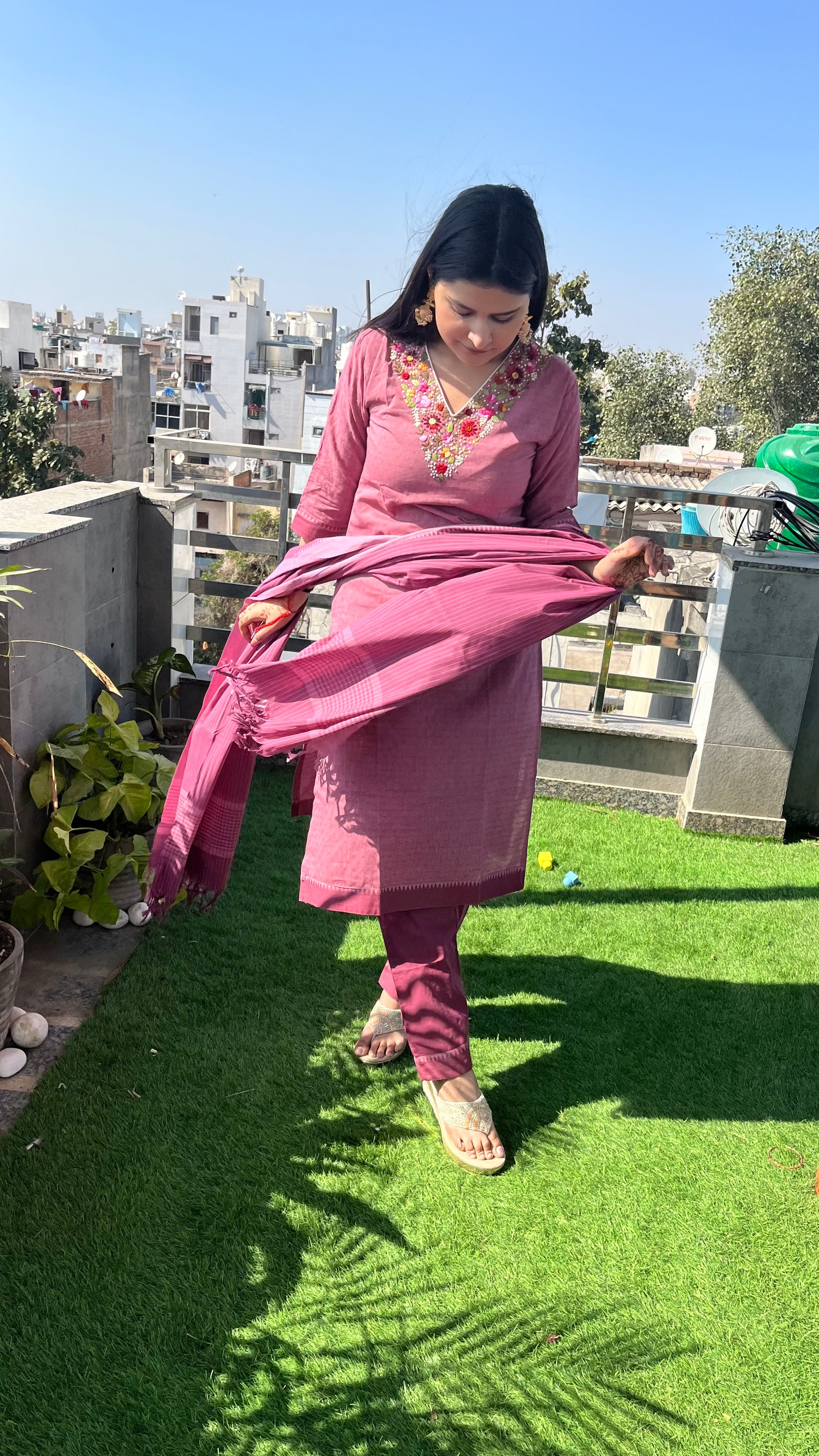 This elegant suit is crafted from premium handloom fabric, ensuring a soft, breathable, and eco-friendly wear.