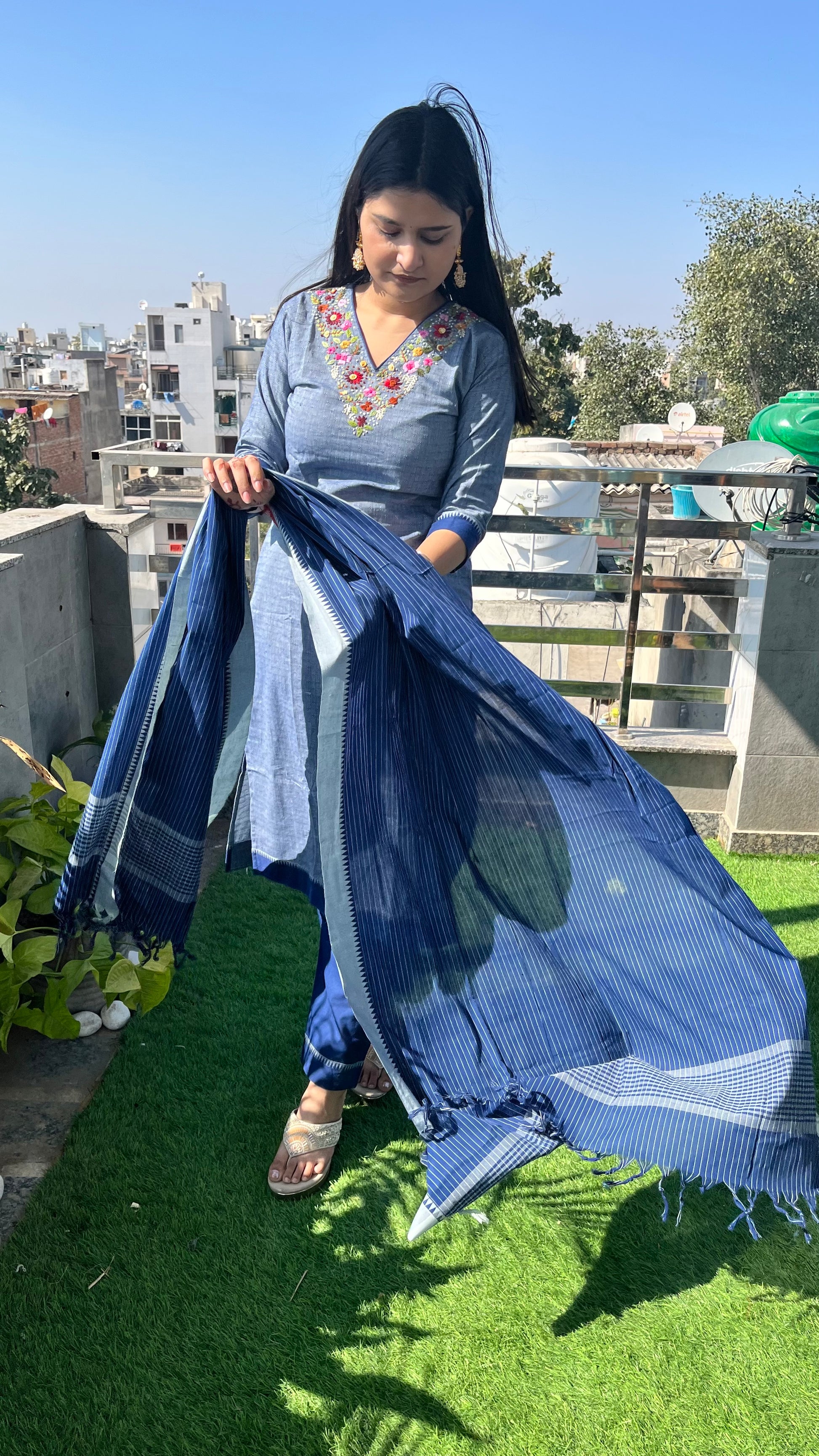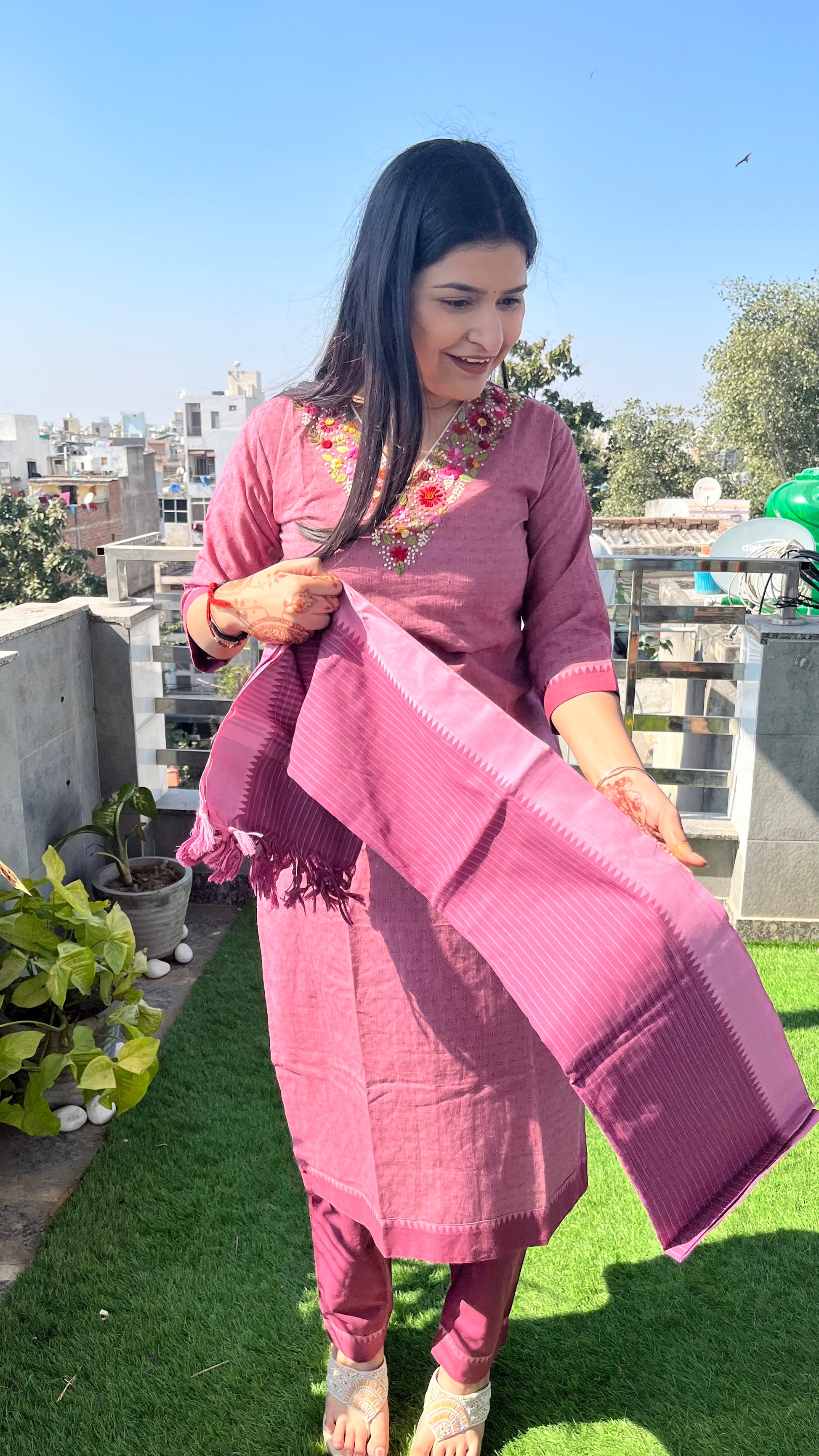 The contrast dupatta, adorned with fine stripes and a delicate border, complements the outfit beautifully.
