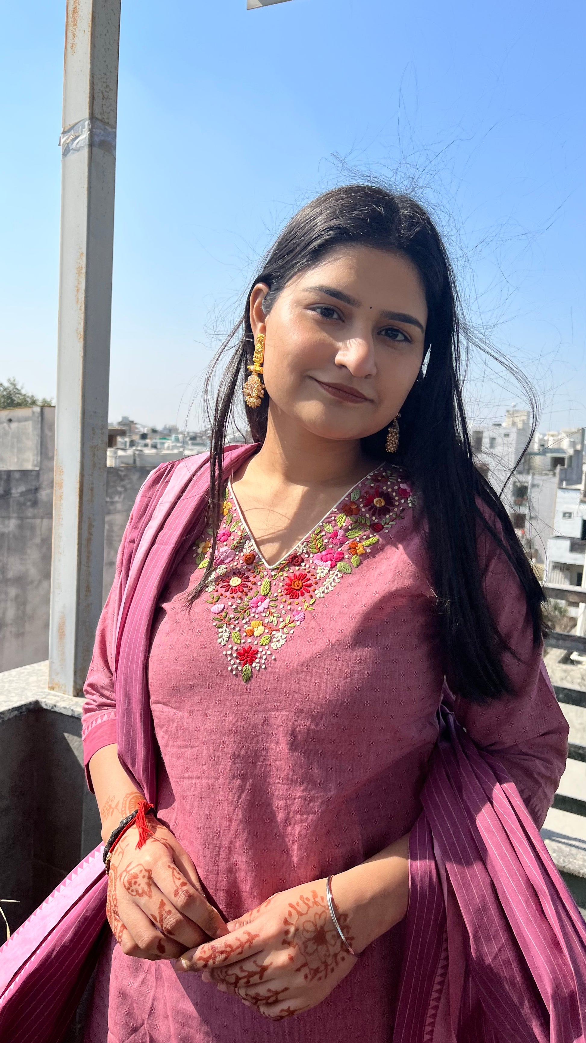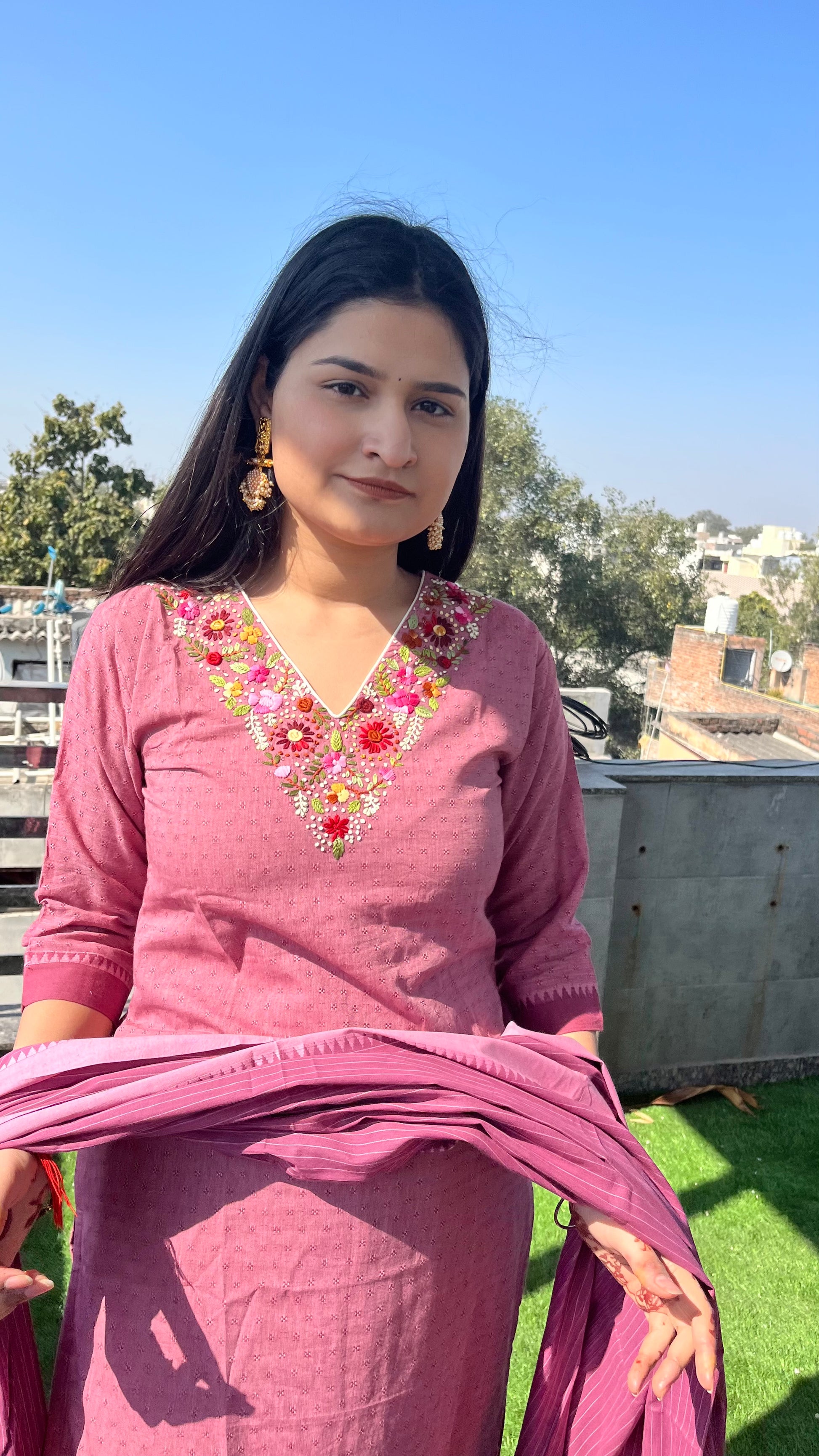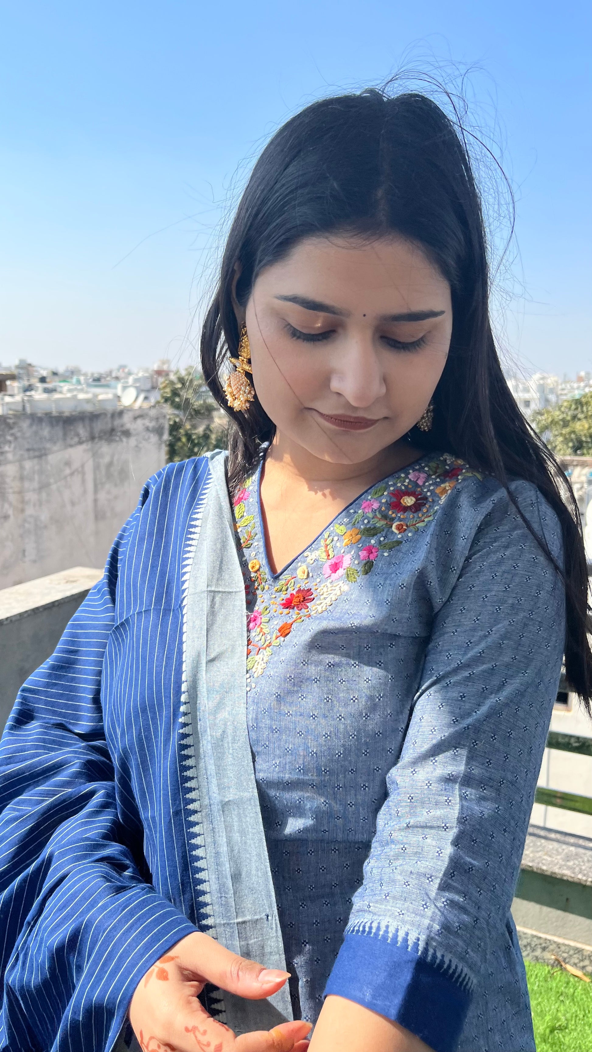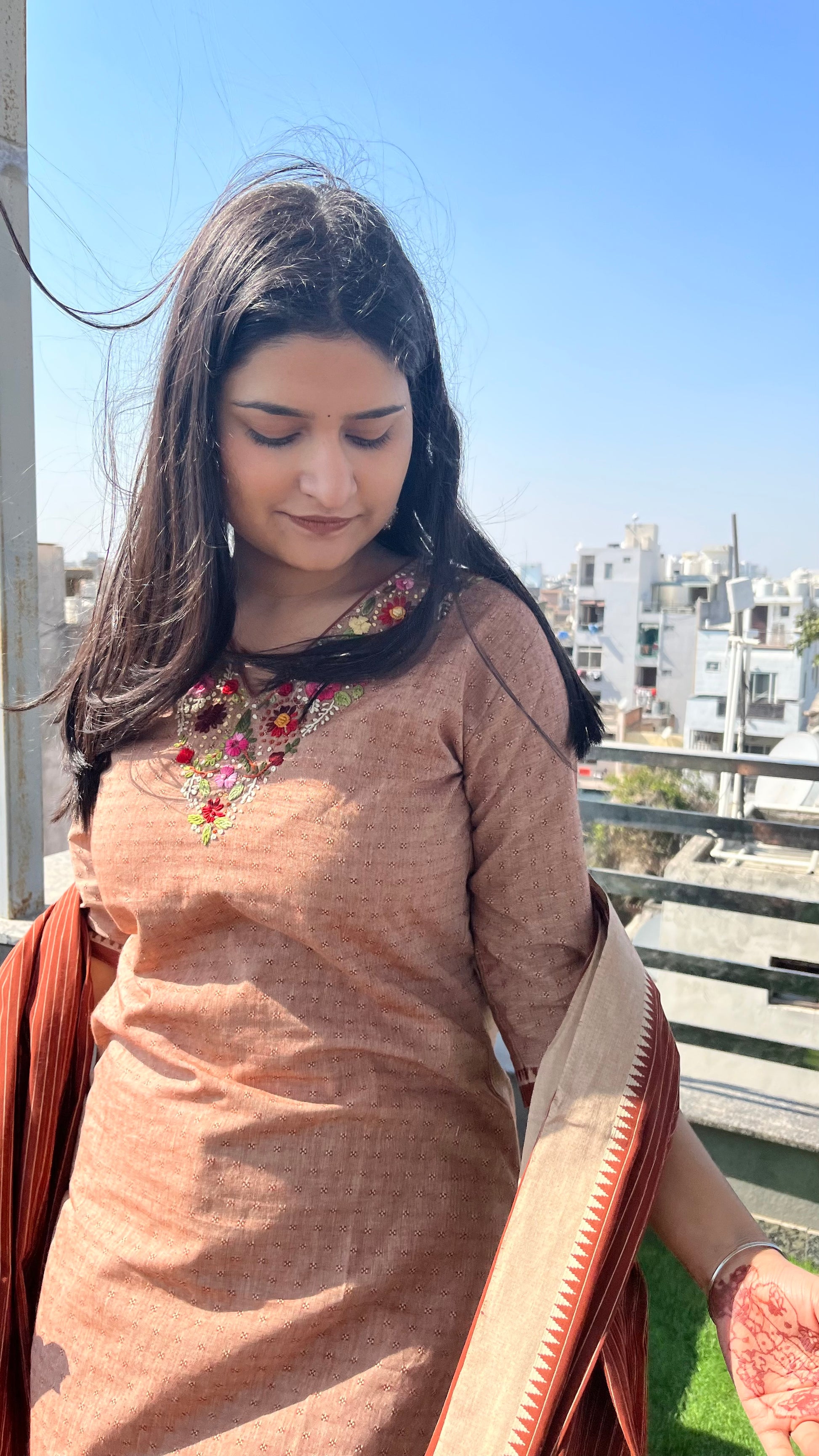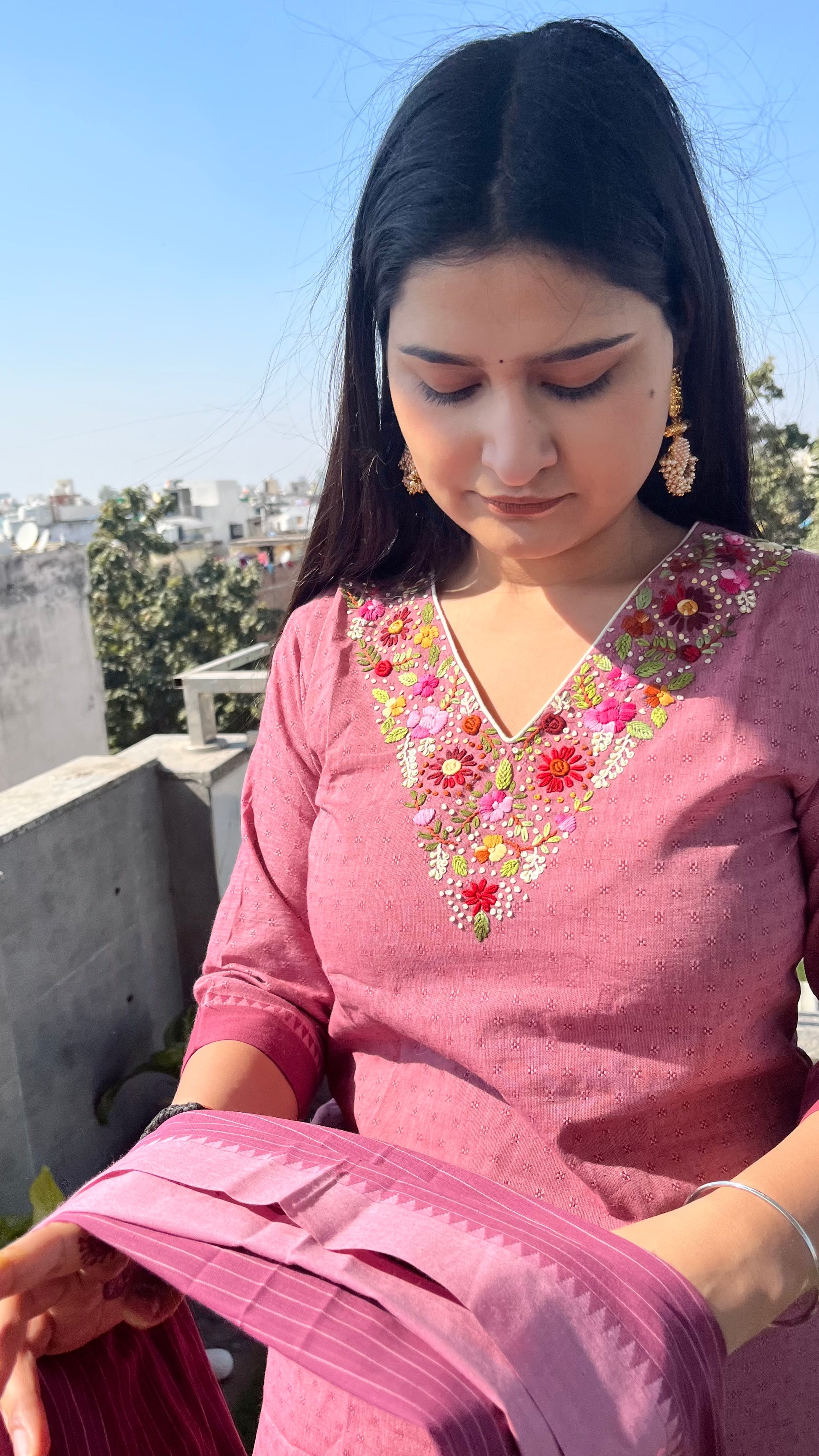 The hand-embroidered detailing on the neckline adds a delicate charm, showcasing intricate craftsmanship.