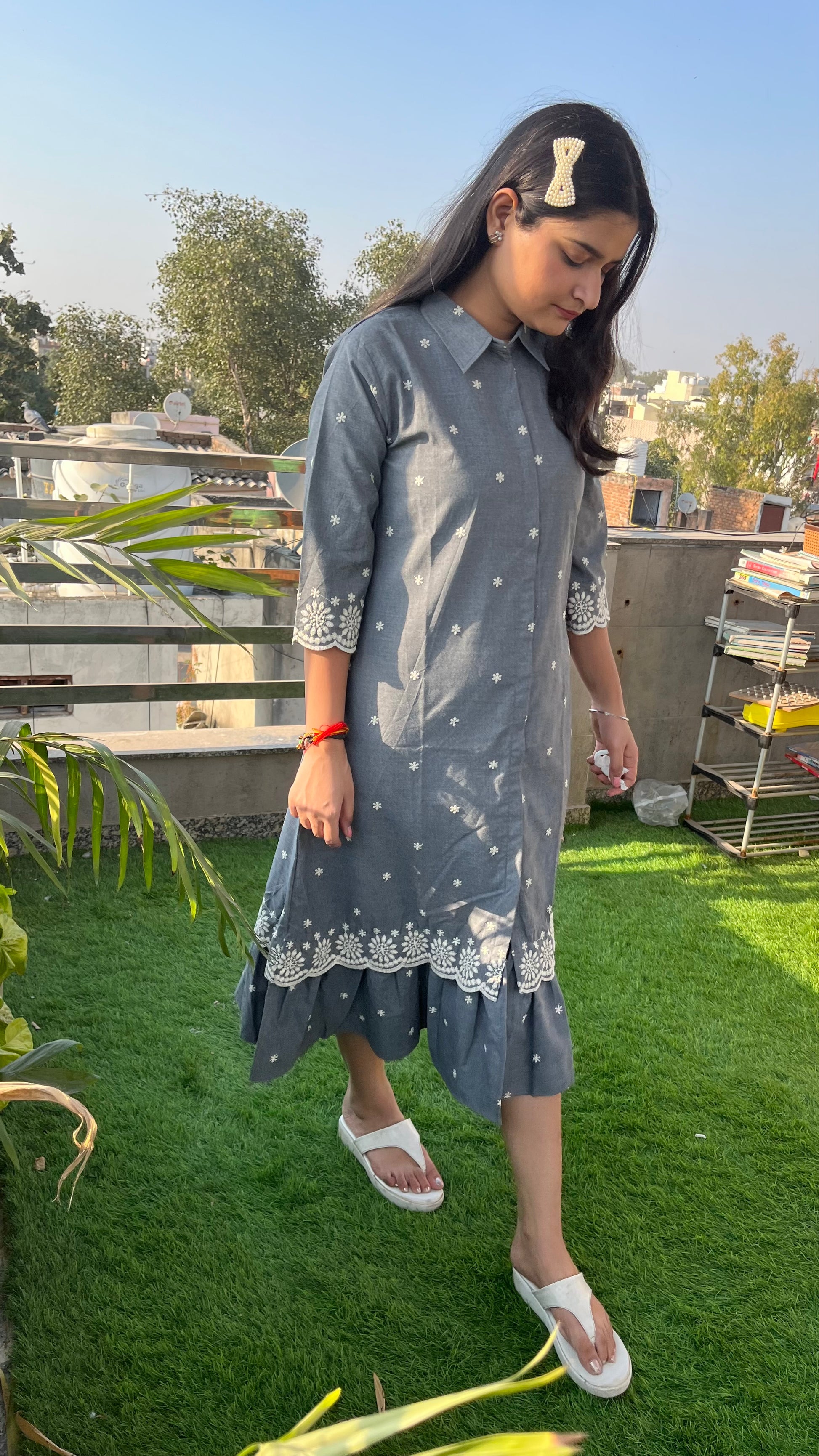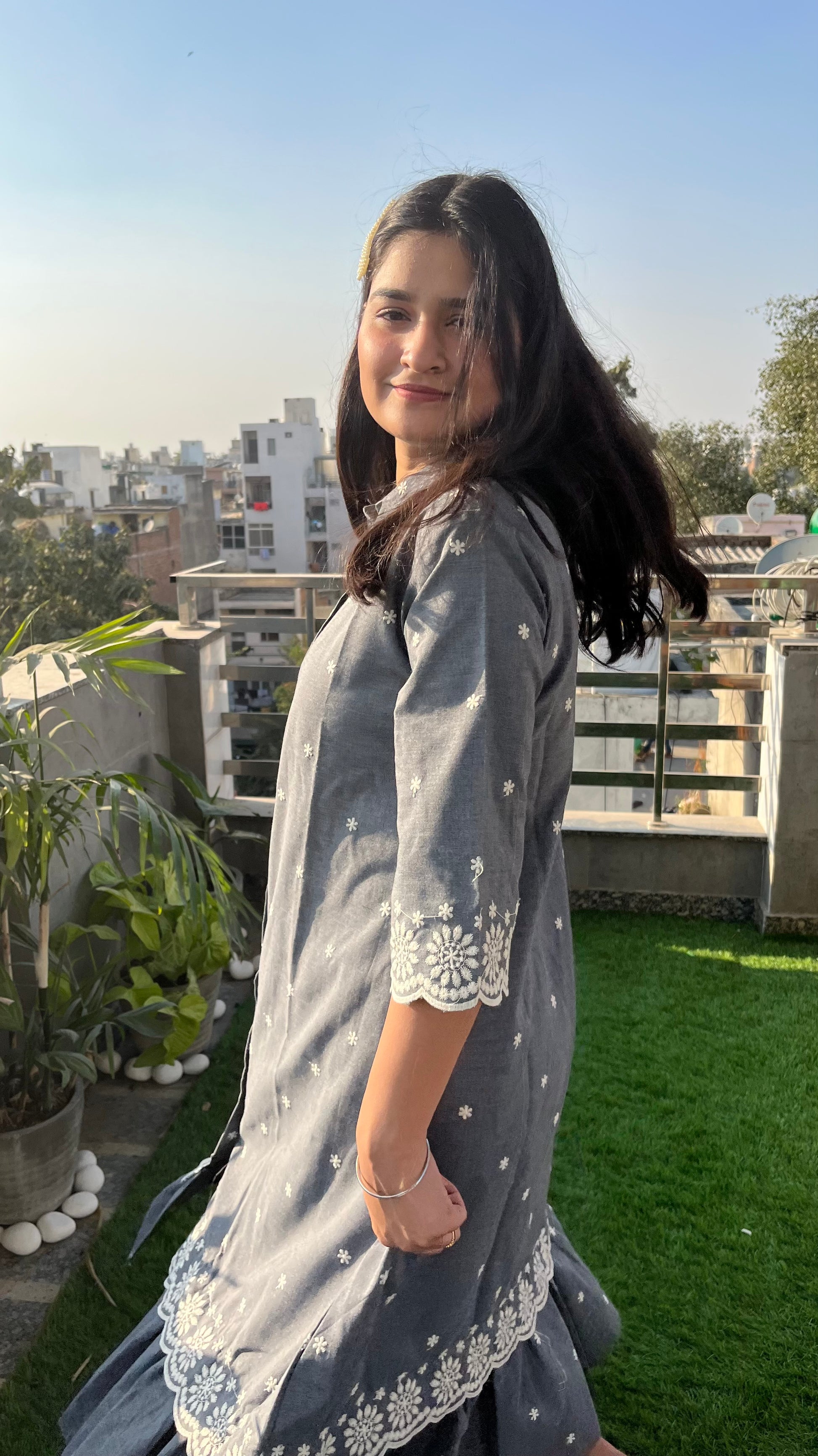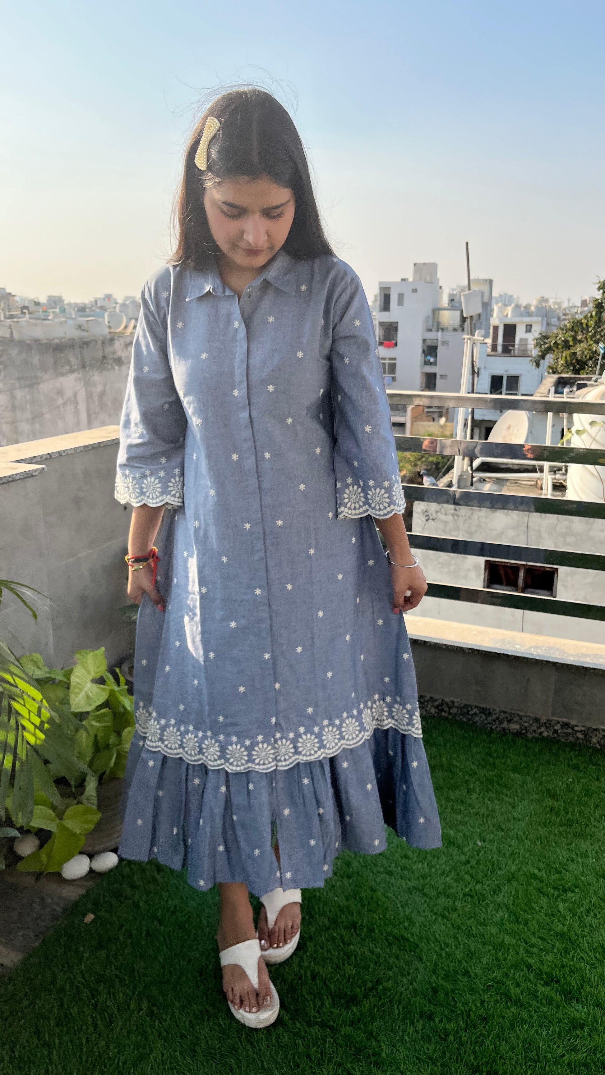 The dress features chikankari embroidery with very beautiful flared pattern in the end