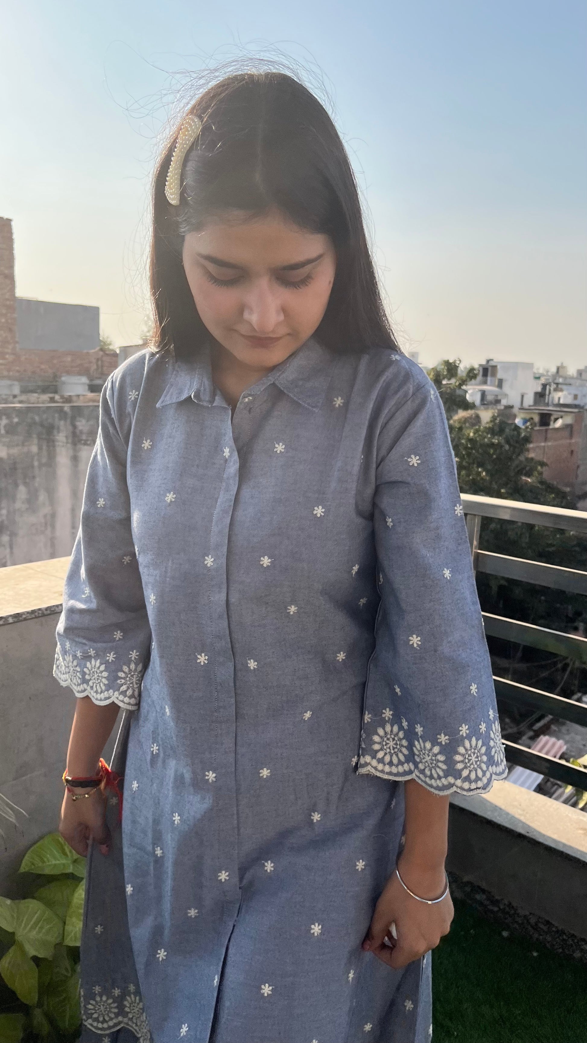 This piece is crafted from pure handloom fabric, offering the chic look of denim while maintaining the softness and breathability of handwoven textiles.