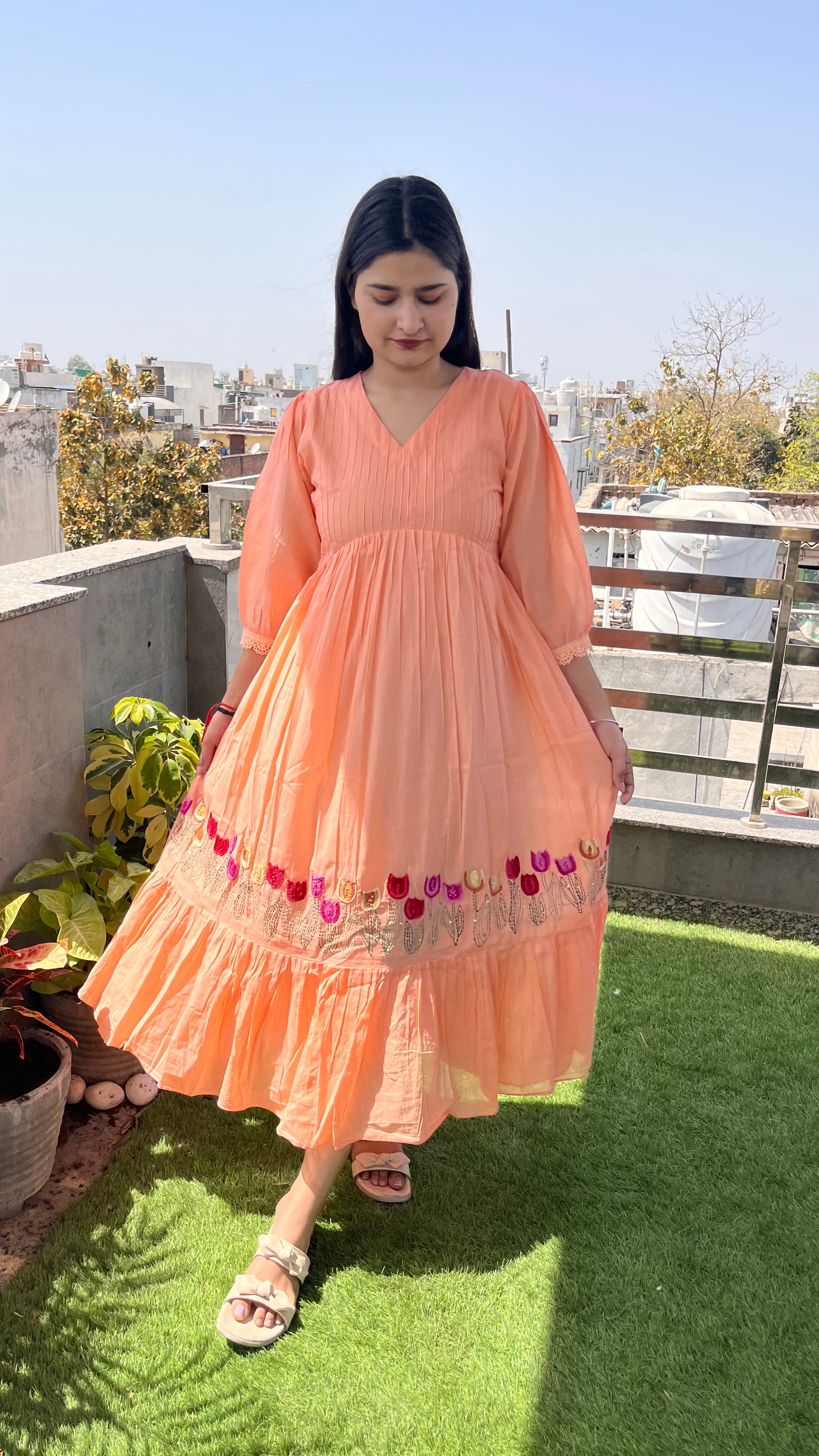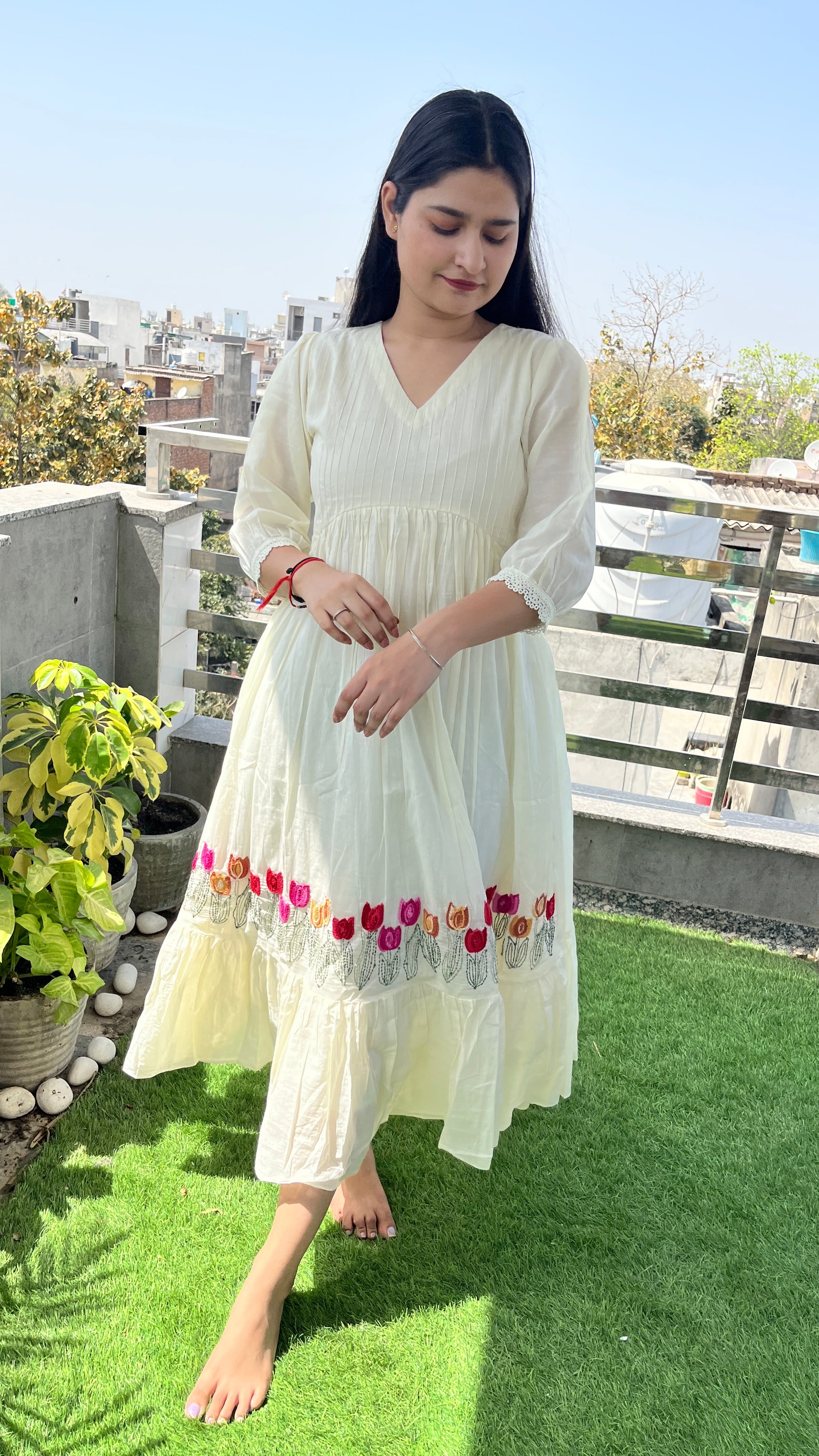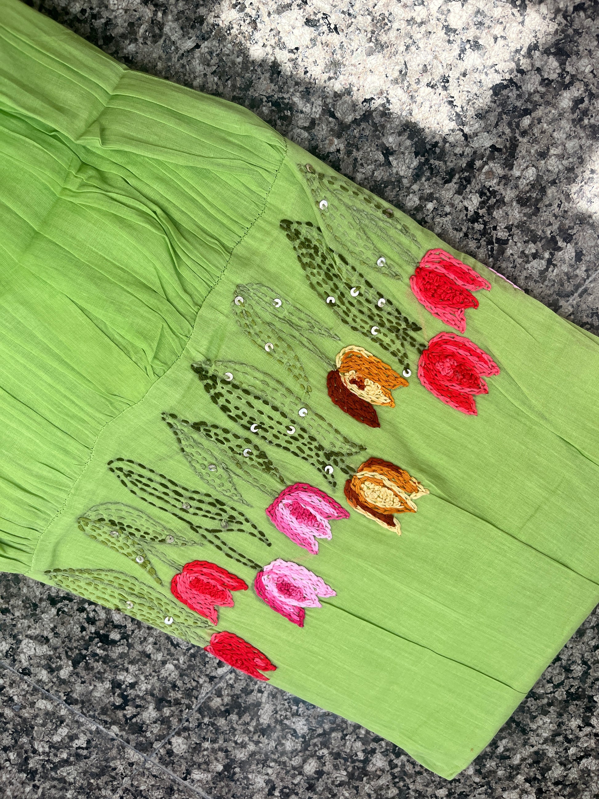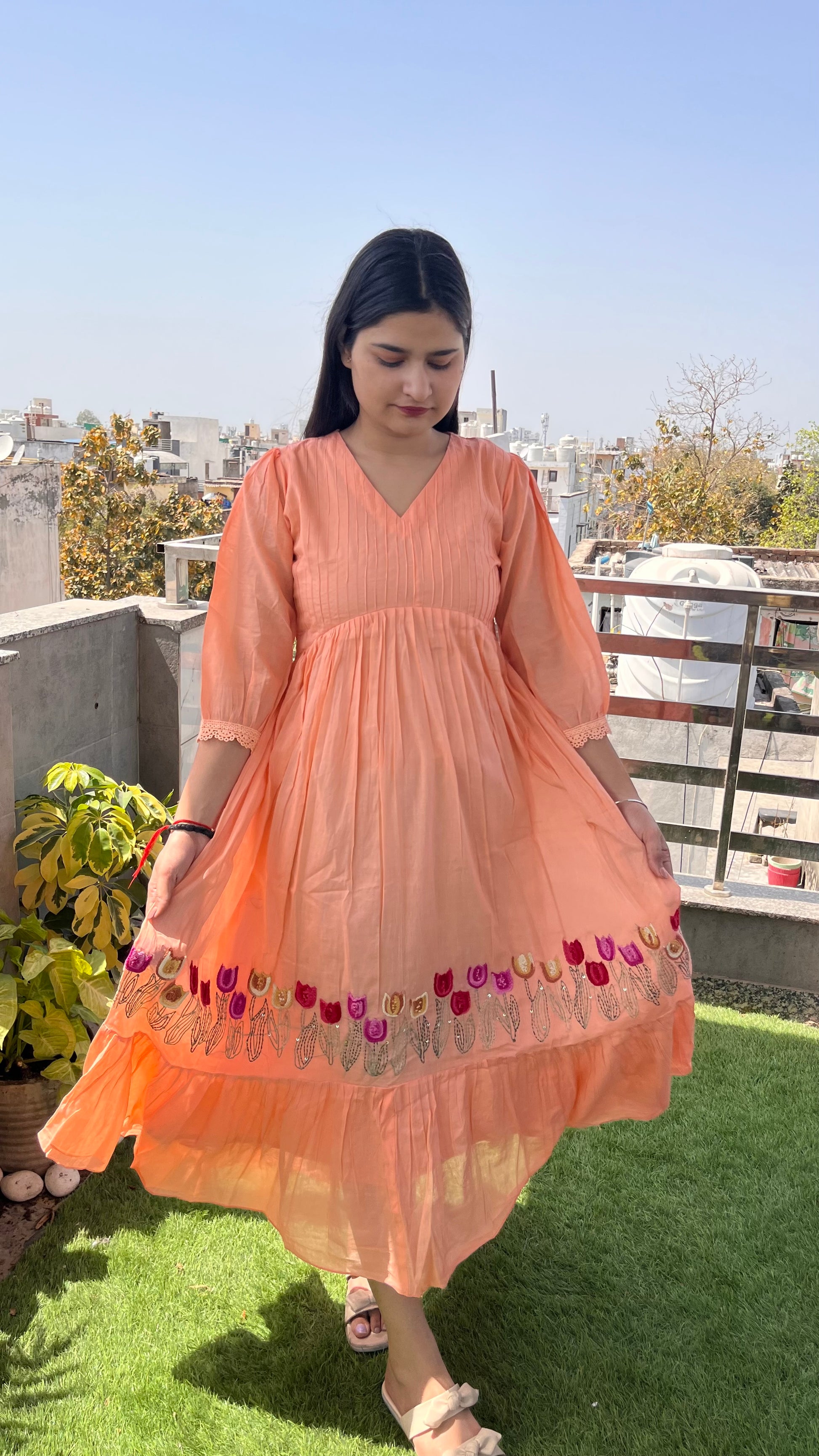 - The exquisite hand embroidery at the hem, complemented by a charming frill pattern, enhances its appeal.