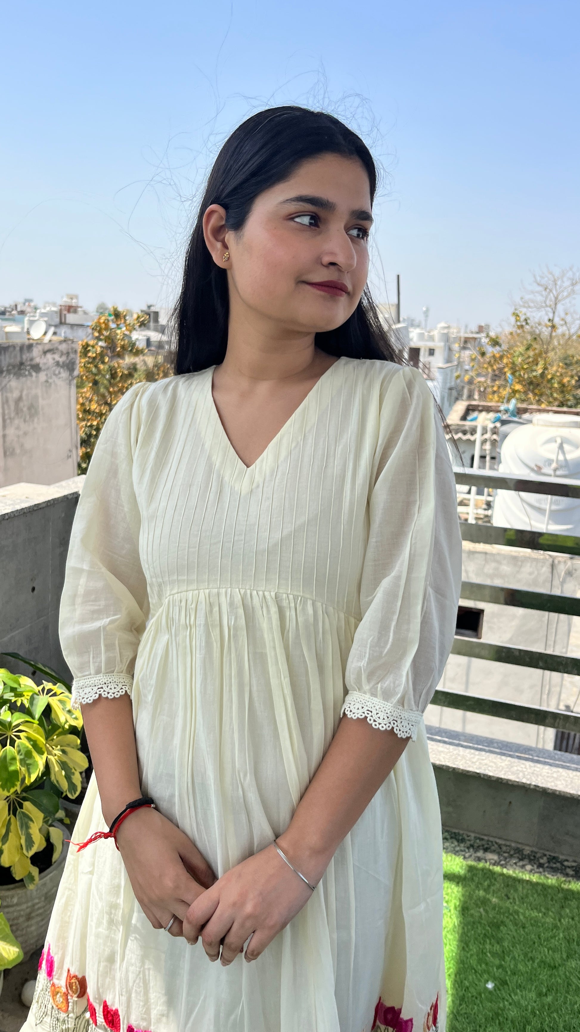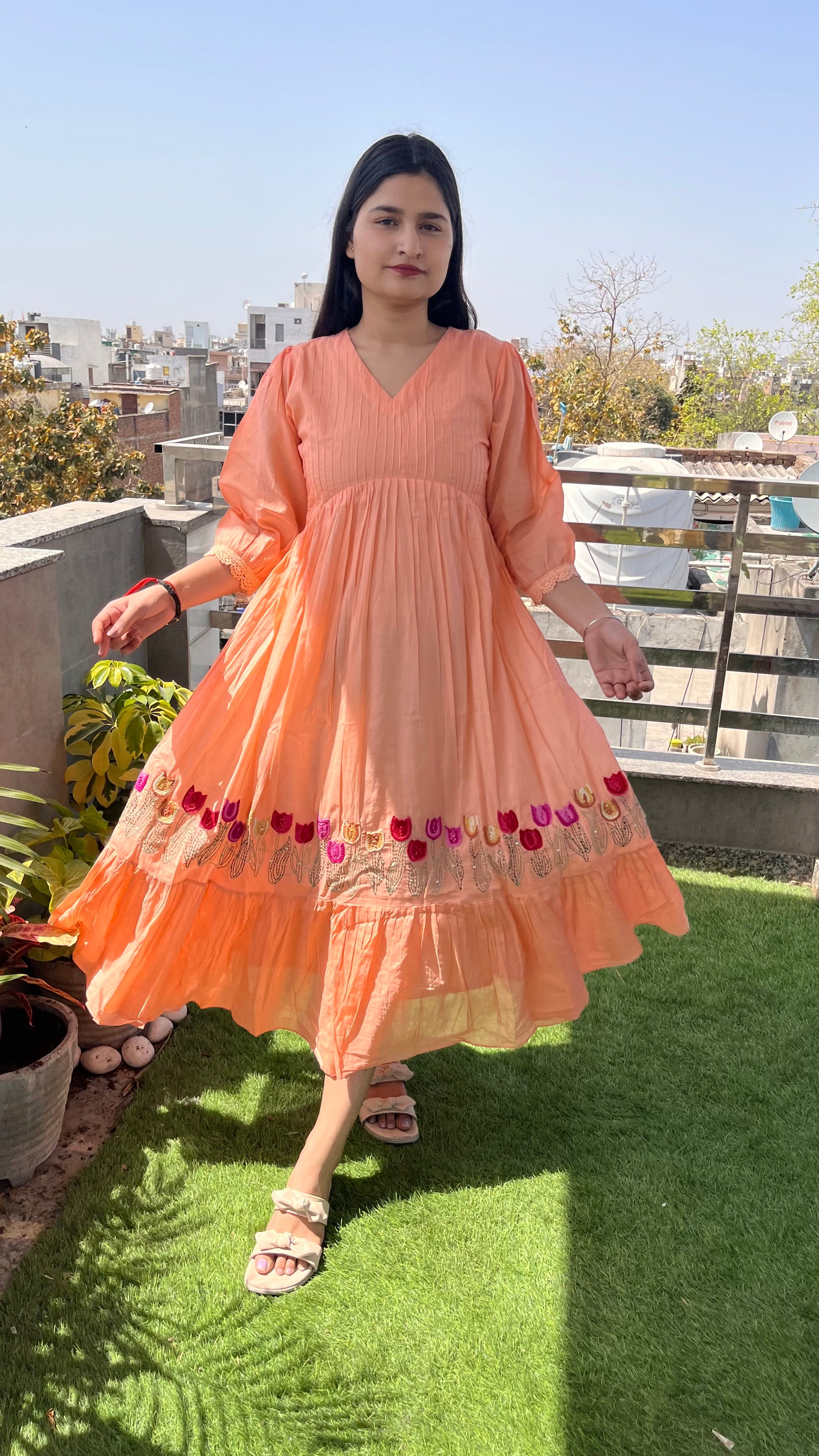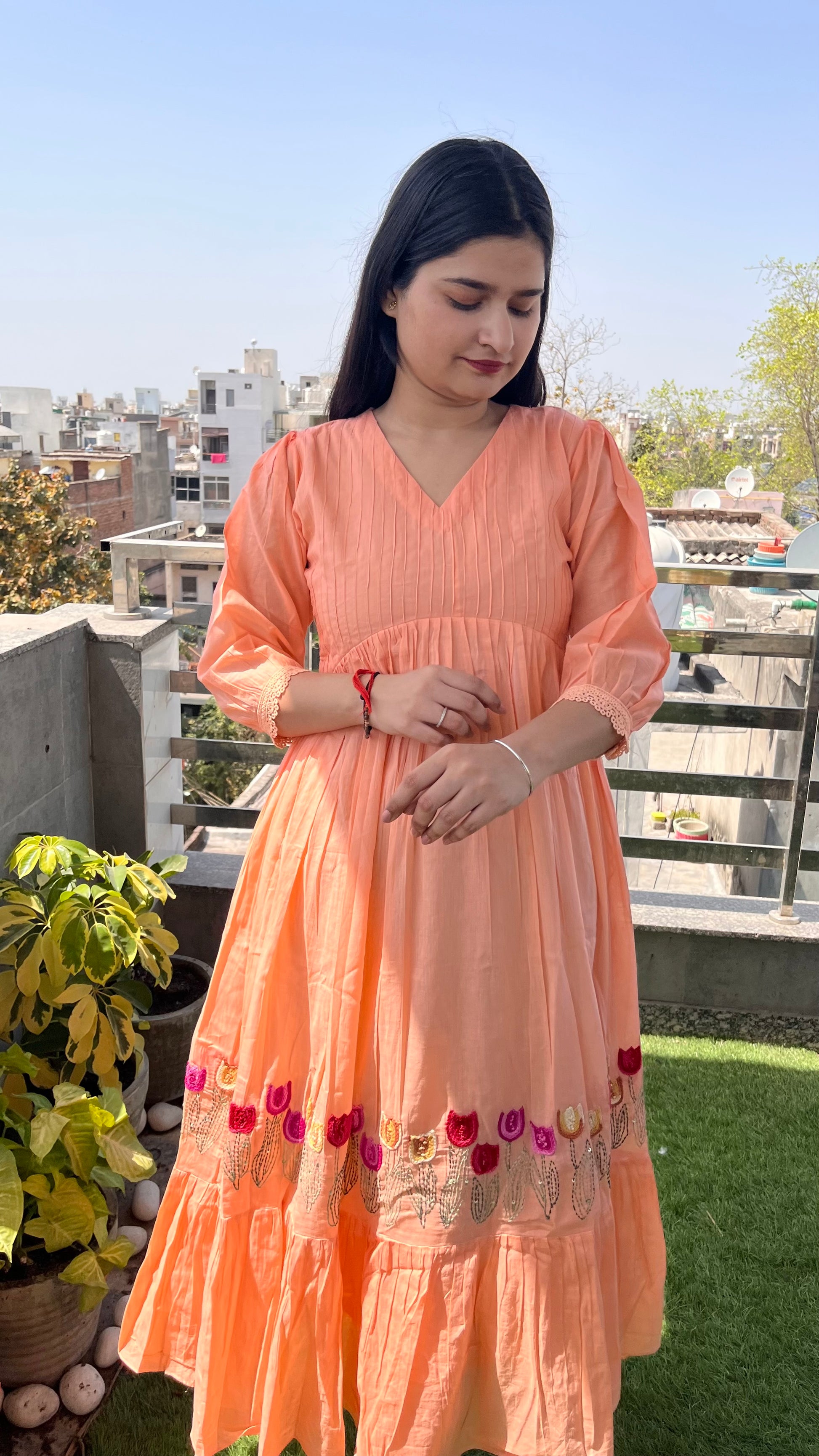 - The exquisite hand embroidery at the hem, complemented by a charming frill pattern, enhances its appeal.