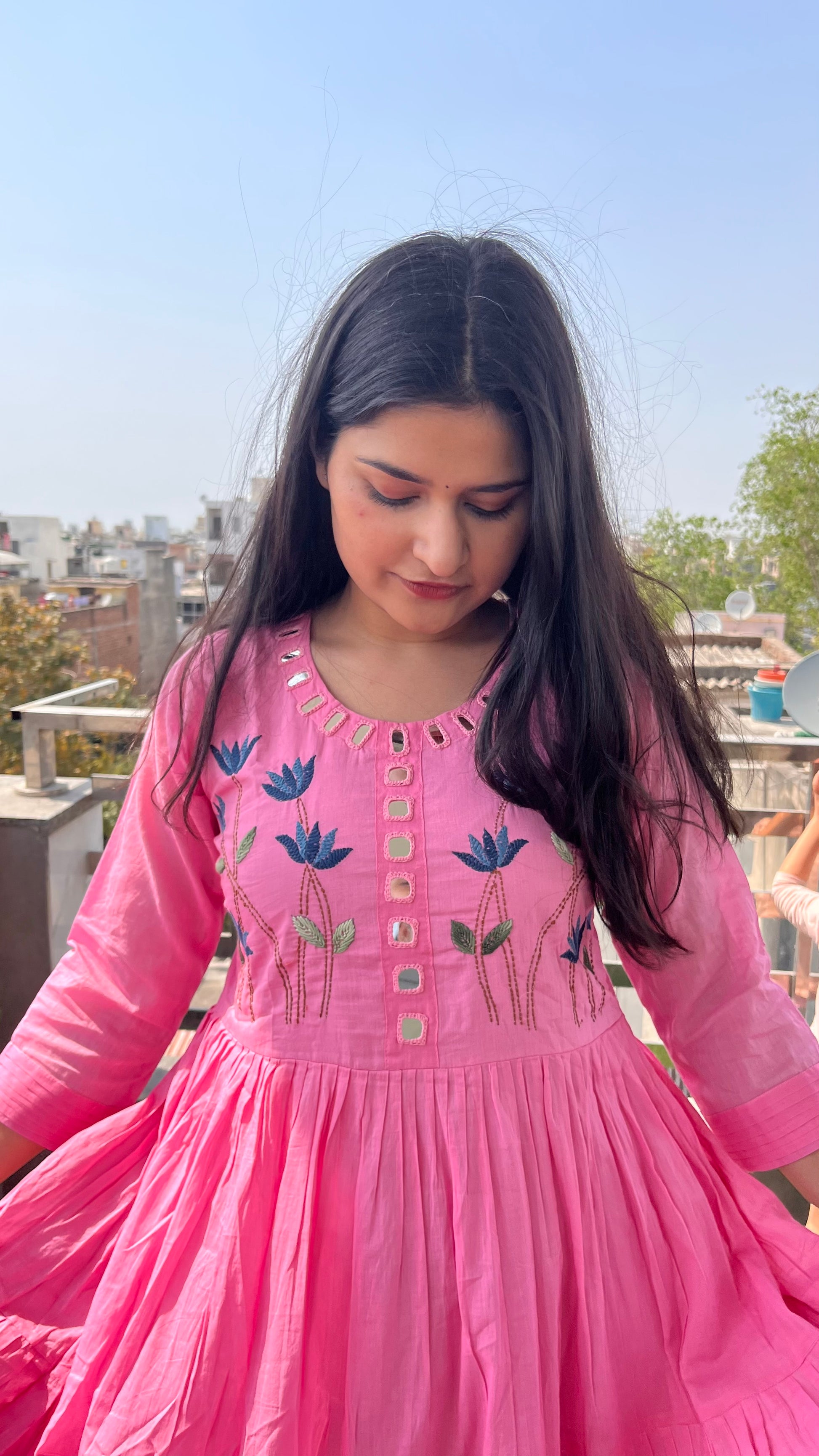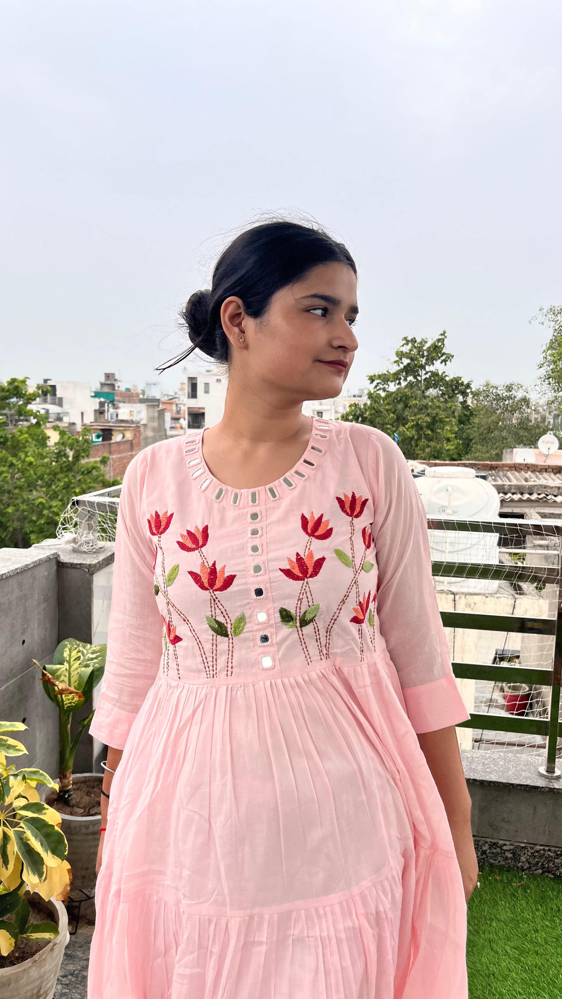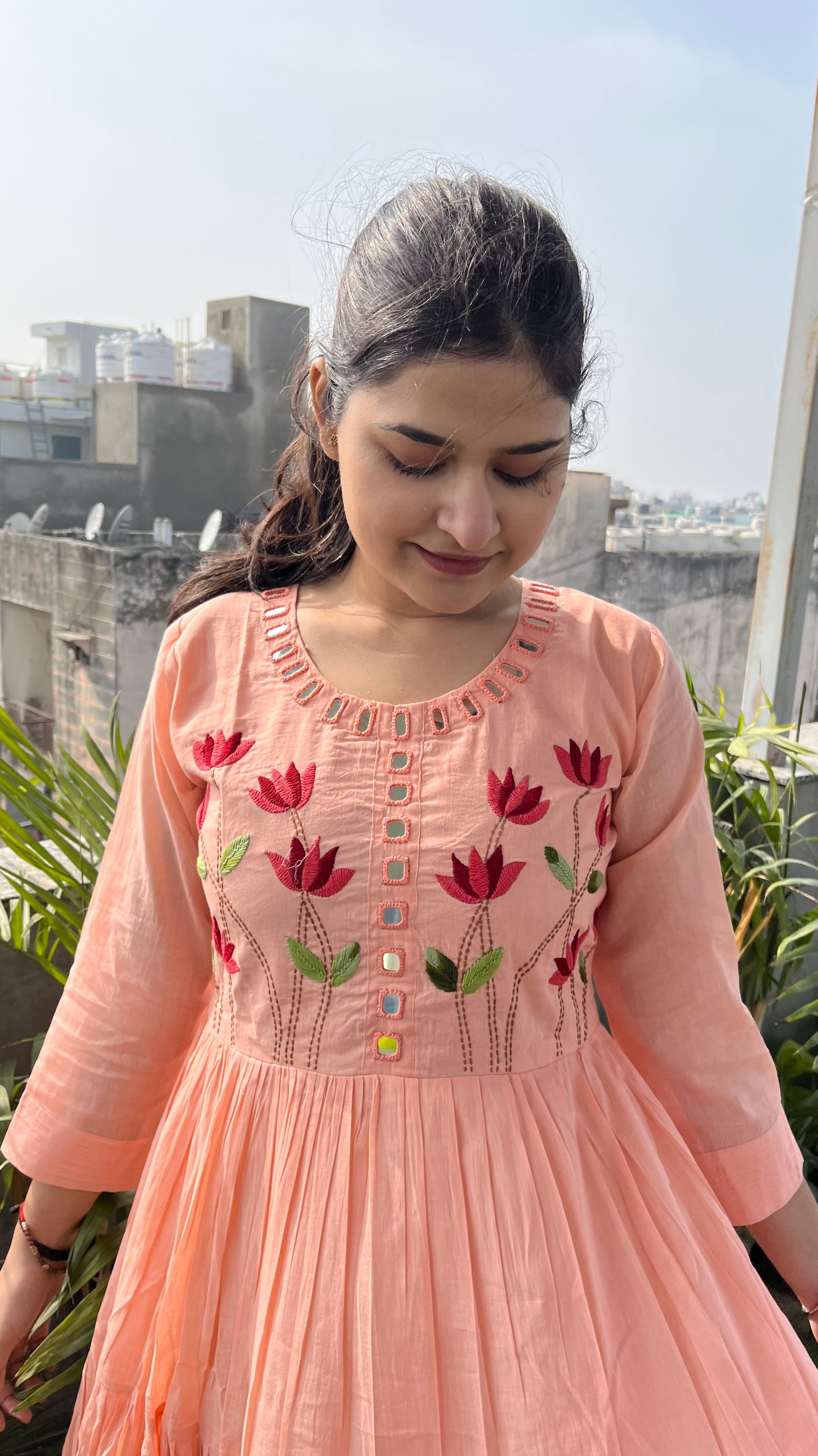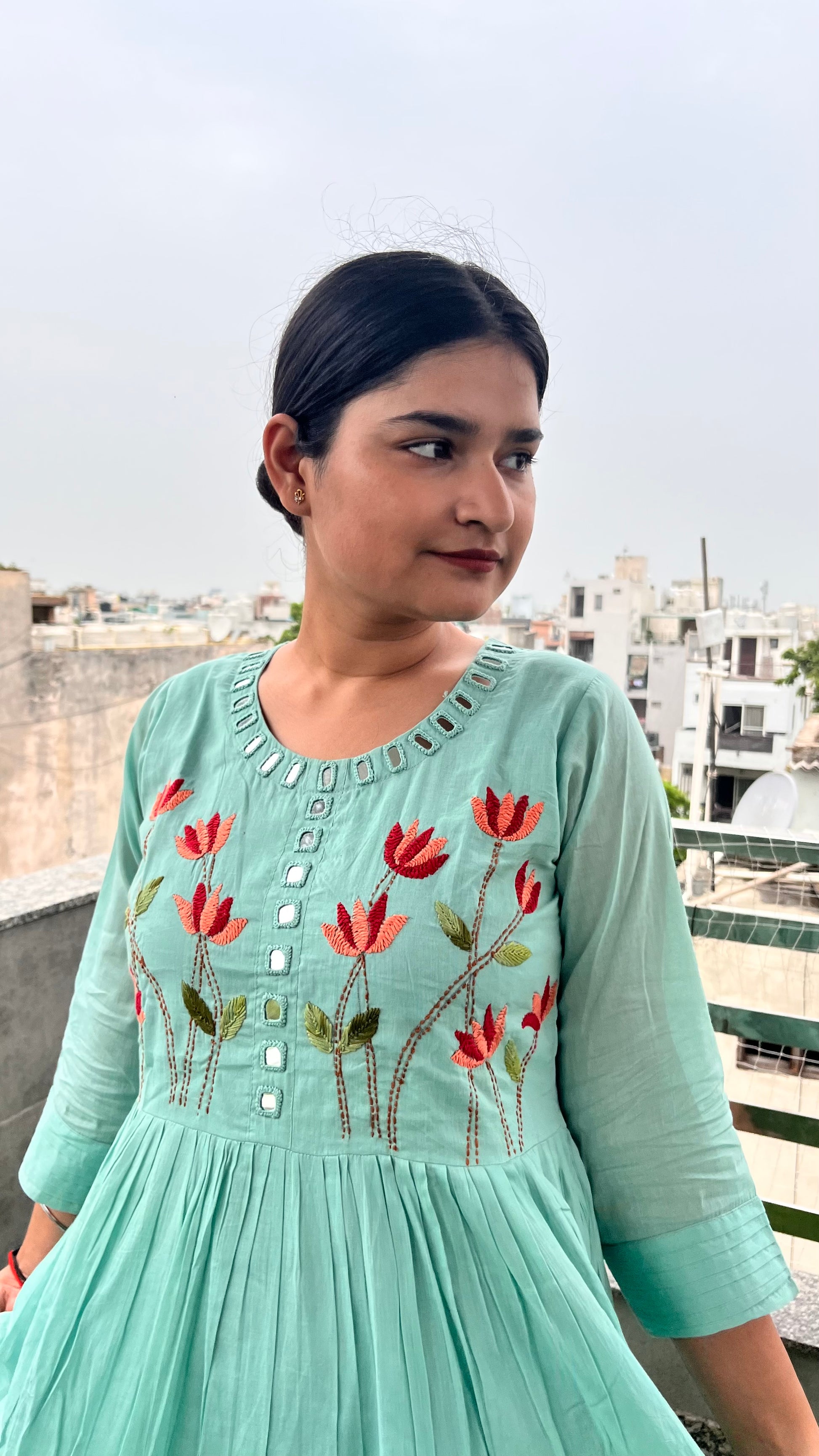 - The highlight of this piece is the intricate hand embroidery with floral motifs, accented by delicate mirror work that adds a subtle sparkle, making it perfect for both casual and festive occasions