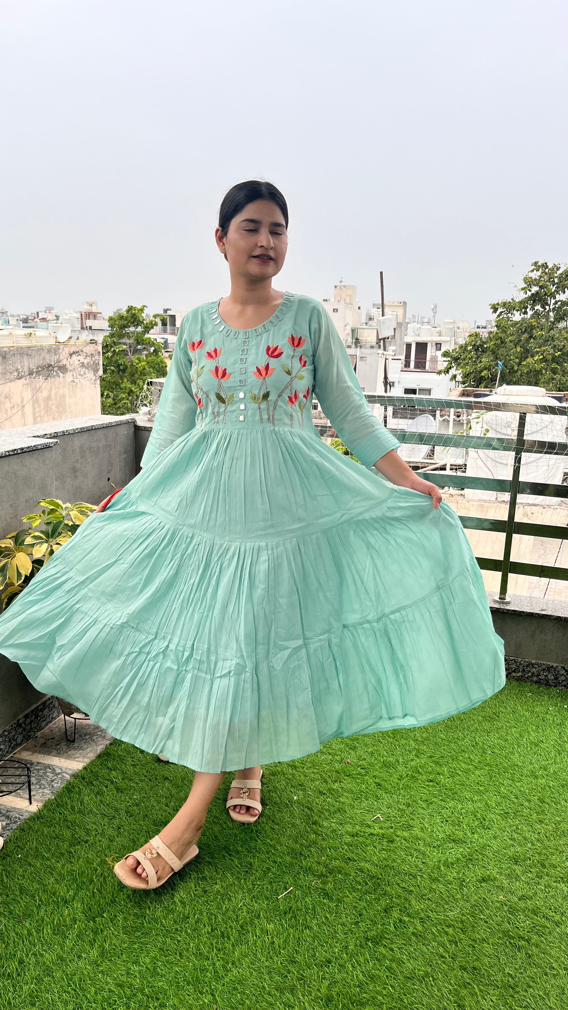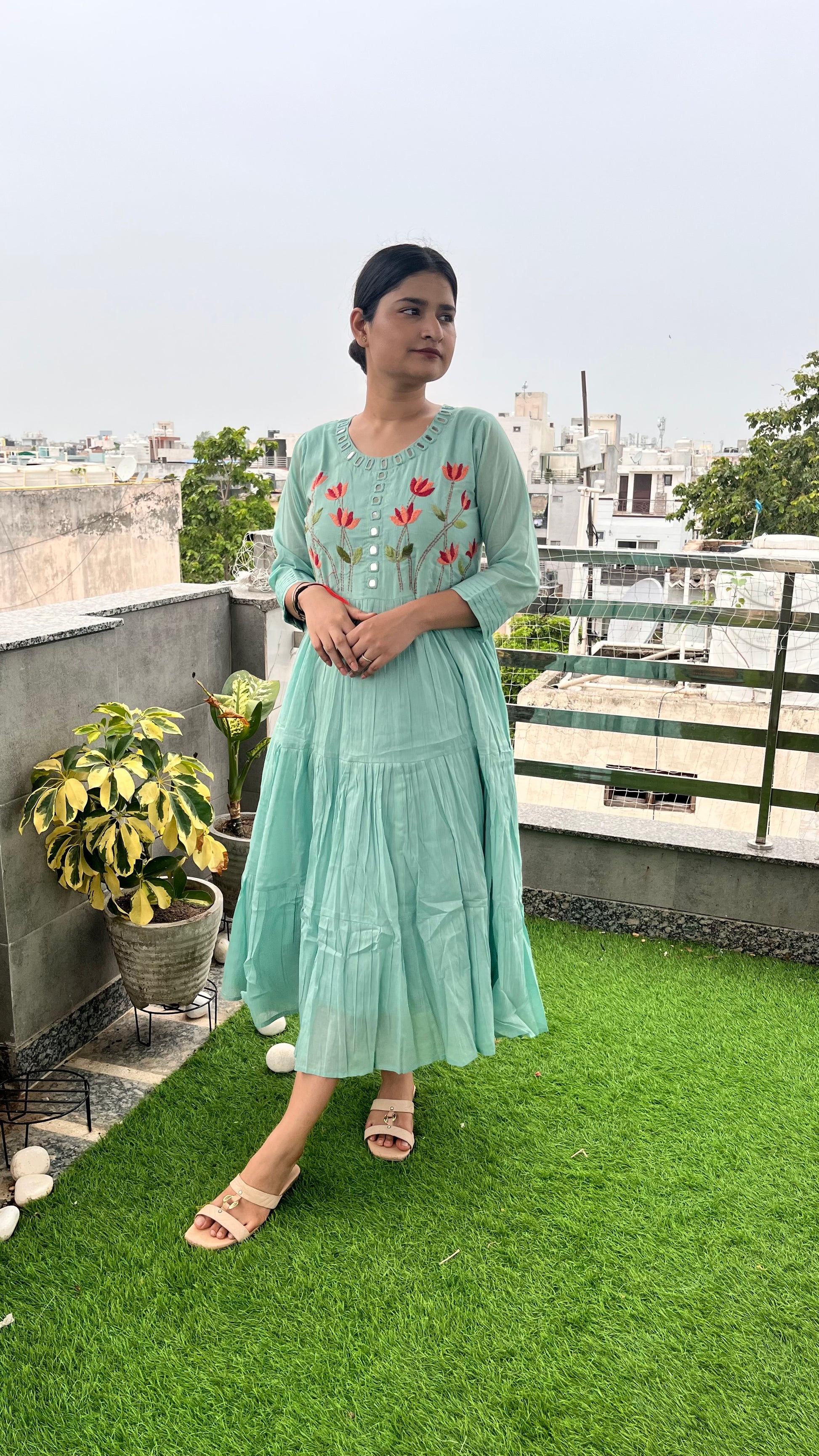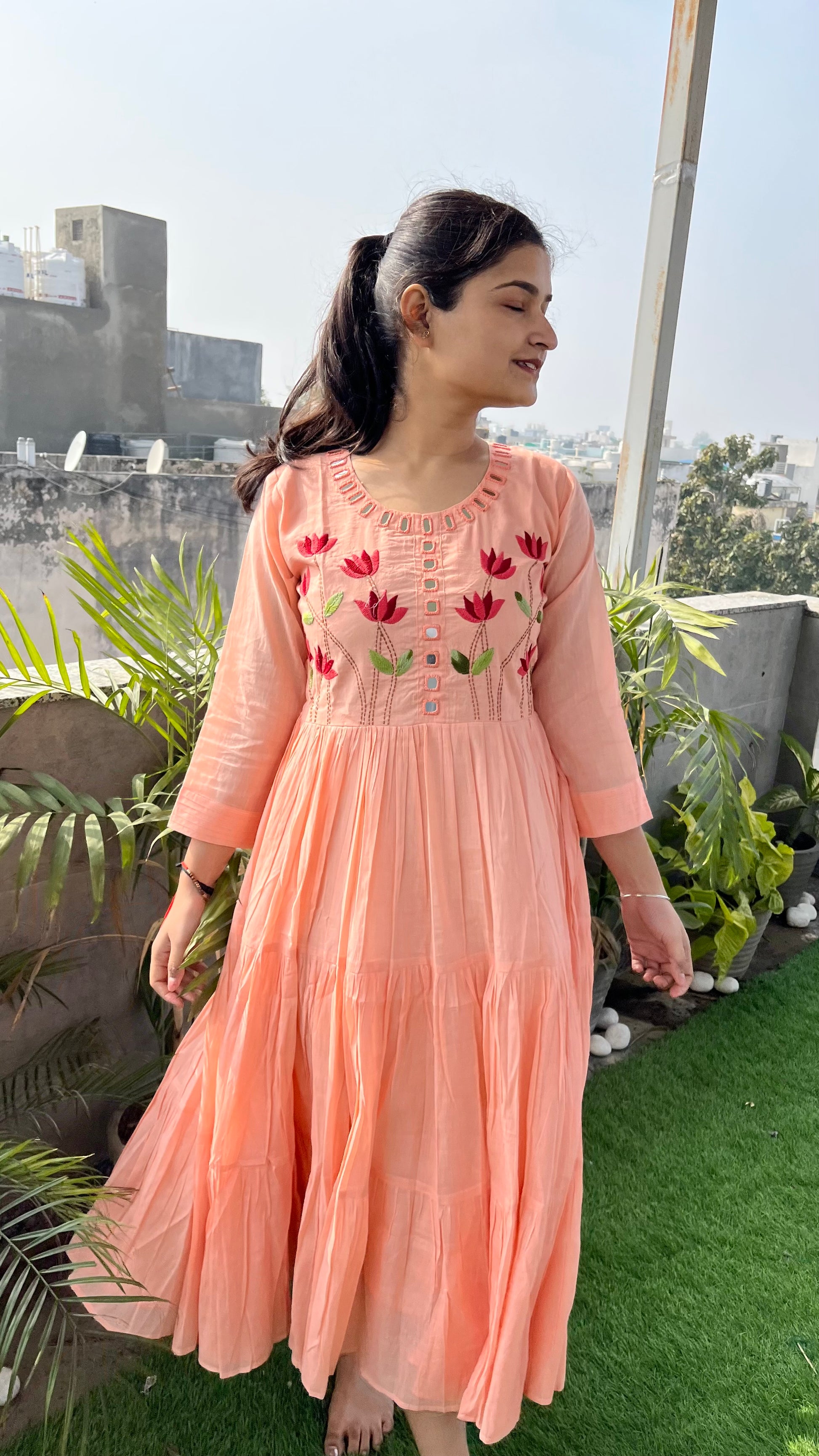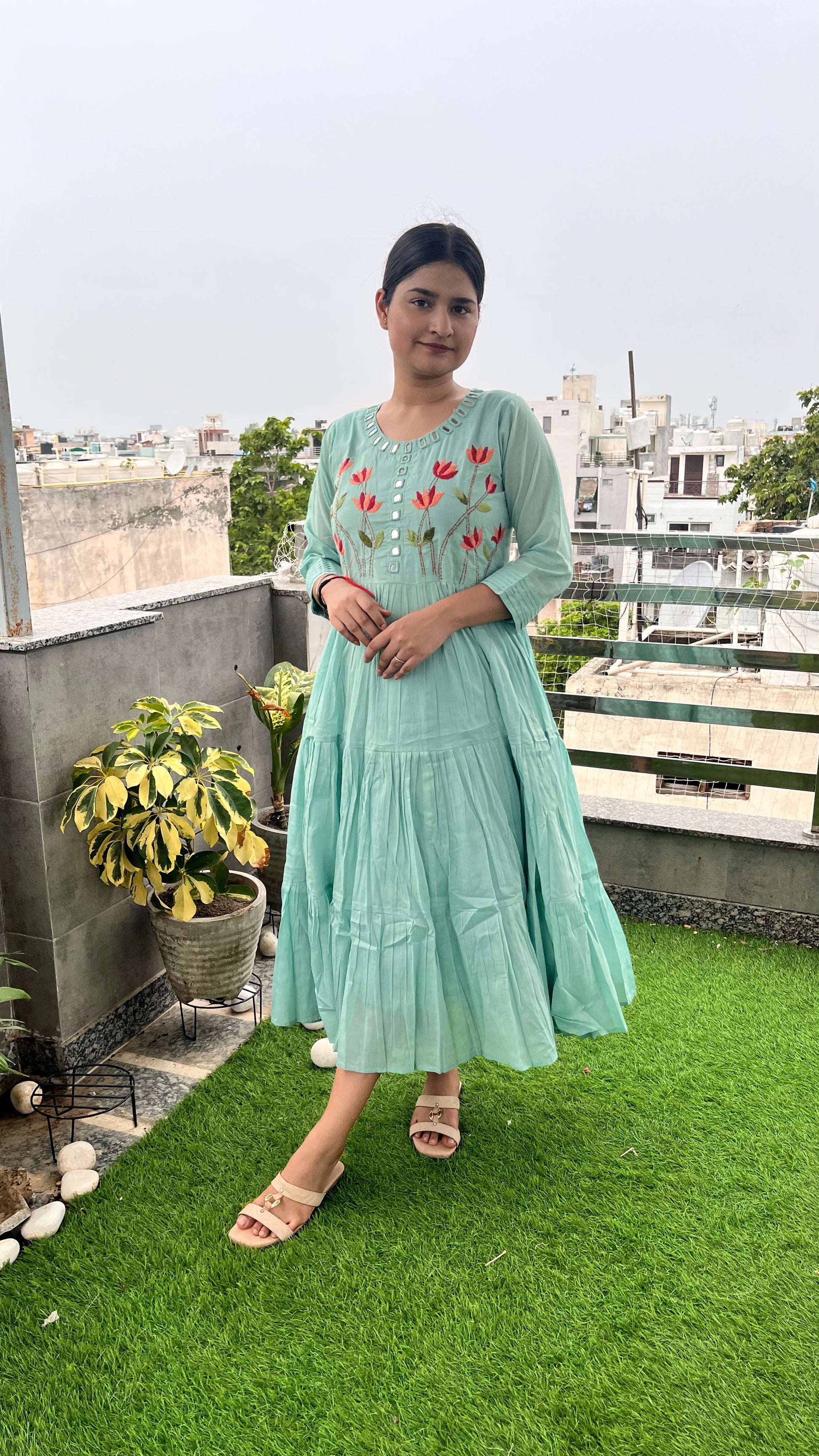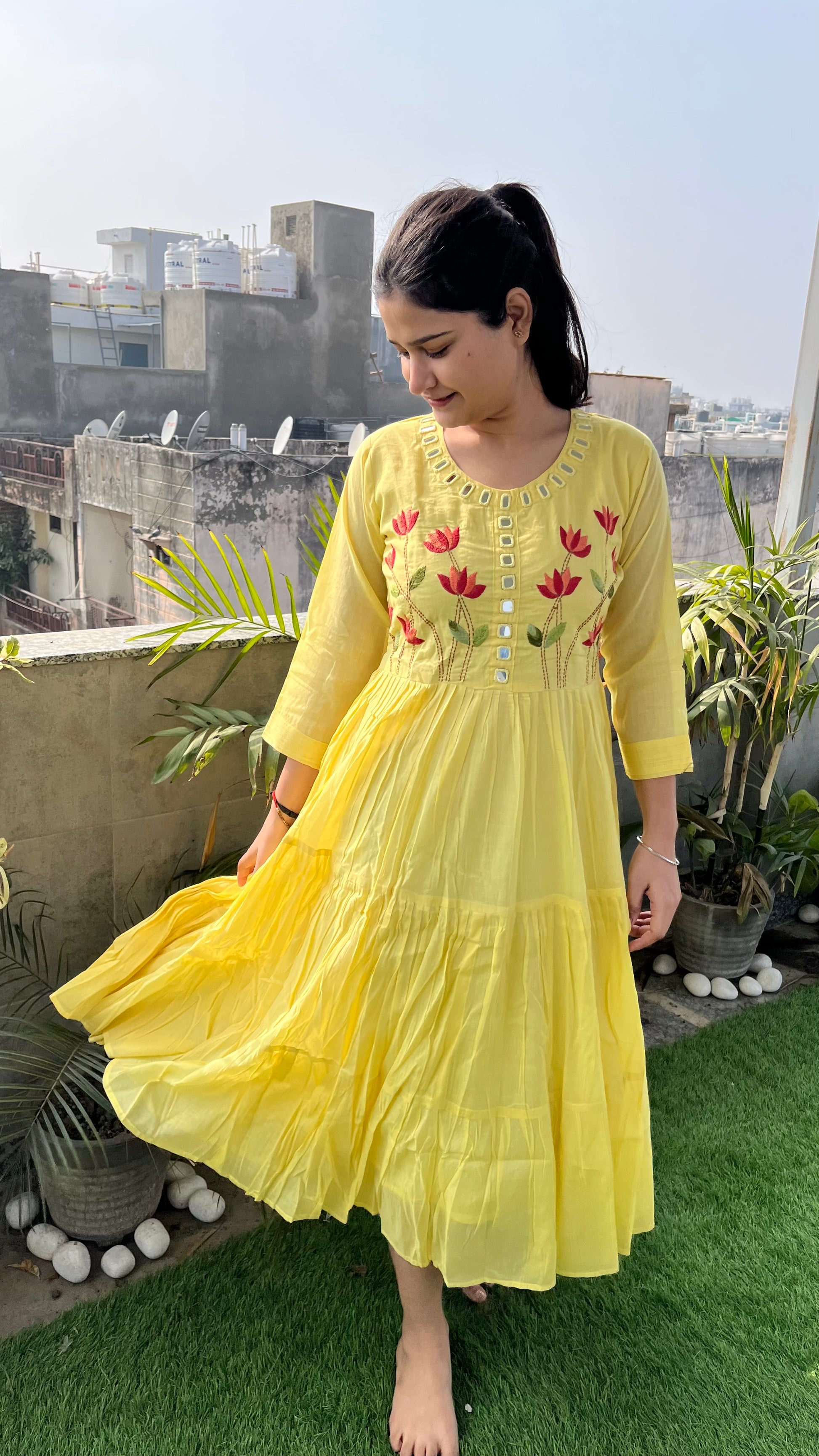 - The highlight of this piece is the intricate hand embroidery with floral motifs, accented by delicate mirror work that adds a subtle sparkle, making it perfect for both casual and festive occasions