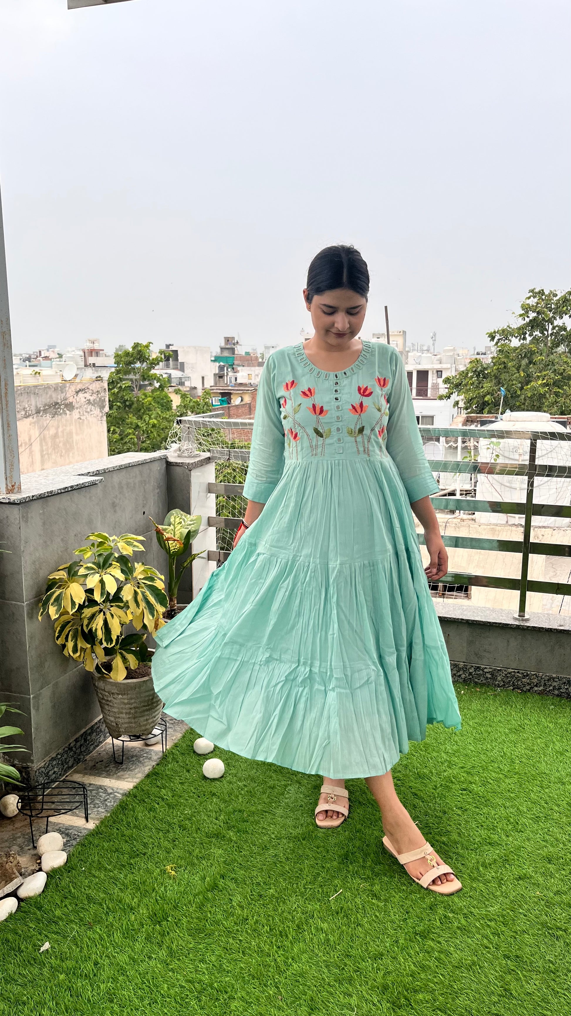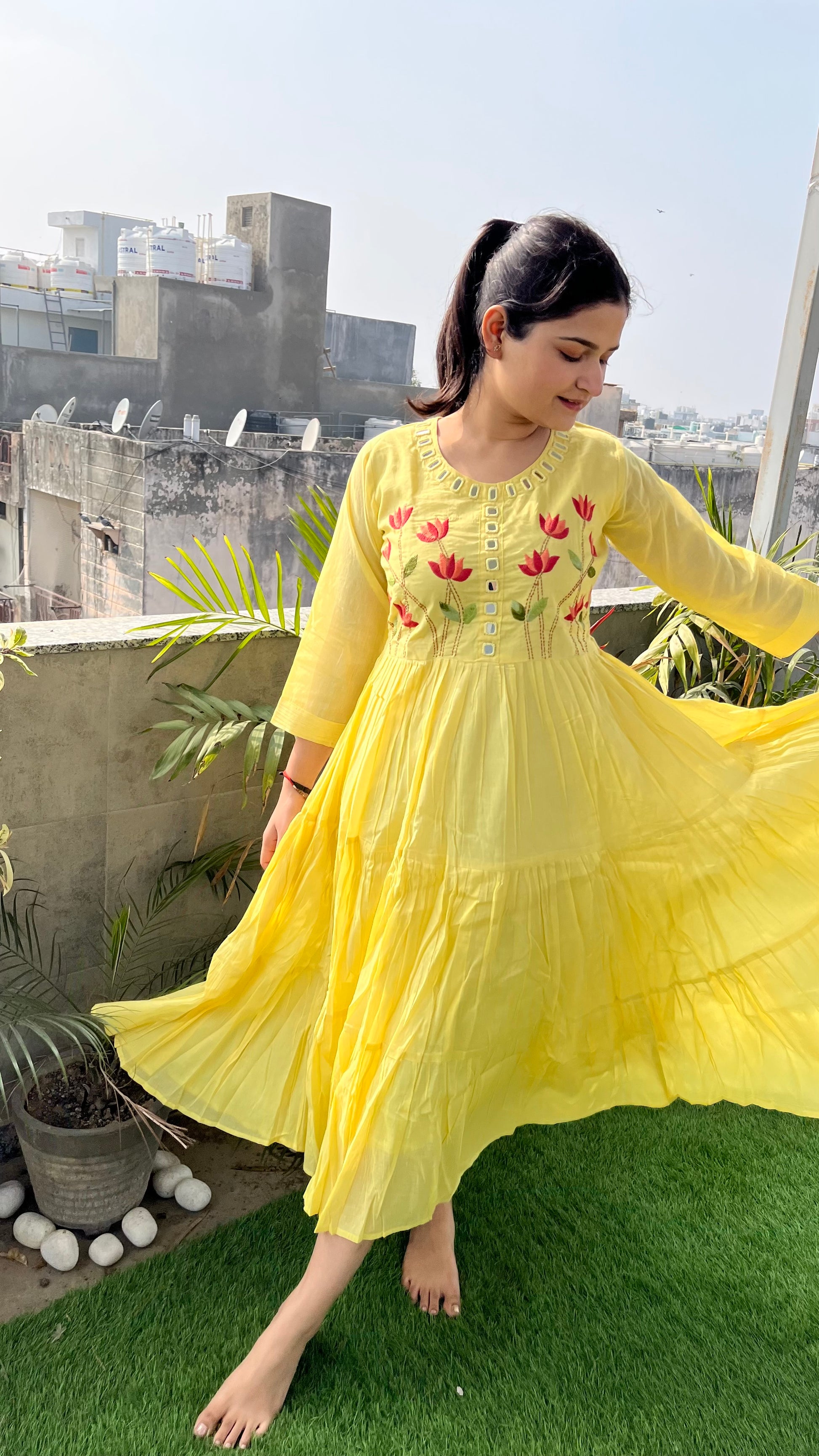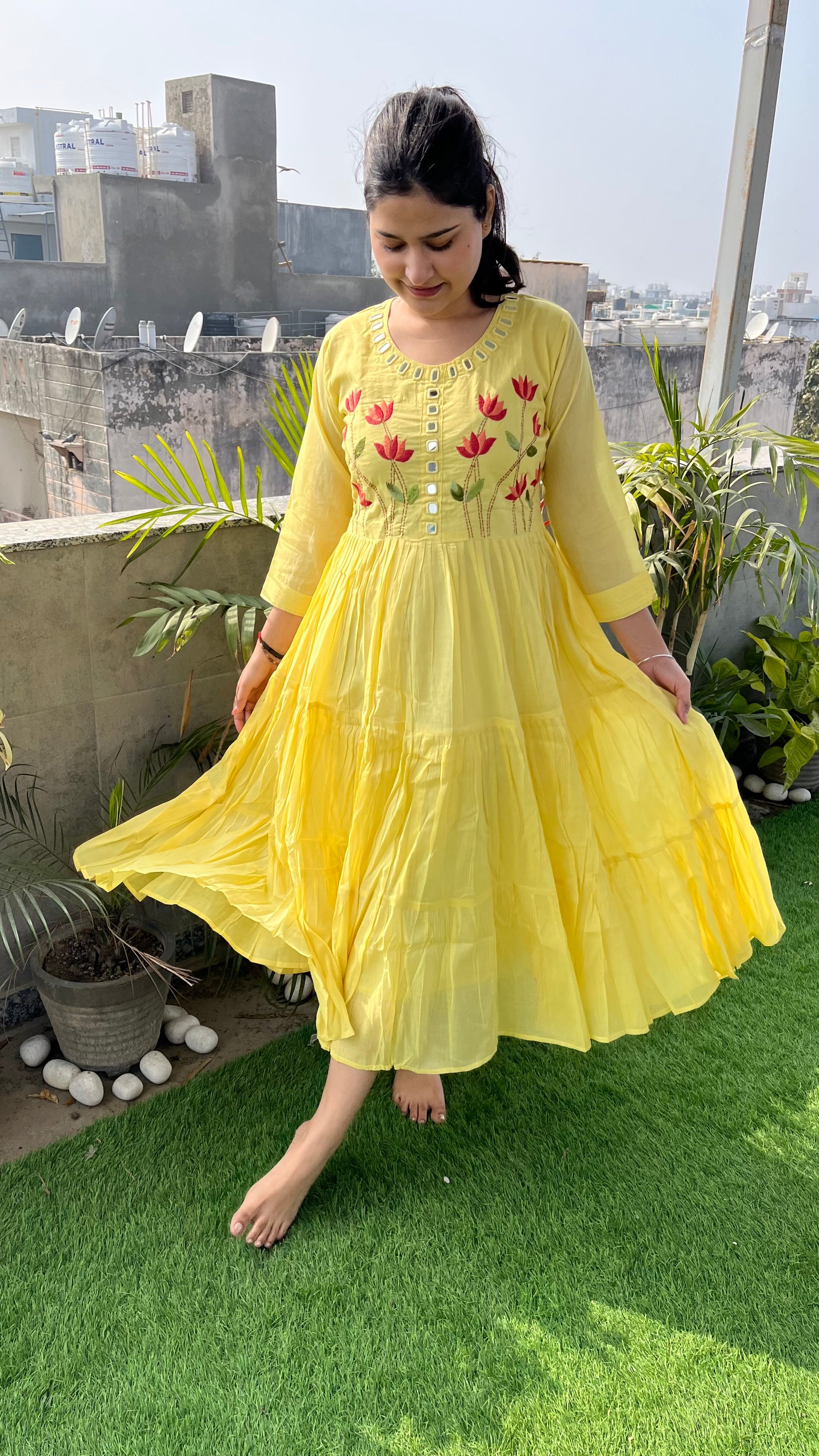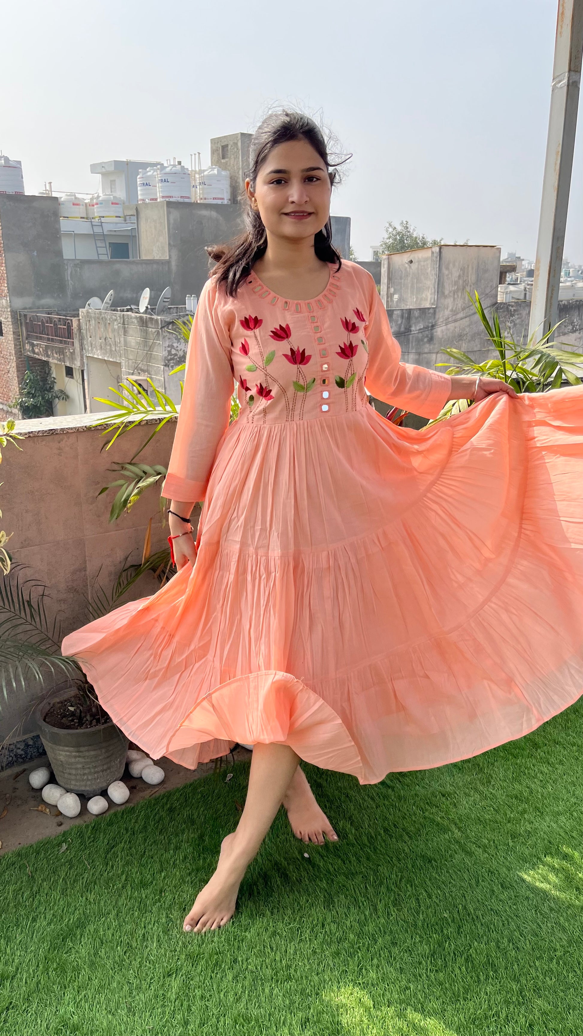 - The highlight of this piece is the intricate hand embroidery with floral motifs, accented by delicate mirror work that adds a subtle sparkle, making it perfect for both casual and festive occasions