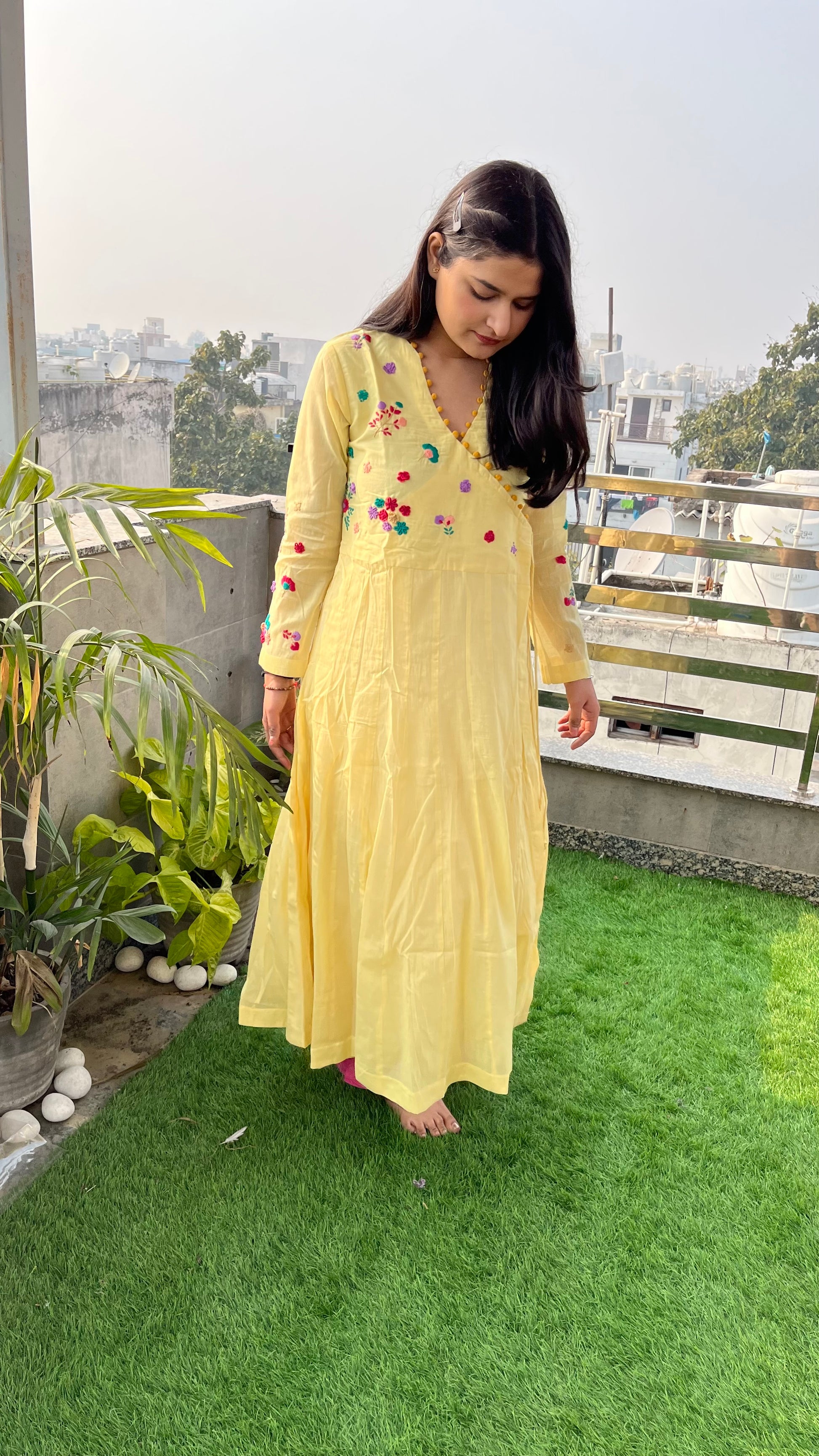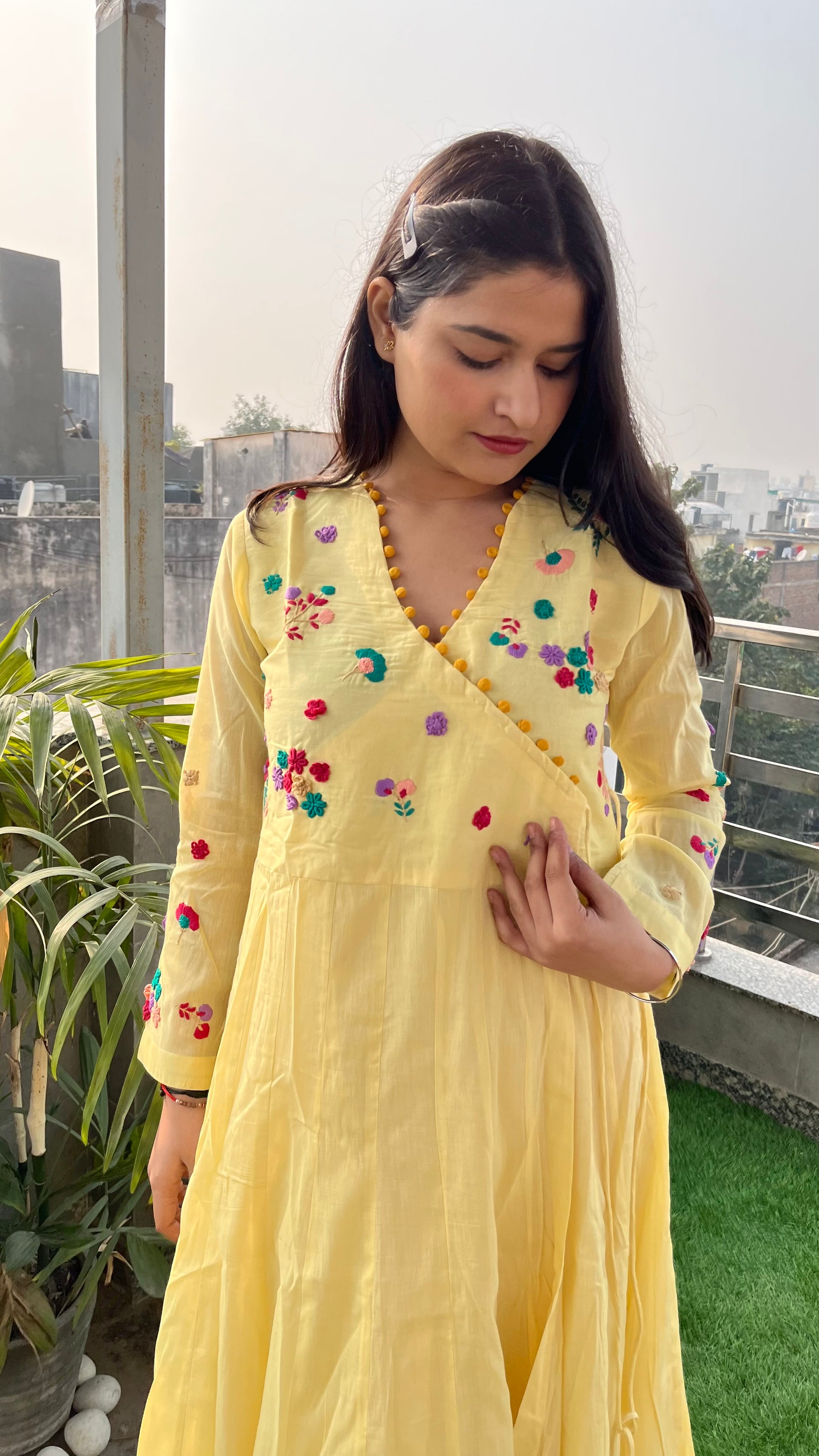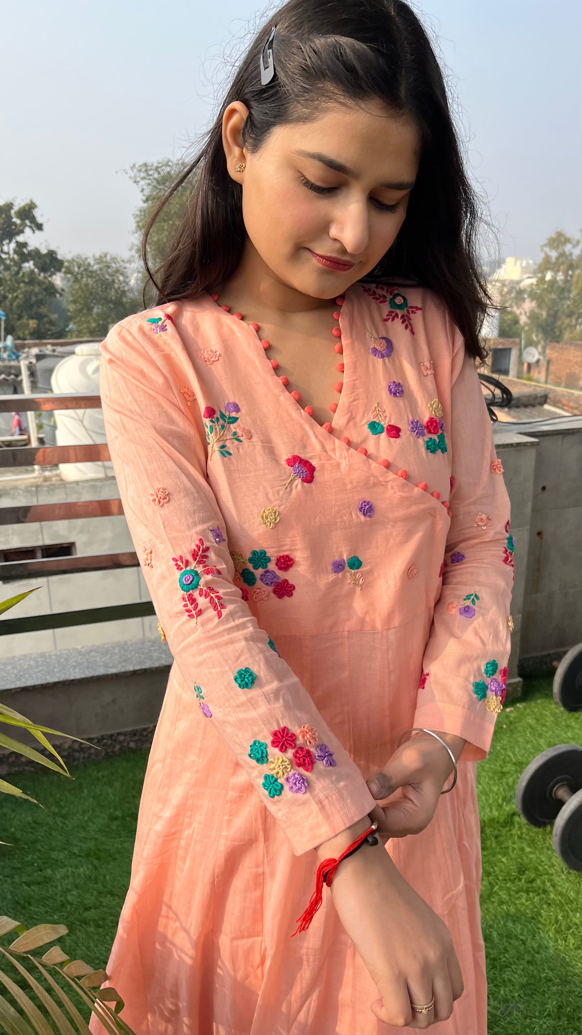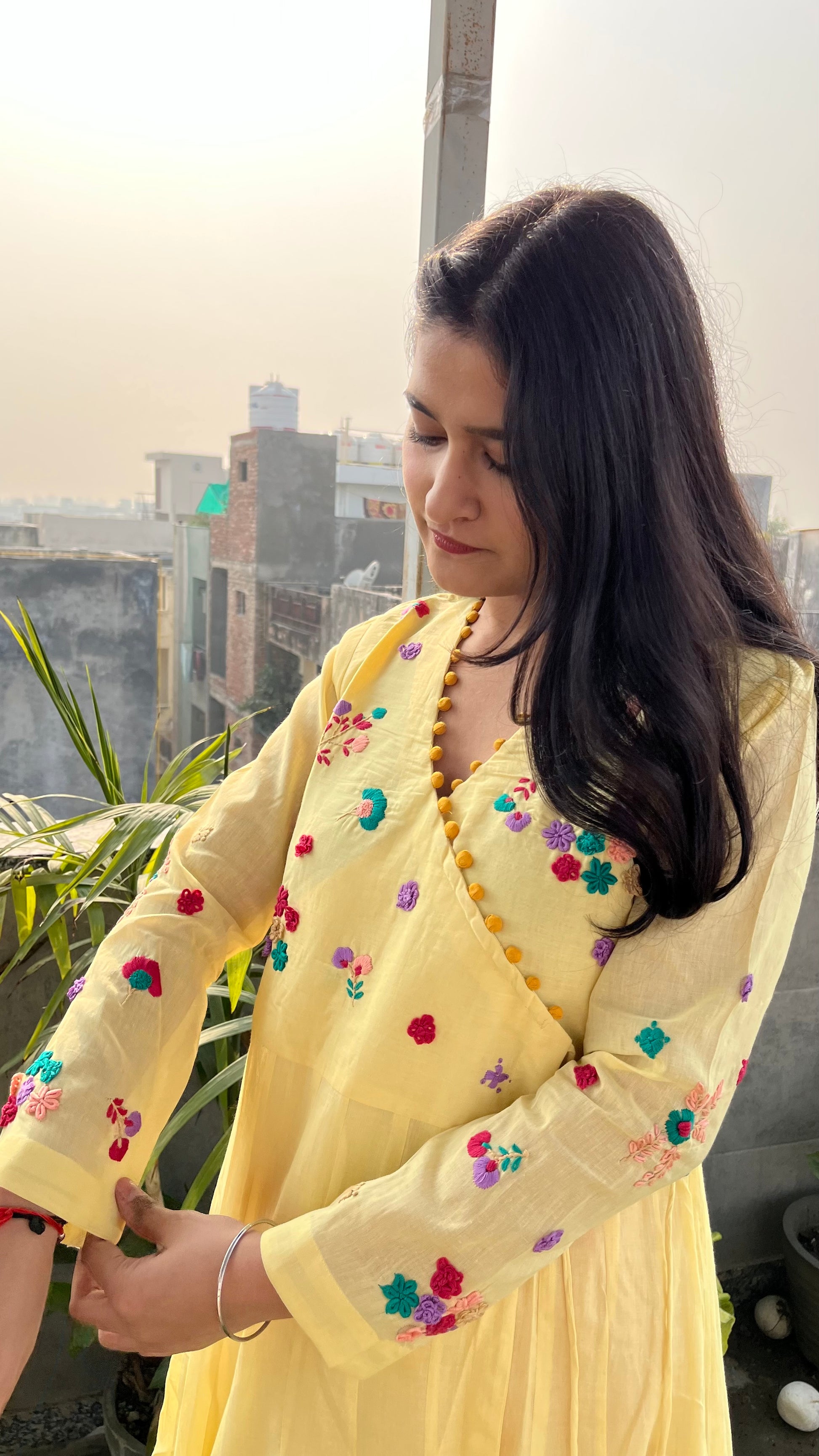 - The yoke and full-length sleeves are meticulously hand-embroidered with vibrant floral motifs, showcasing impeccable craftsmanship.