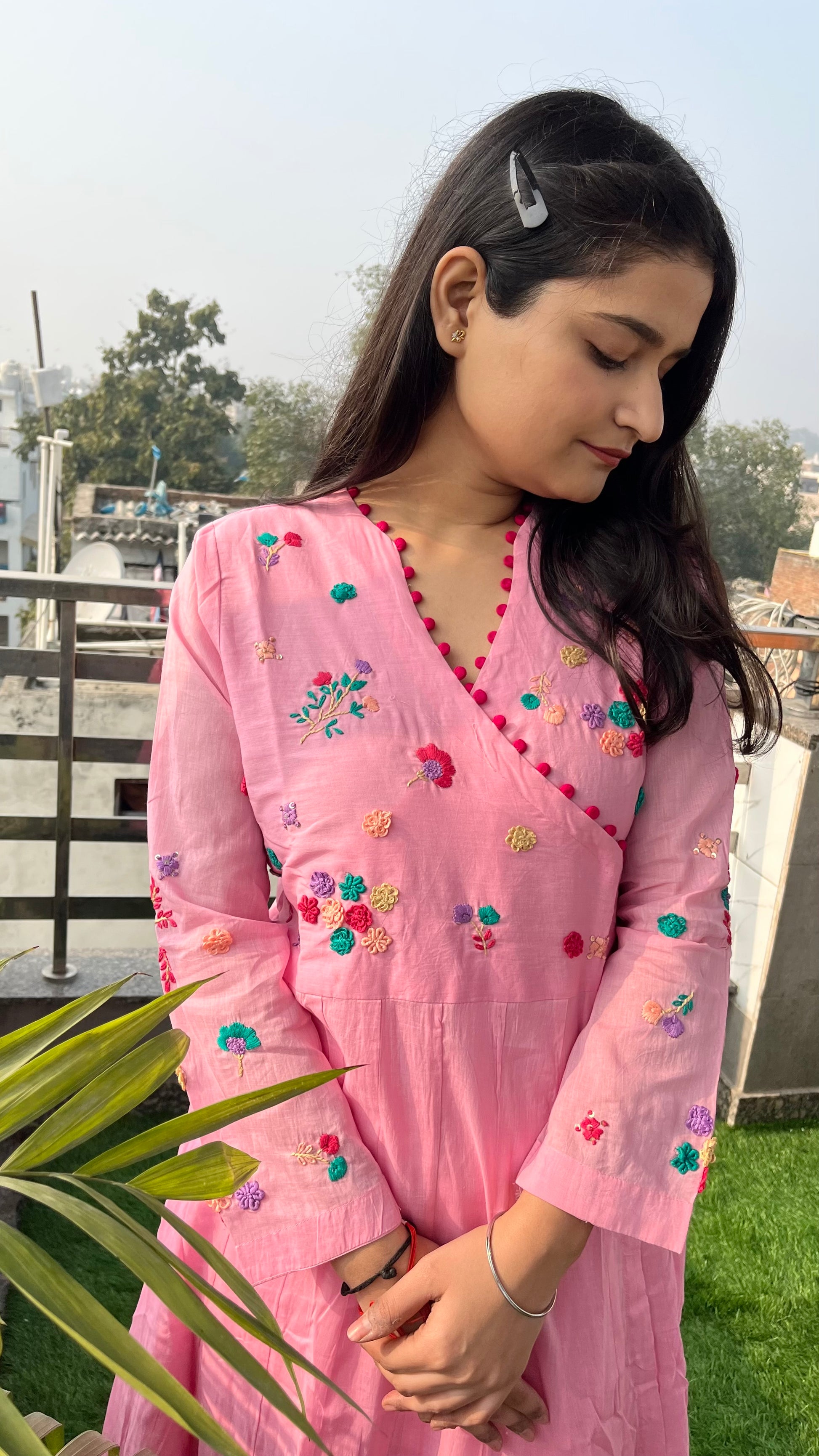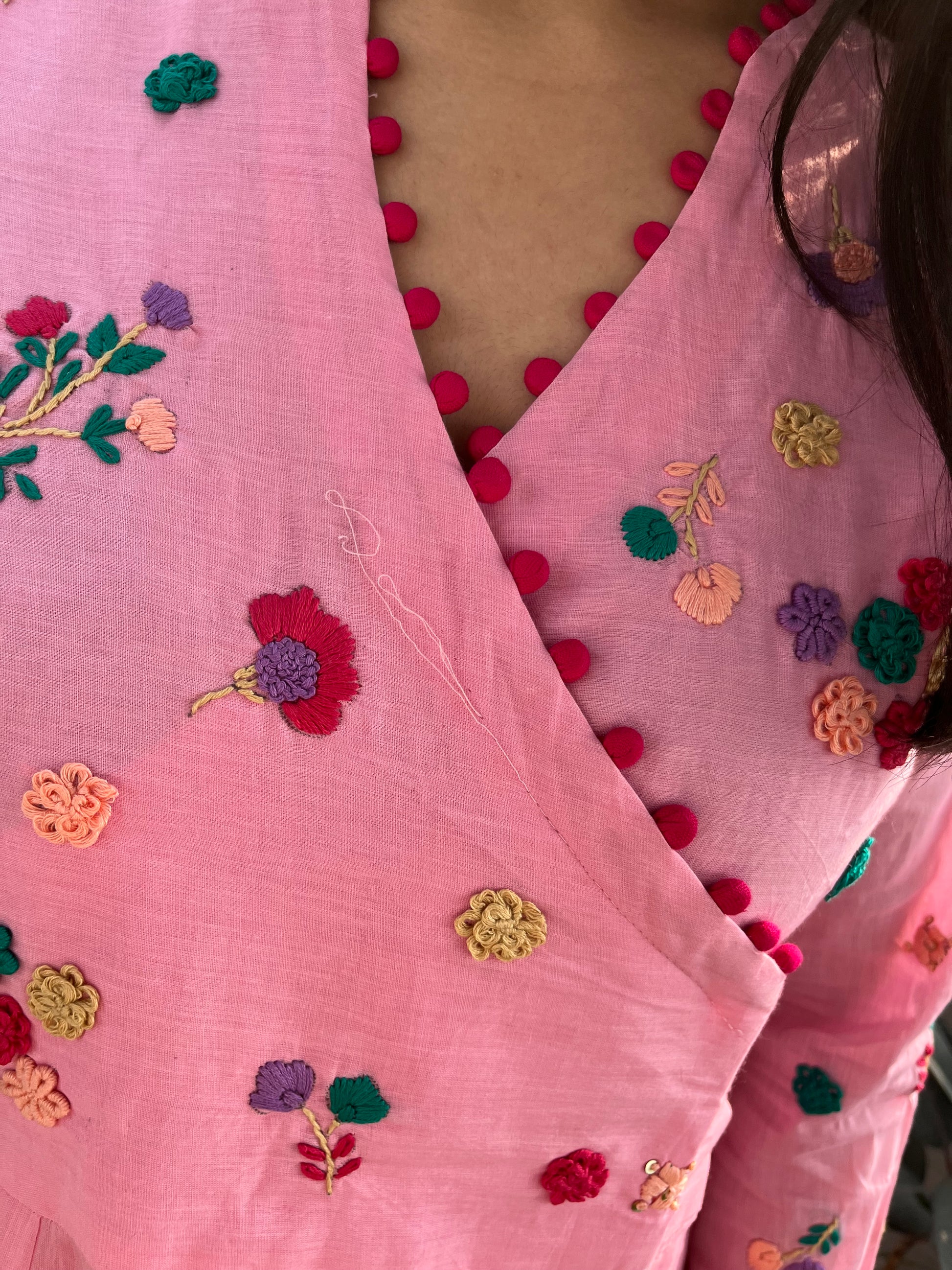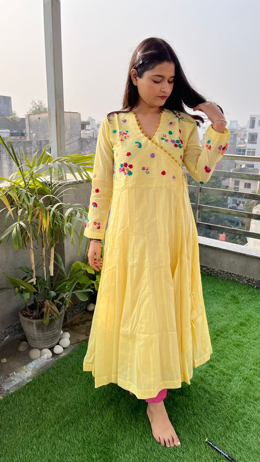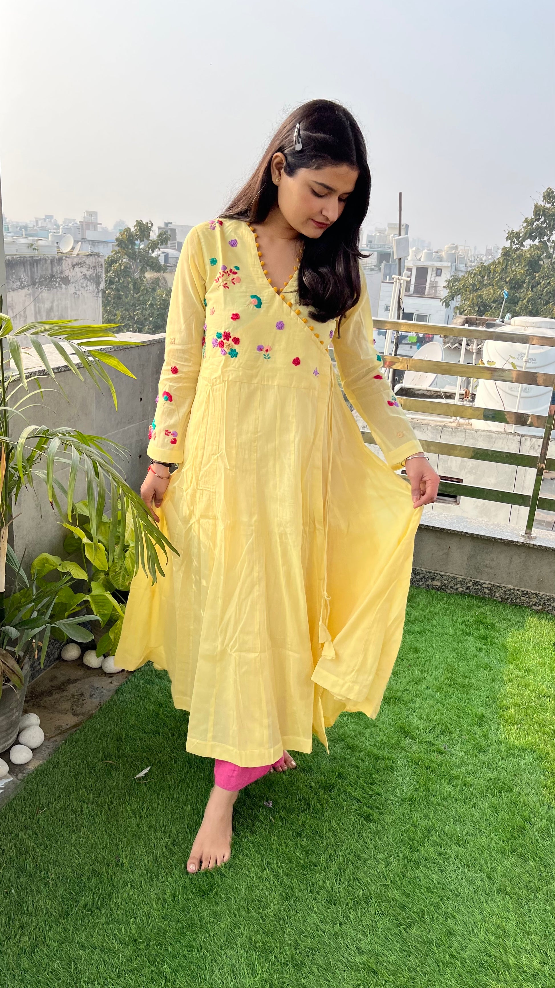 - The yoke and full-length sleeves are meticulously hand-embroidered with vibrant floral motifs, showcasing impeccable craftsmanship.