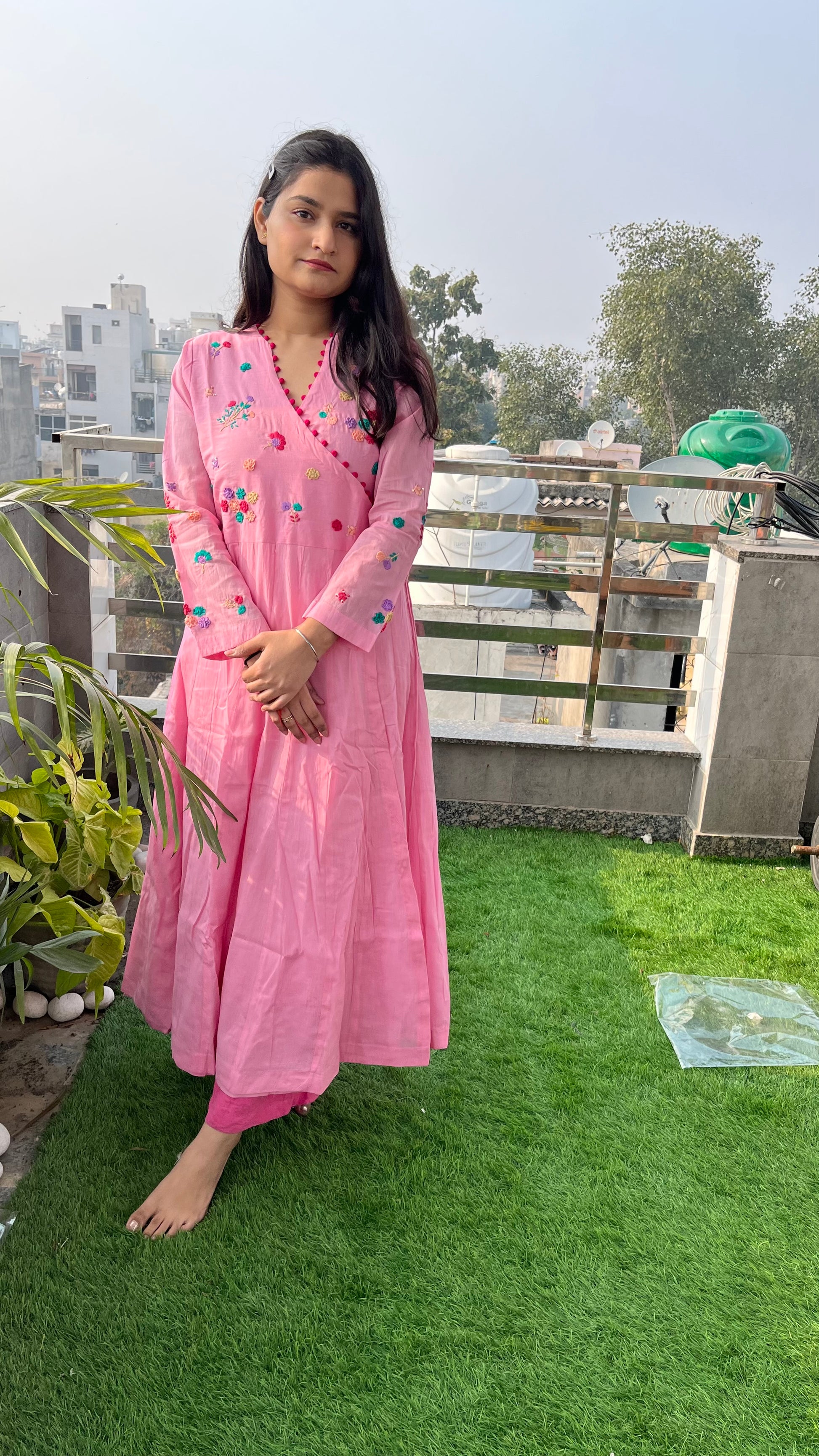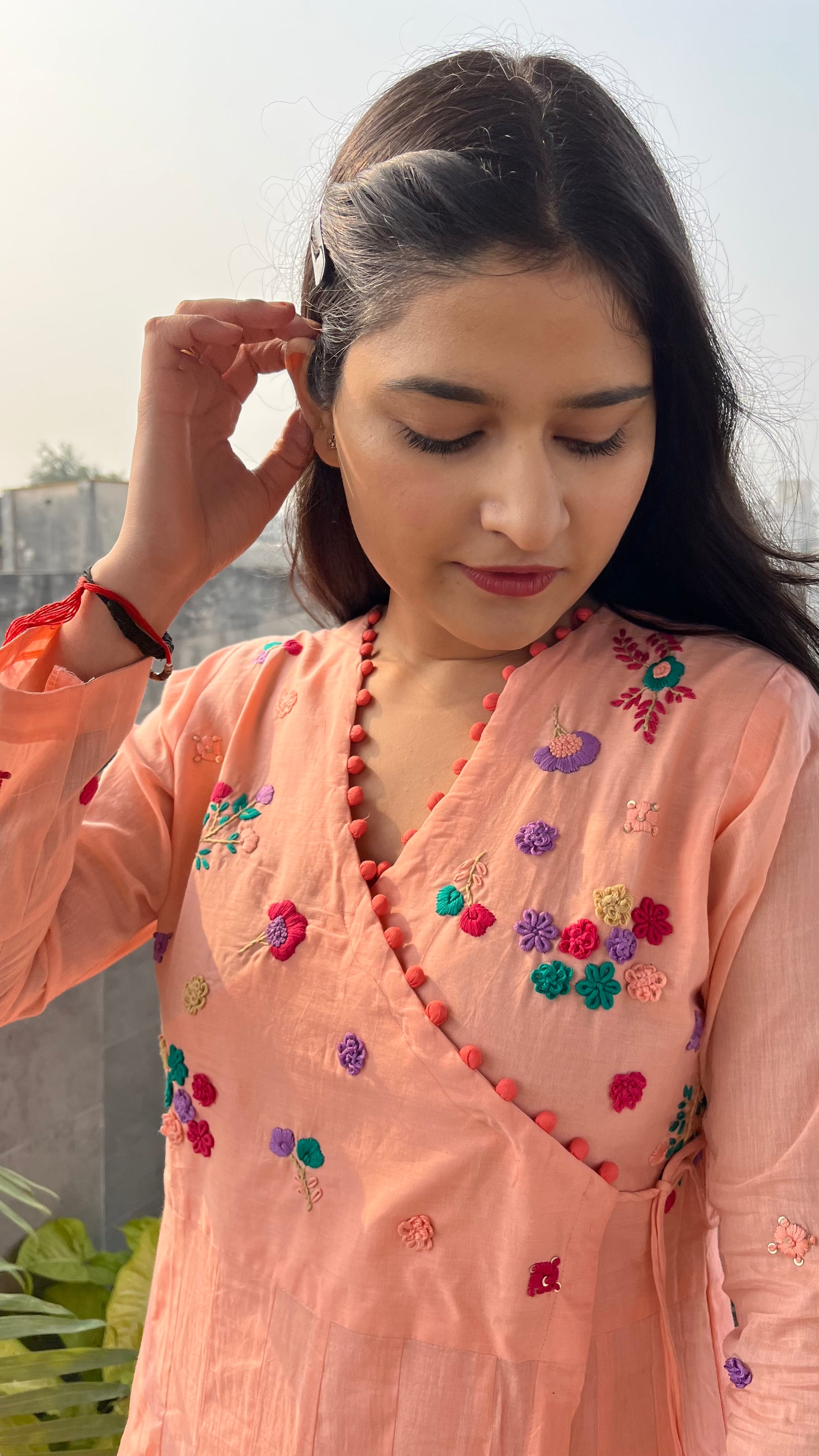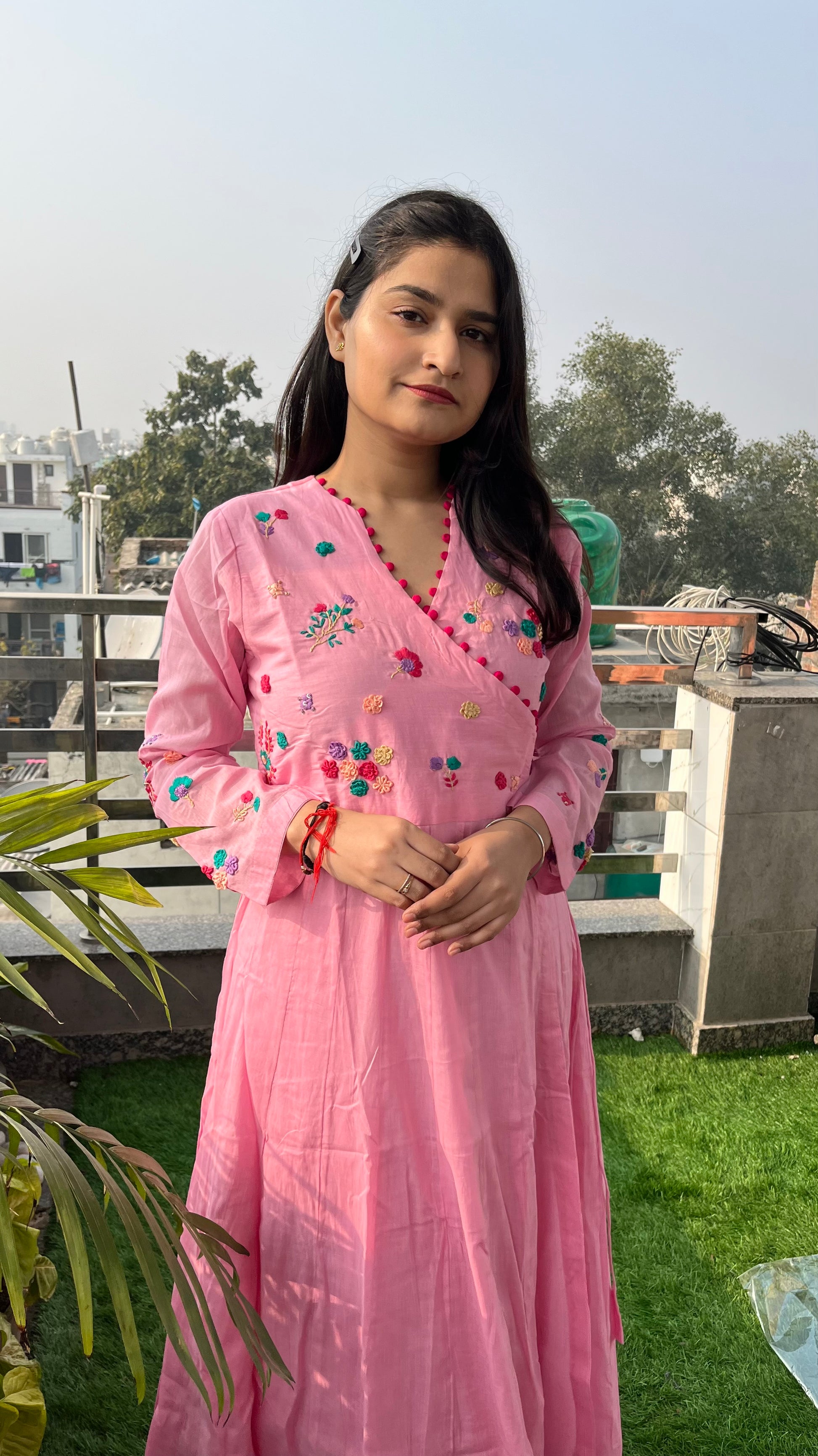 - The Angrakha-inspired design is highlighted by a V-shaped neckline adorned with potli button details, adding a touch of sophistication.