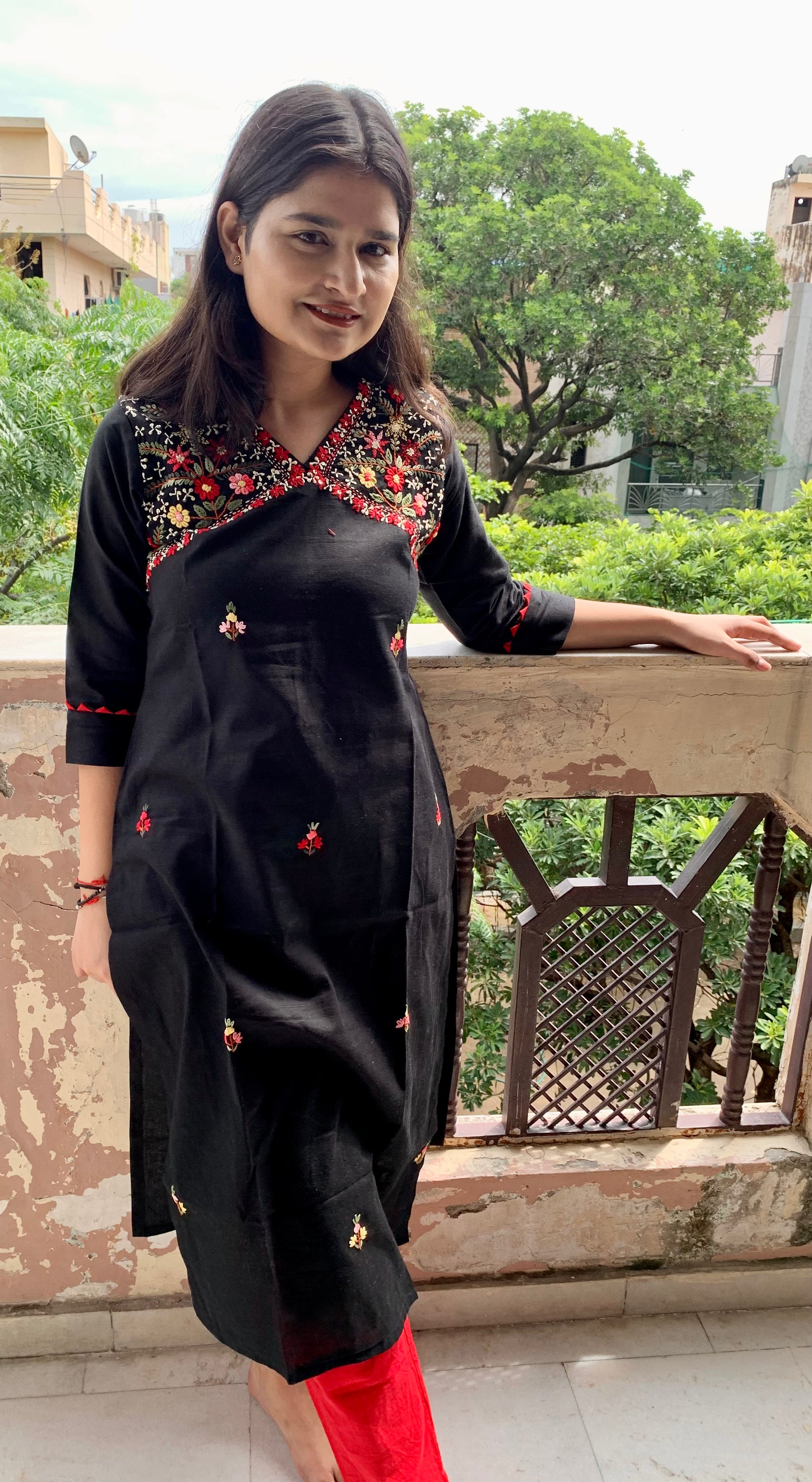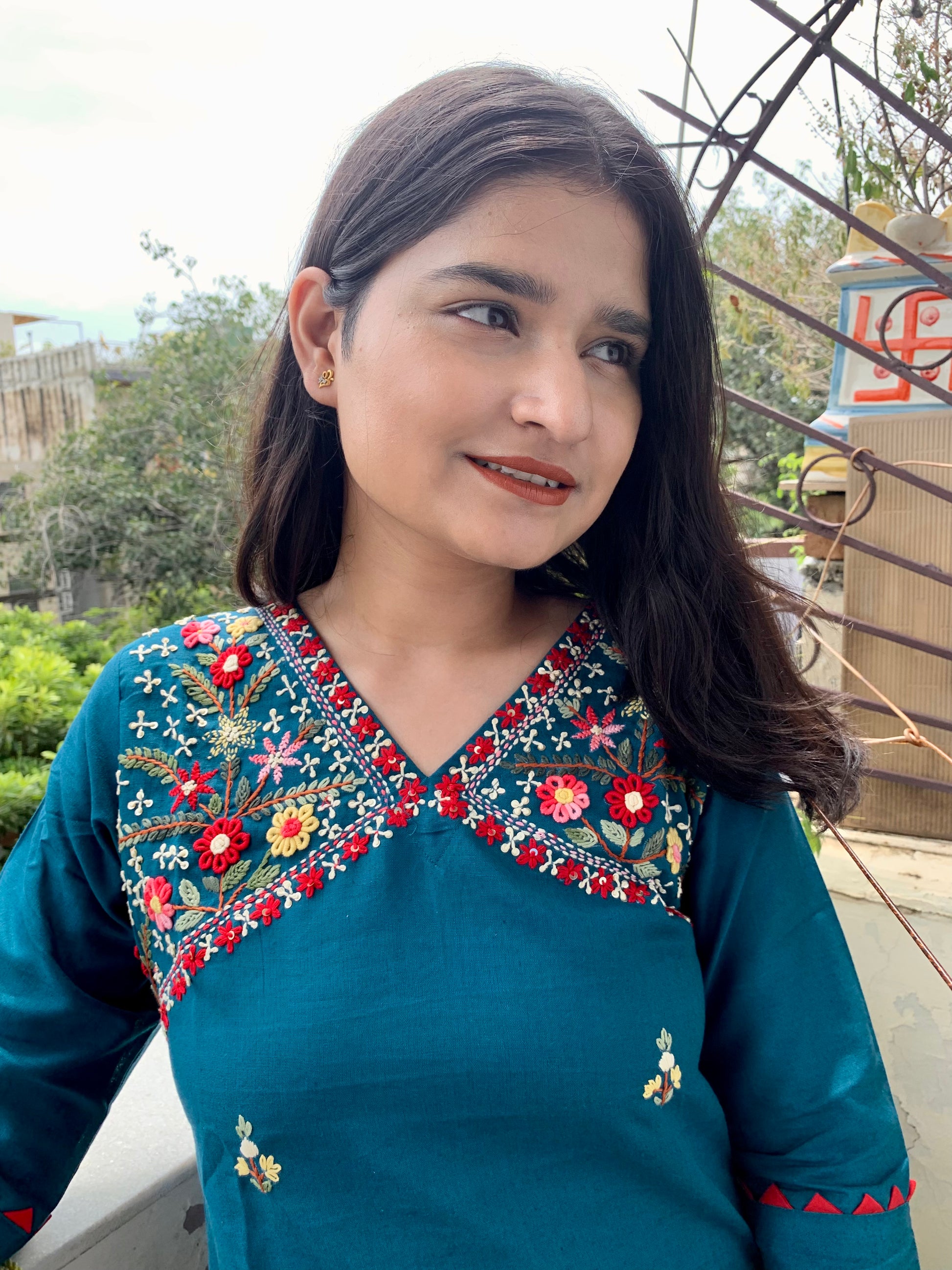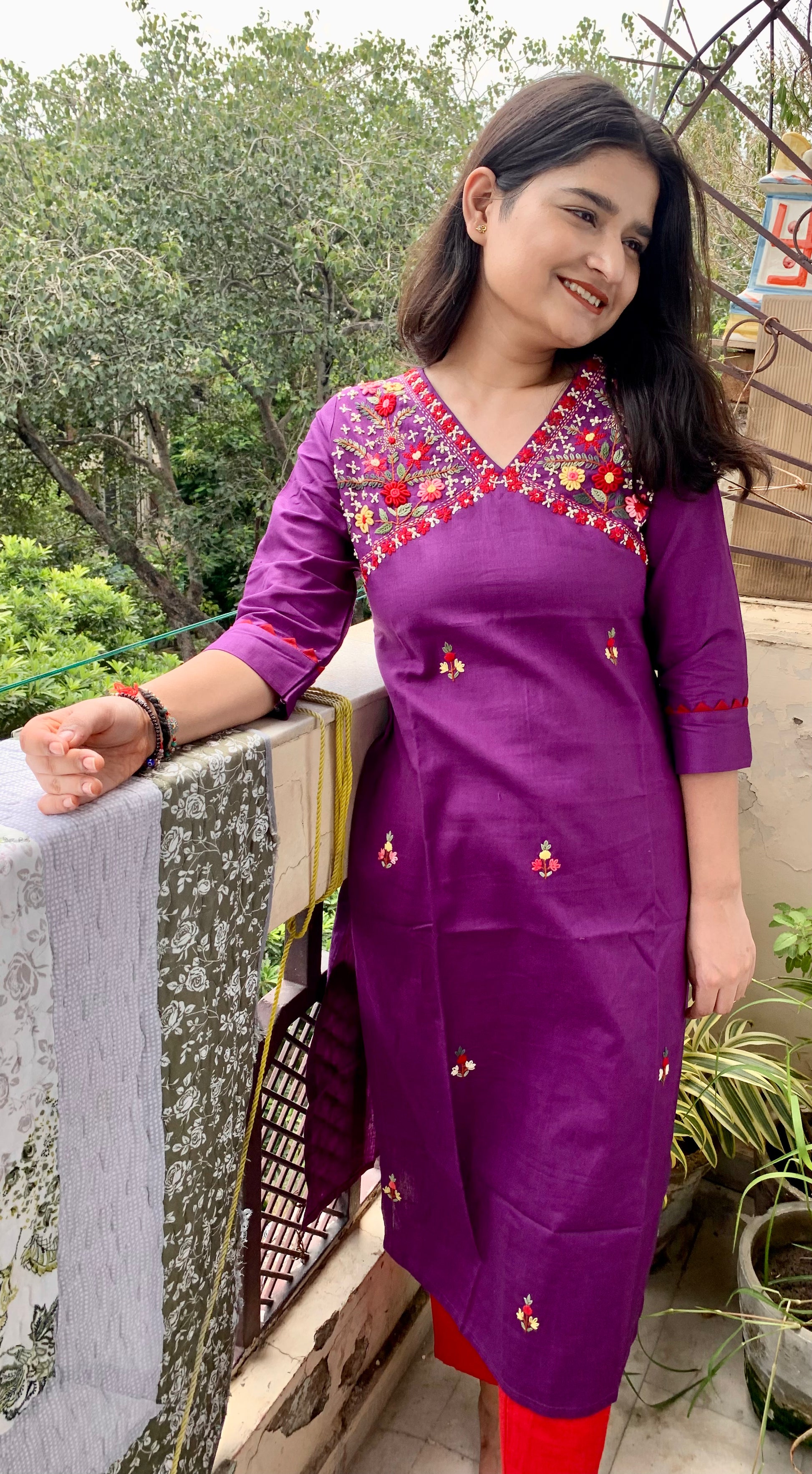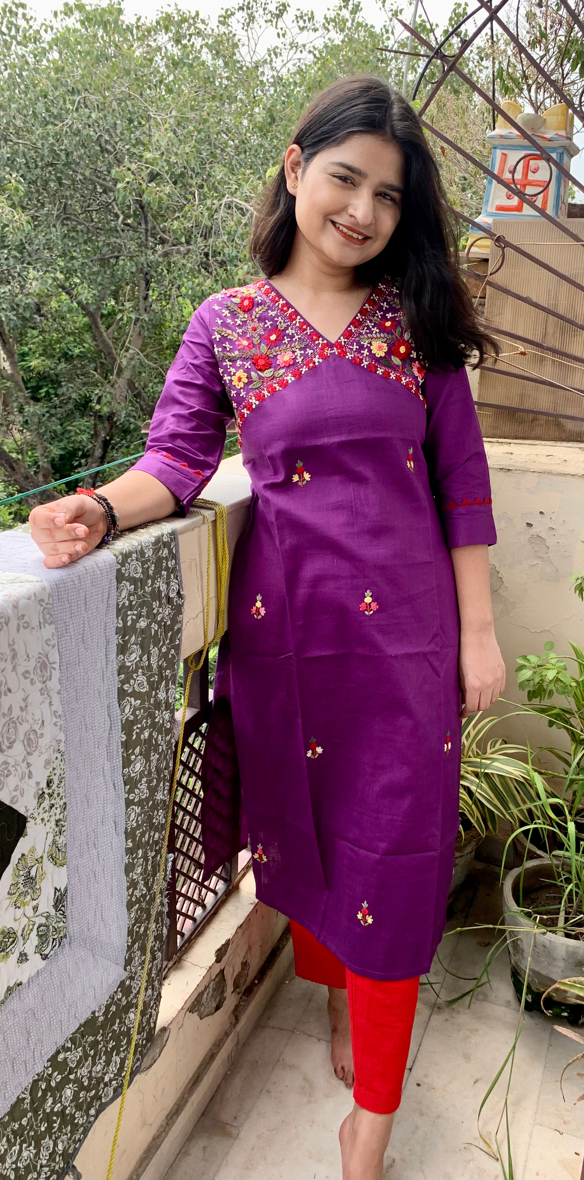 - This stunning kurta design showcases the exquisite hand-embroidered mini lily flowers, adding a touch of elegance to its overall beauty.