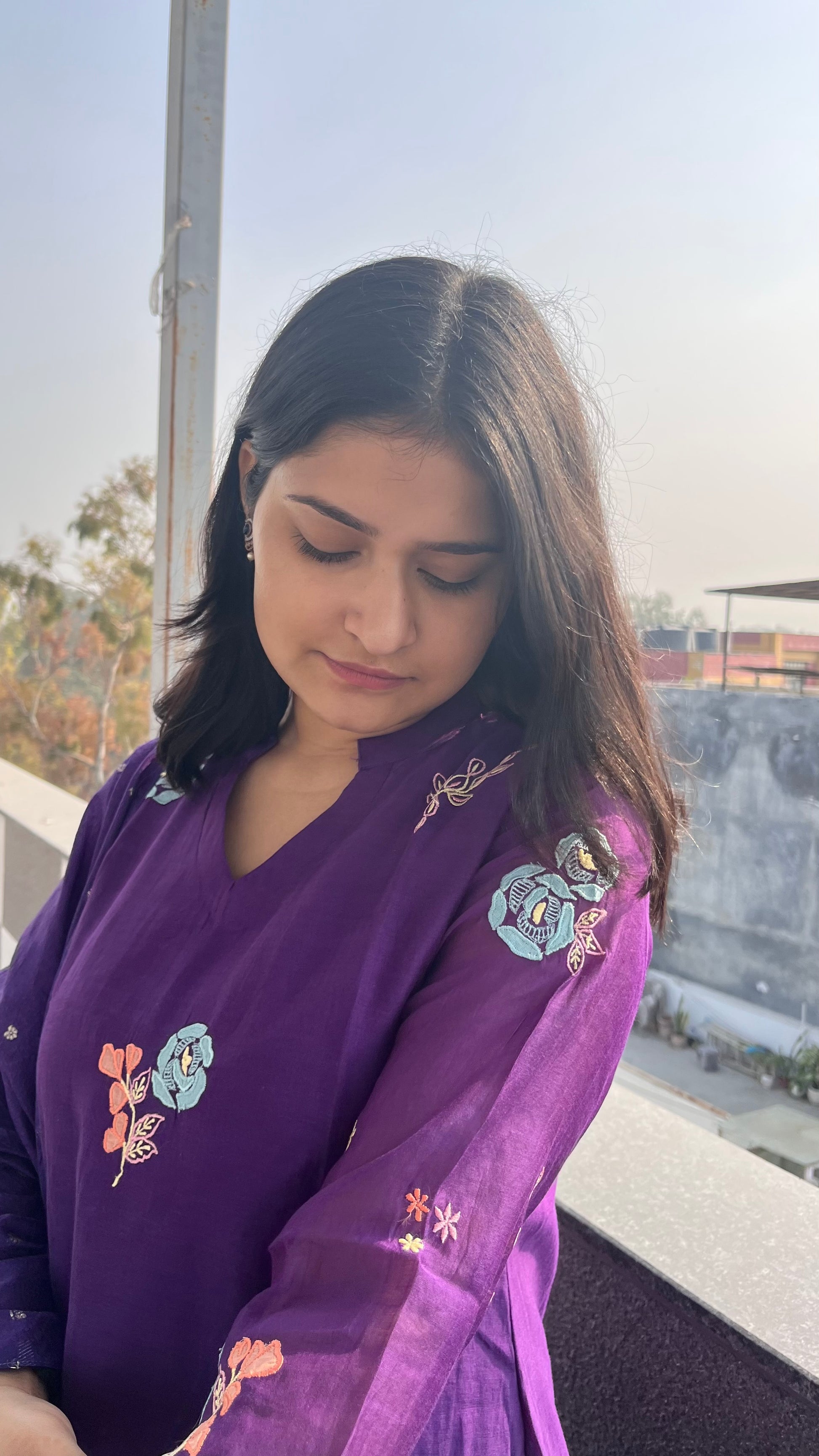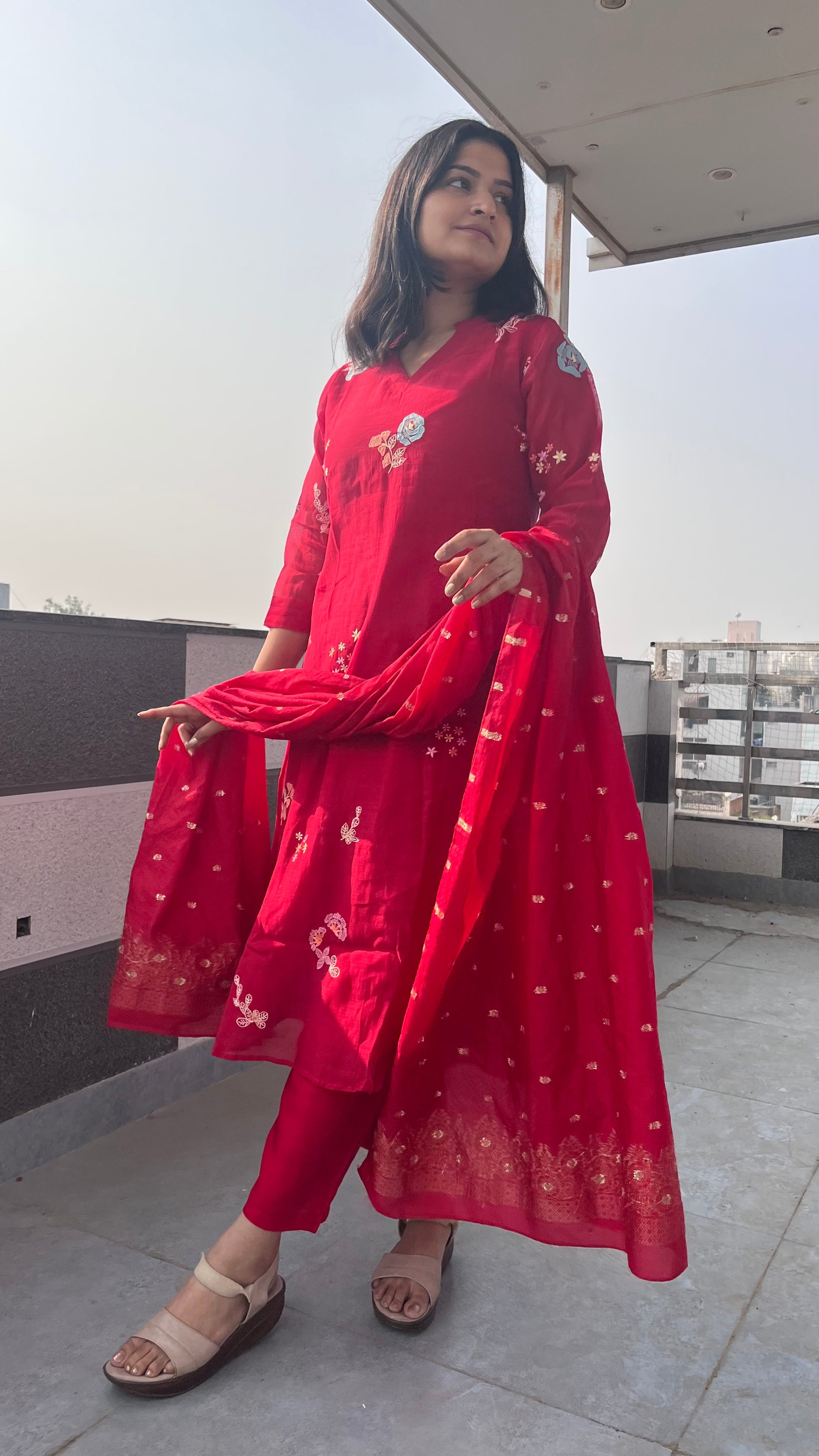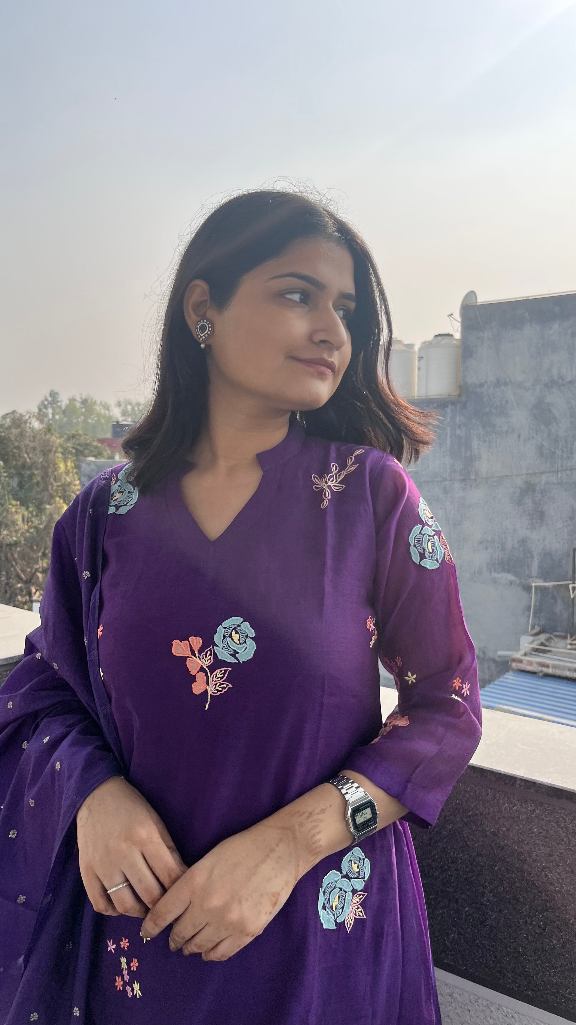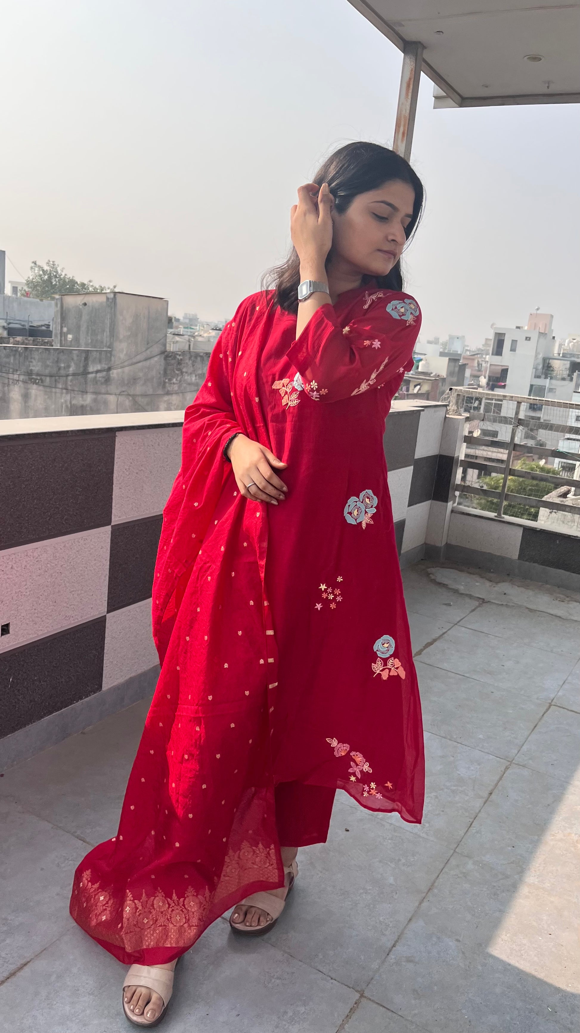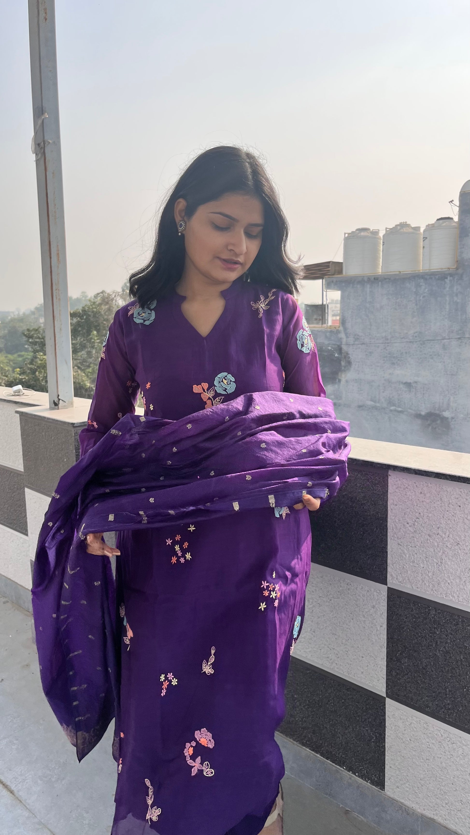 - This exquisite three-piece suit set is crafted from luxurious Mul Chanderi fabric, known for its lightweight, breathable texture and subtle sheen