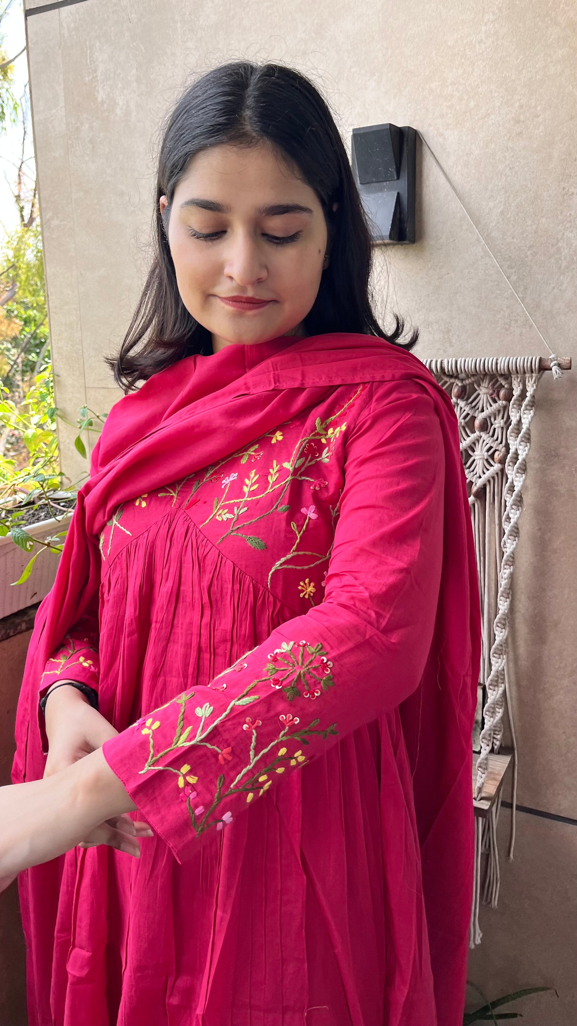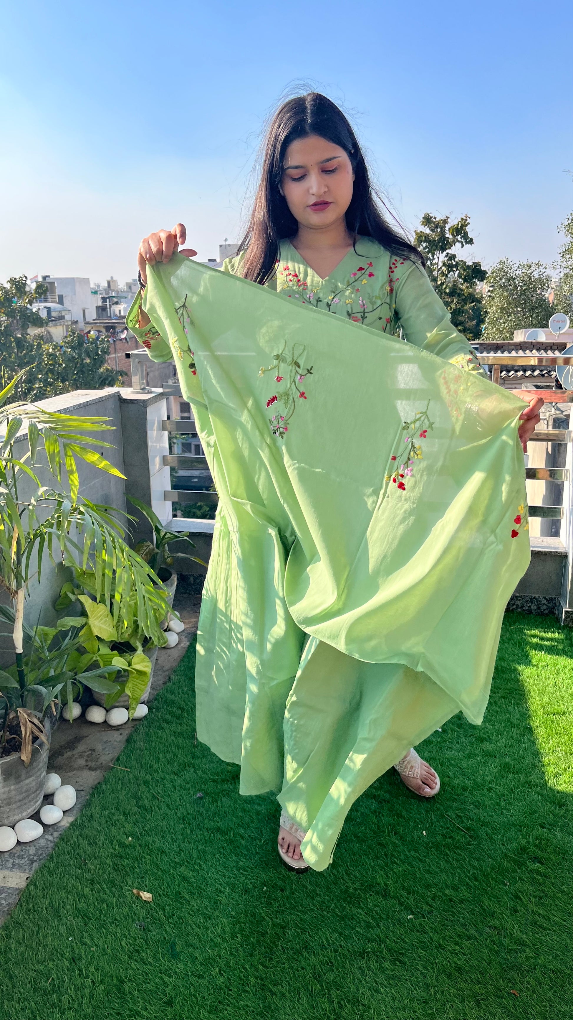 - The exquisite hand embroidery adorns the sleeves, upper suit, bottom of the pants, and dupatta