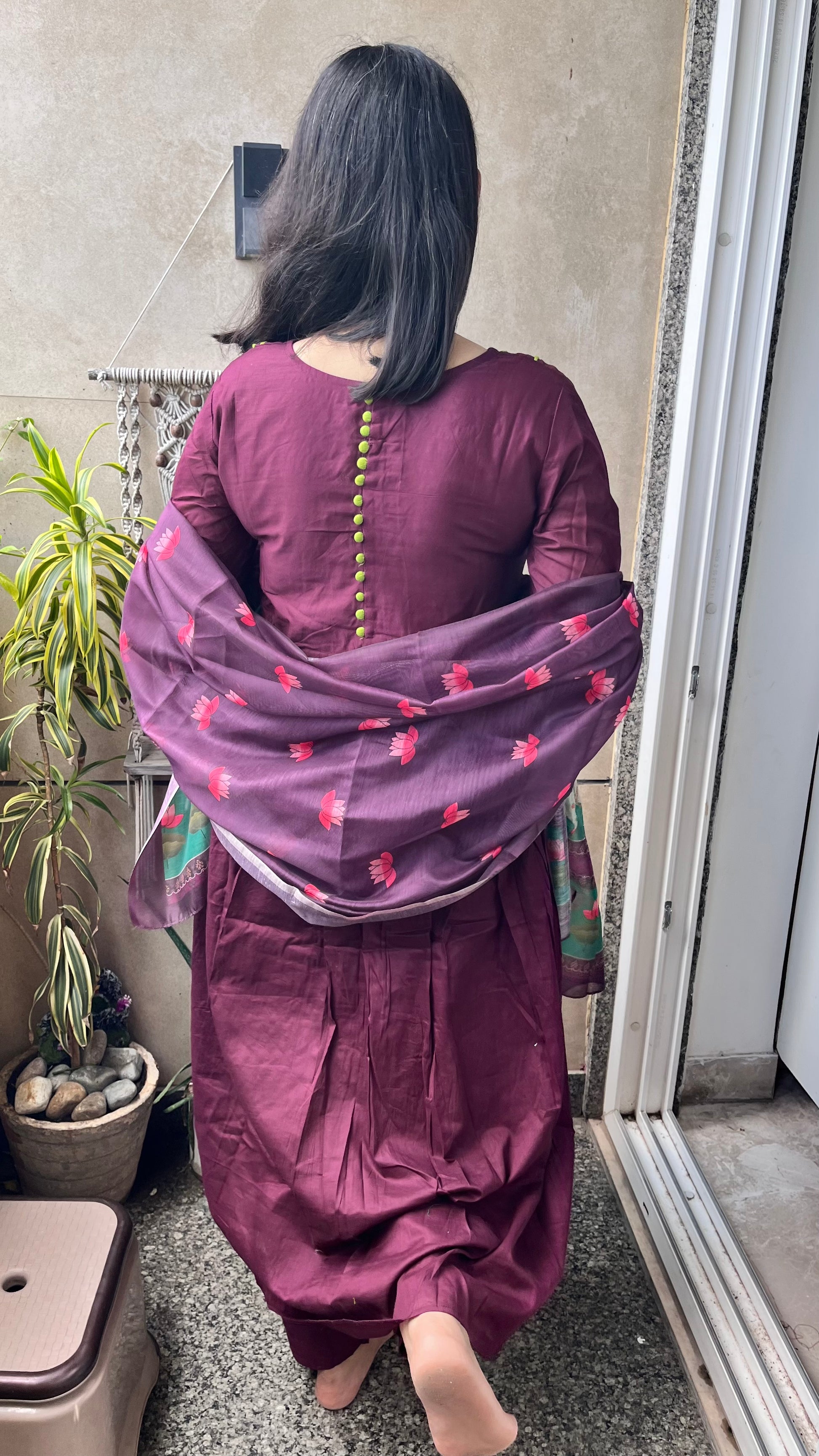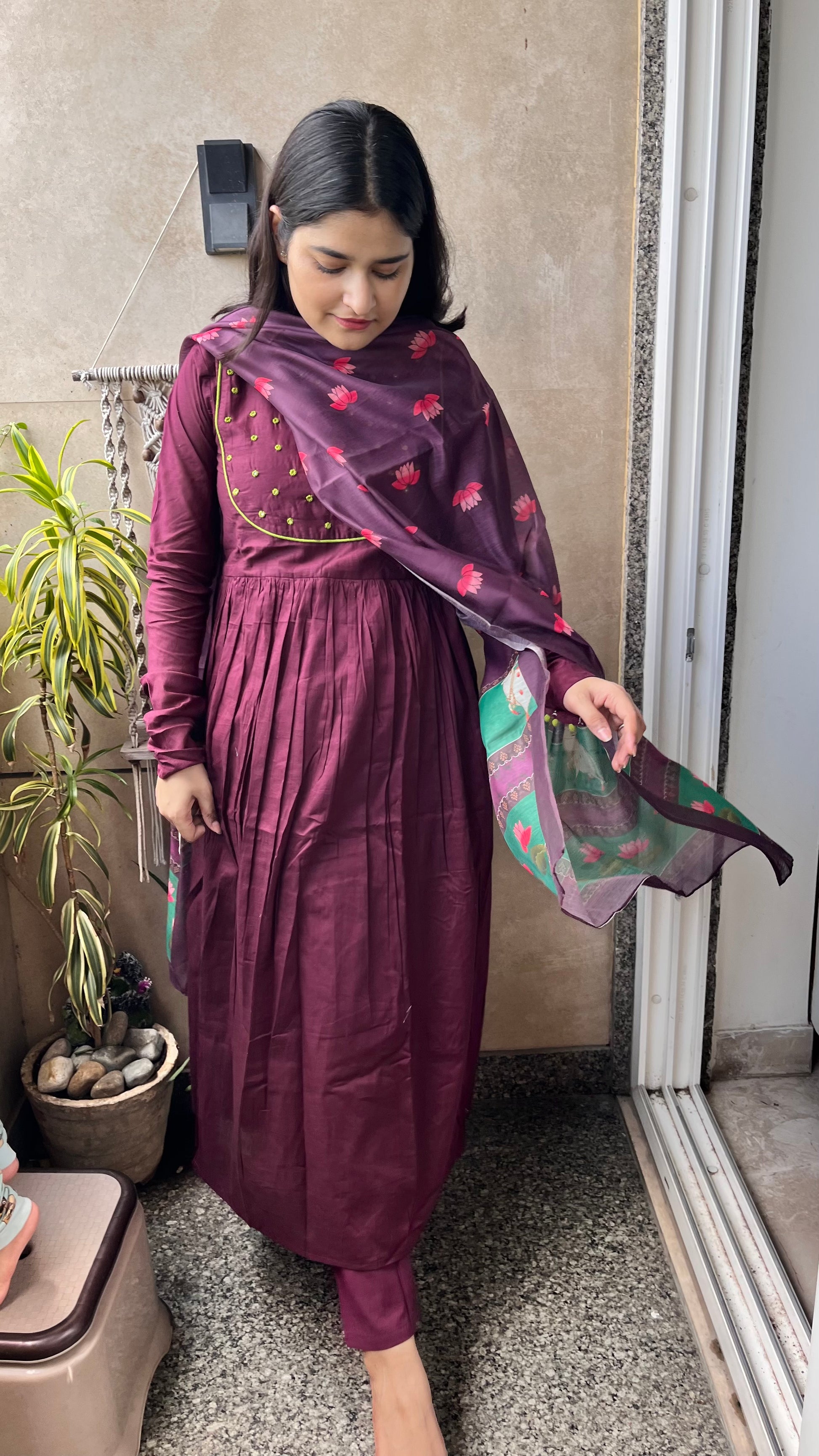 The neck design is intricate yet graceful, and the churidar sleeves offer a traditional yet chic touch, making this outfit perfect for both casual and festive occasions.