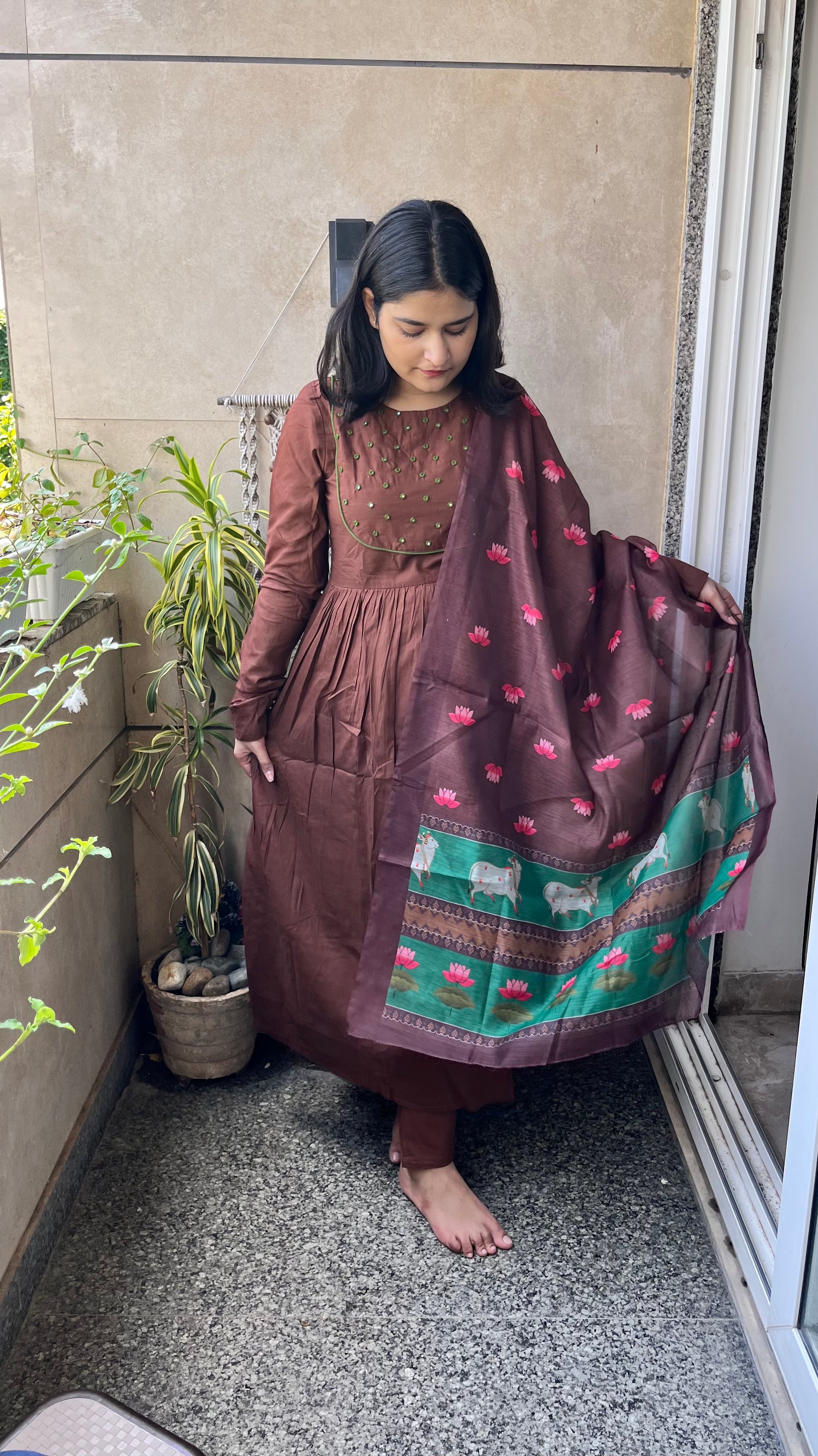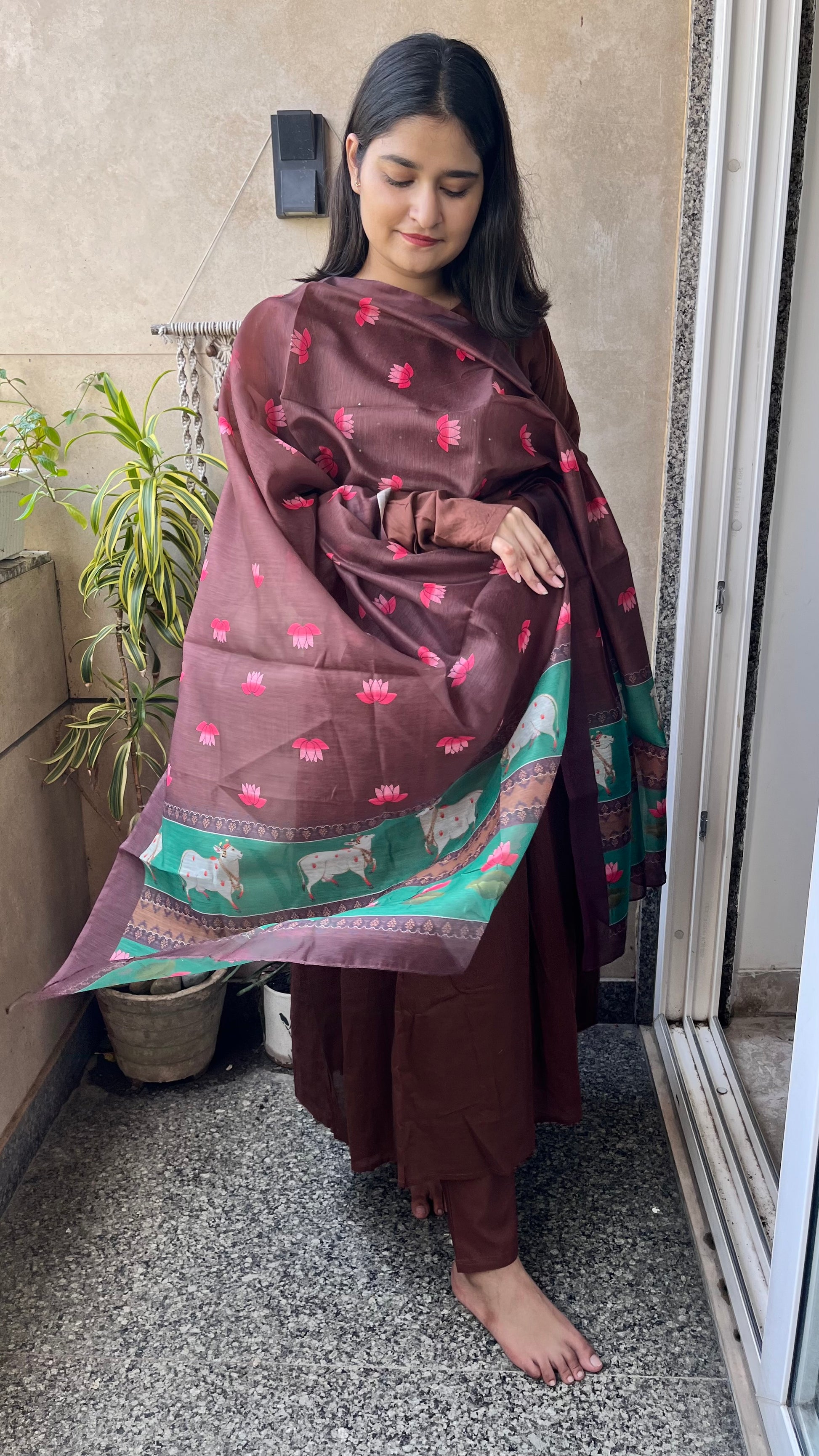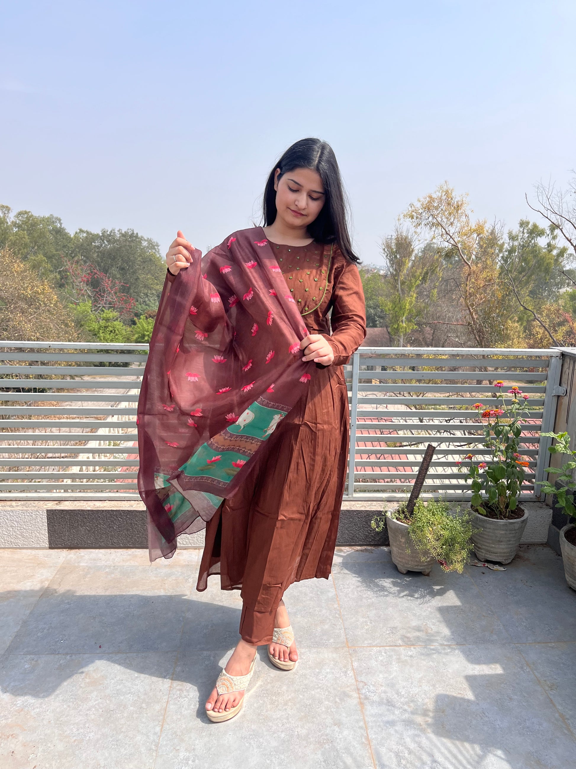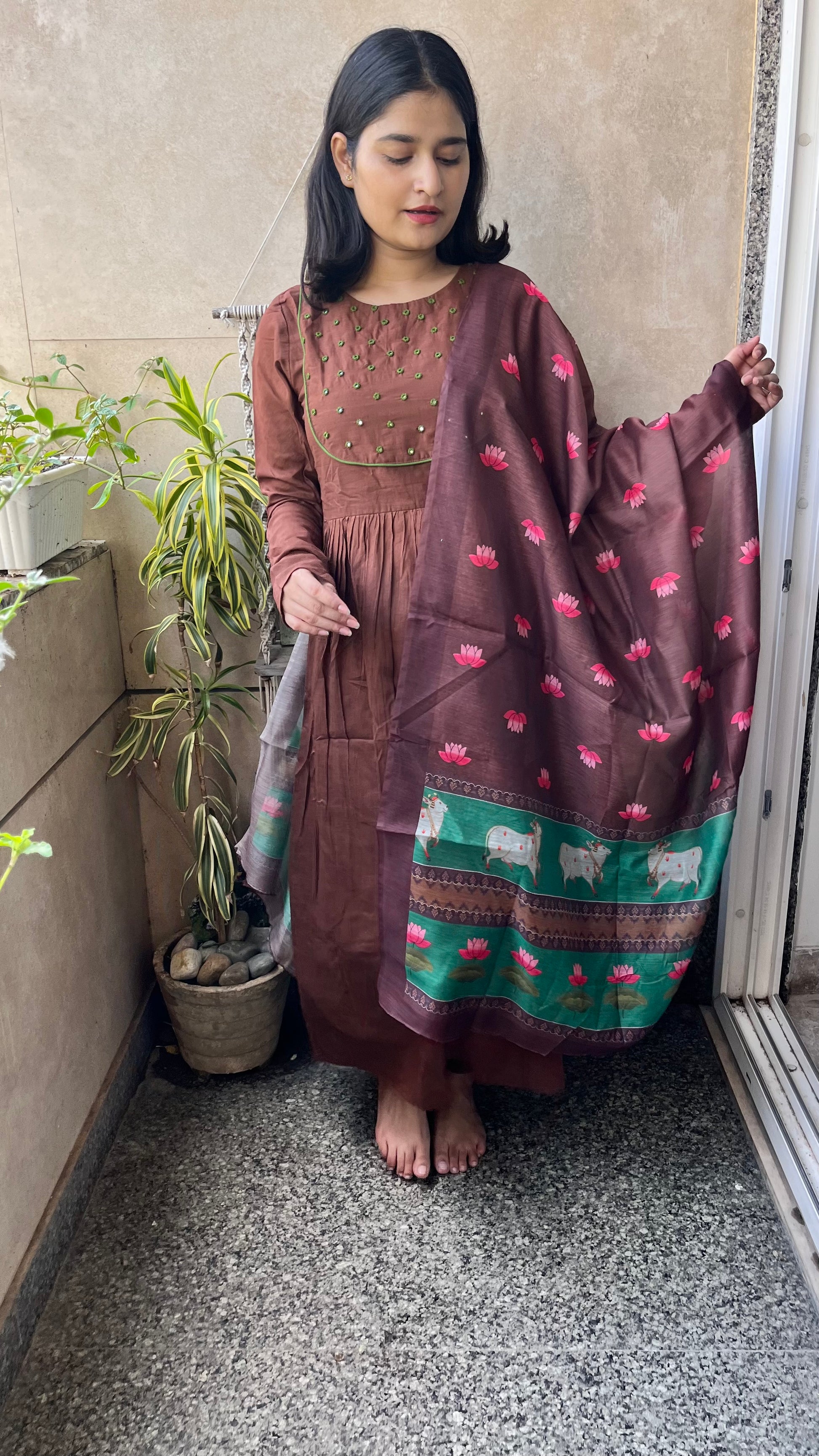 The ensemble features a flowing brown kurta paired with matching pants.