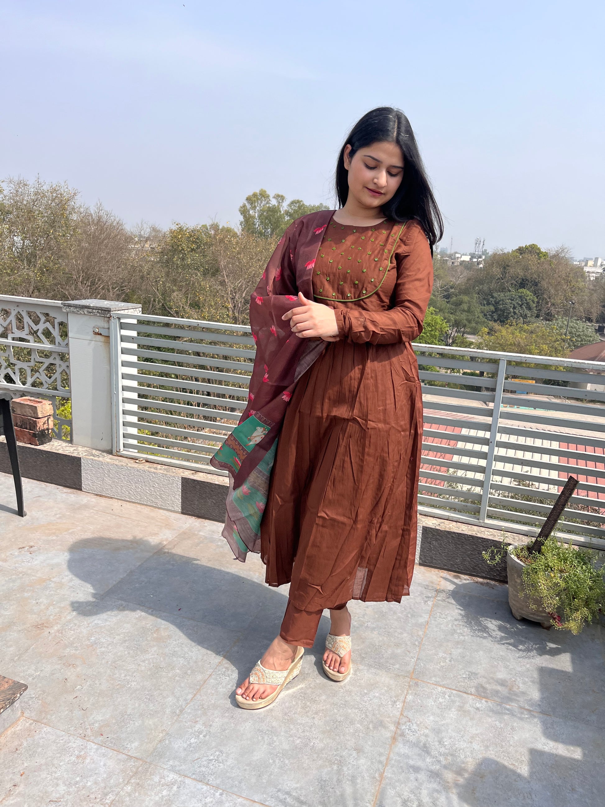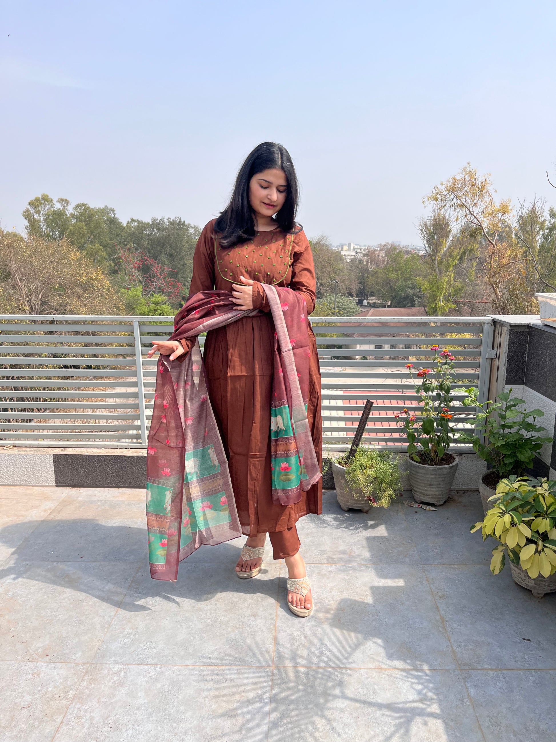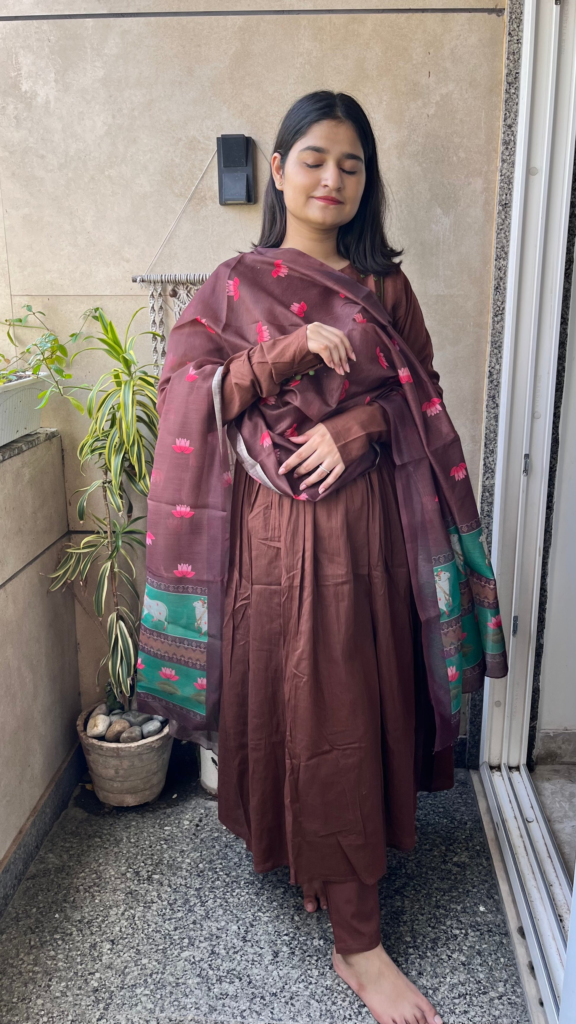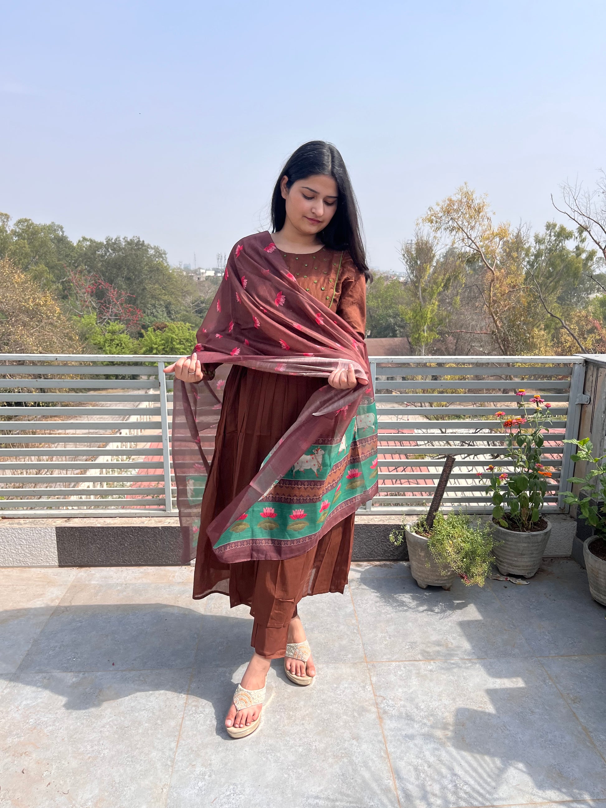 The ensemble features a flowing brown kurta paired with matching pants.