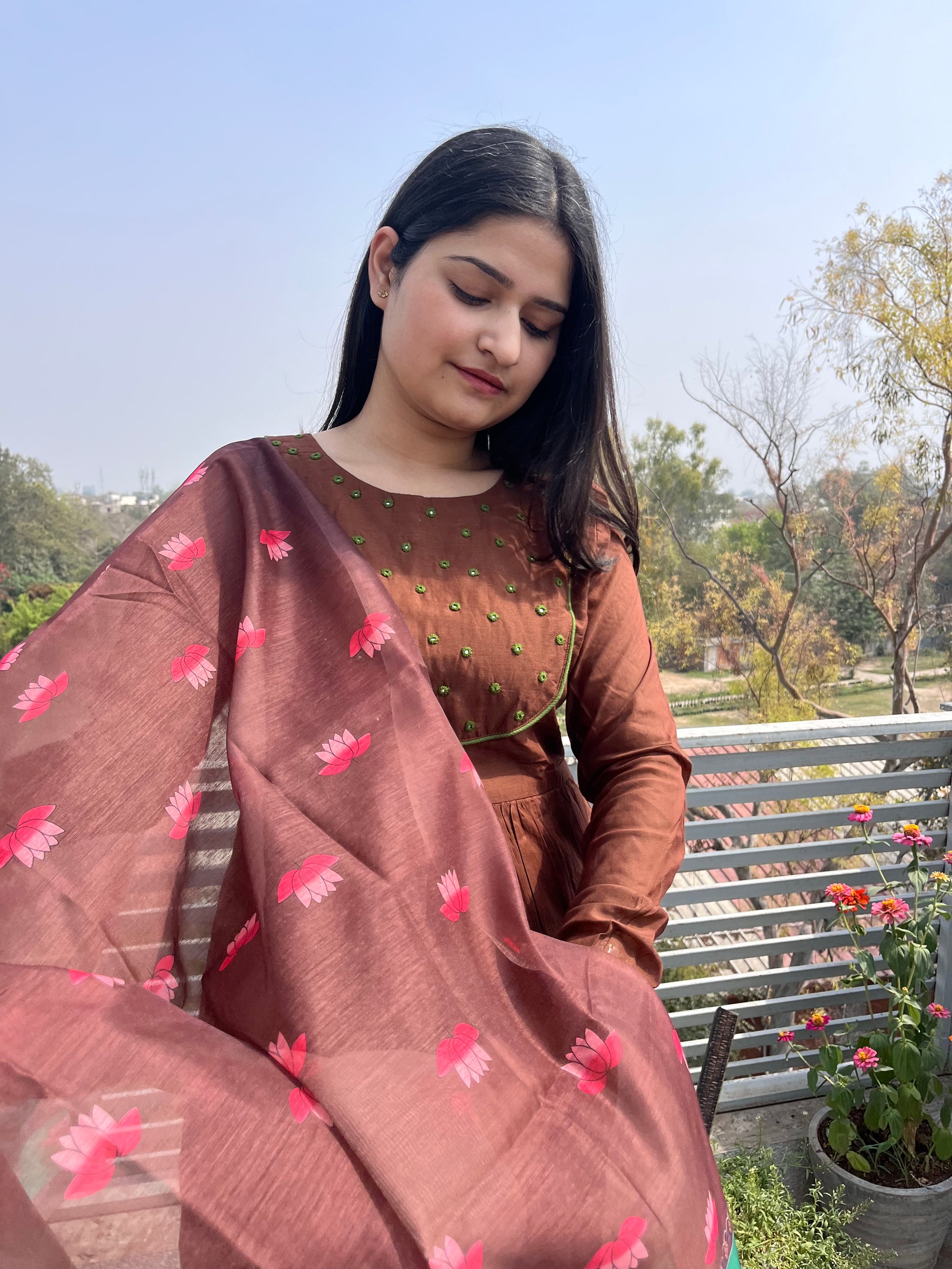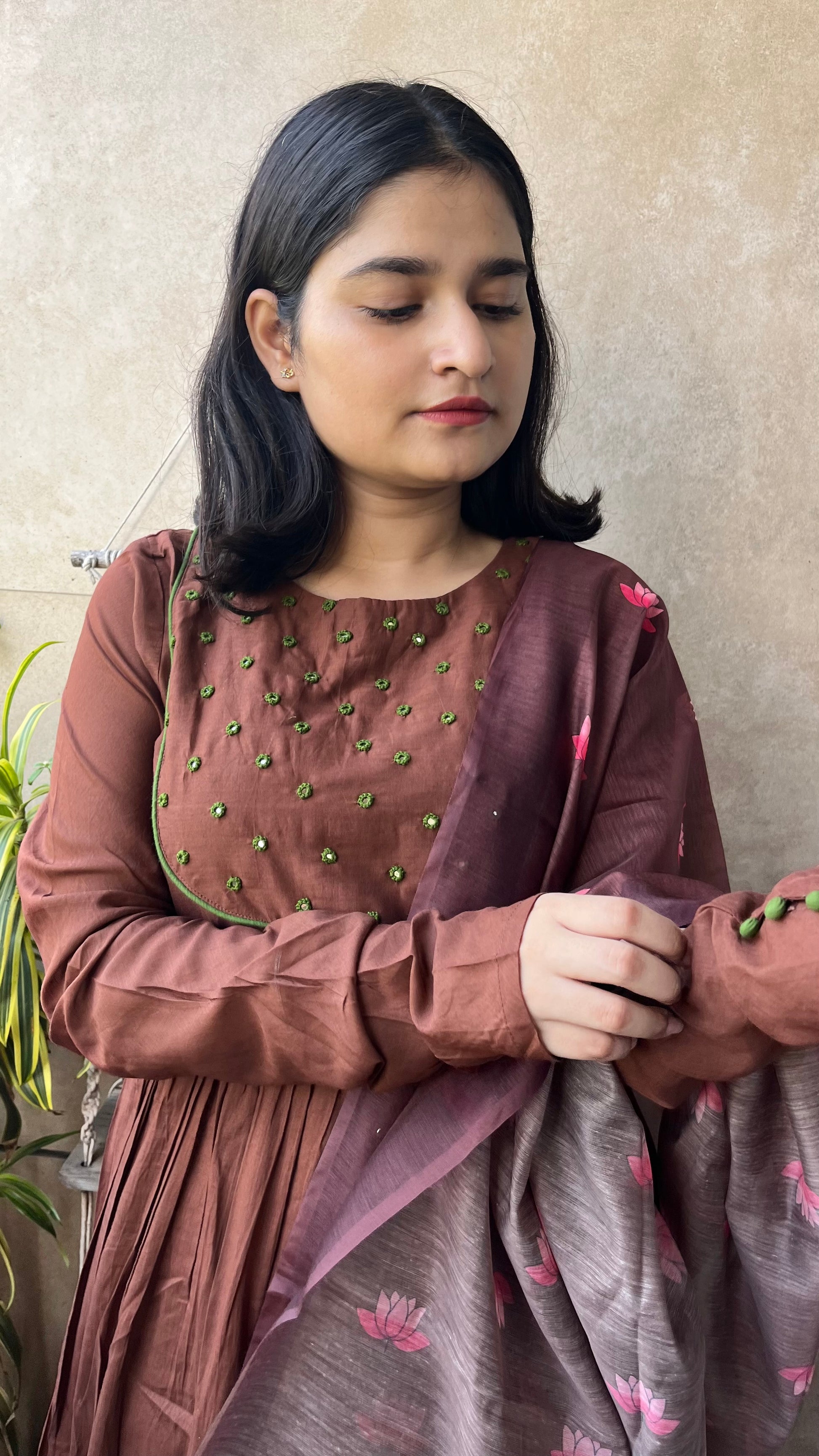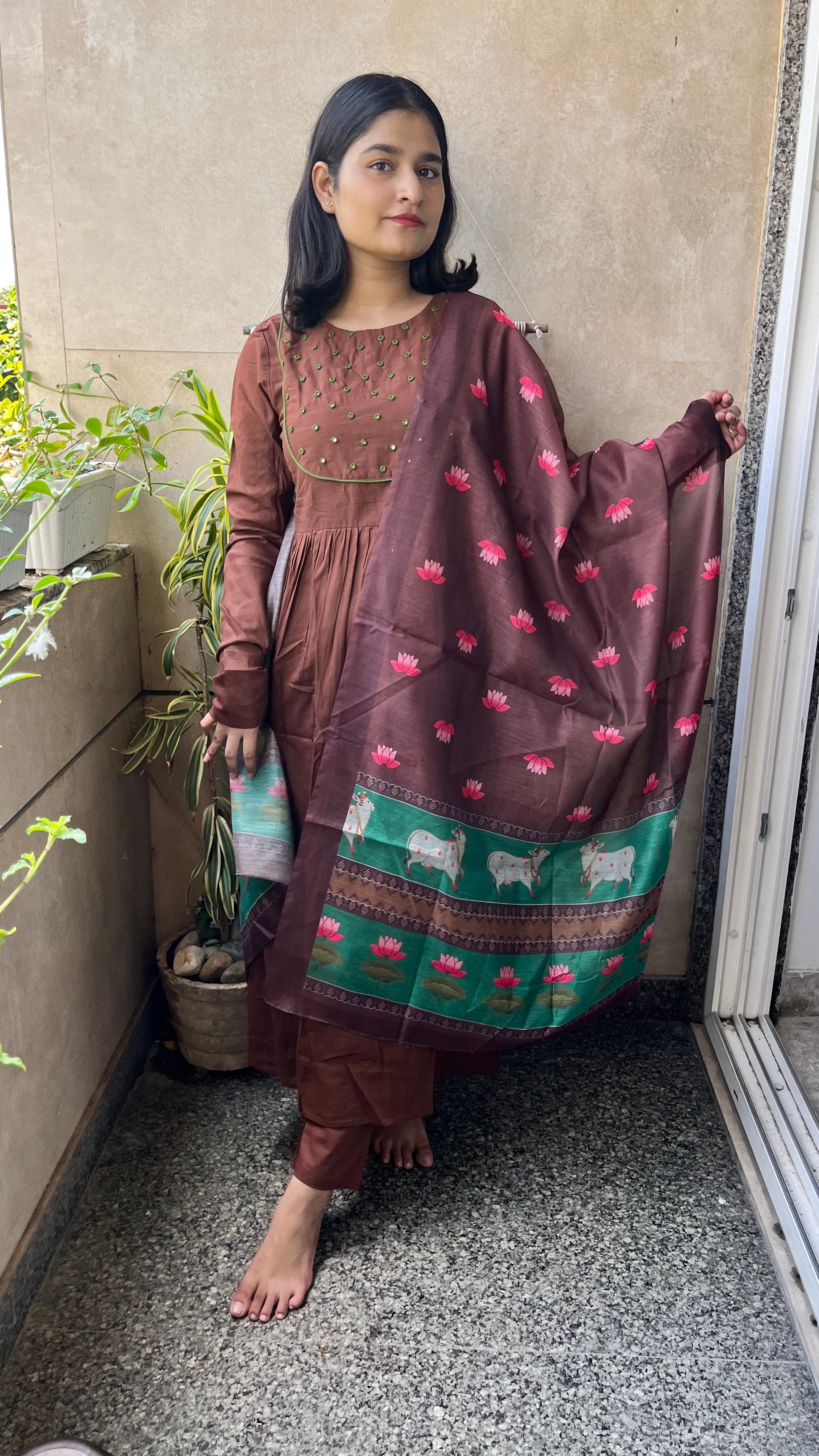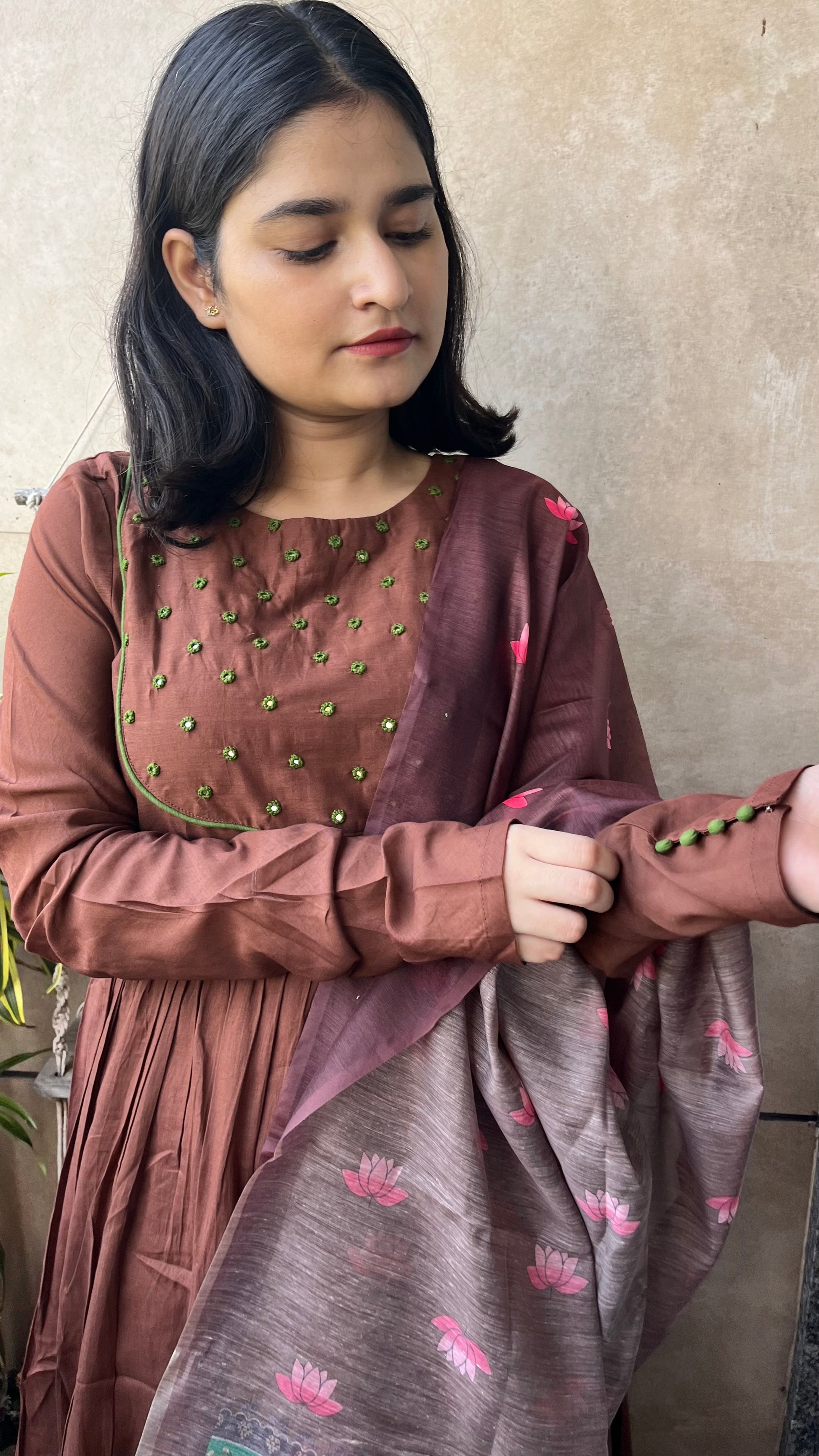The ensemble features a flowing brown kurta paired with matching pants.