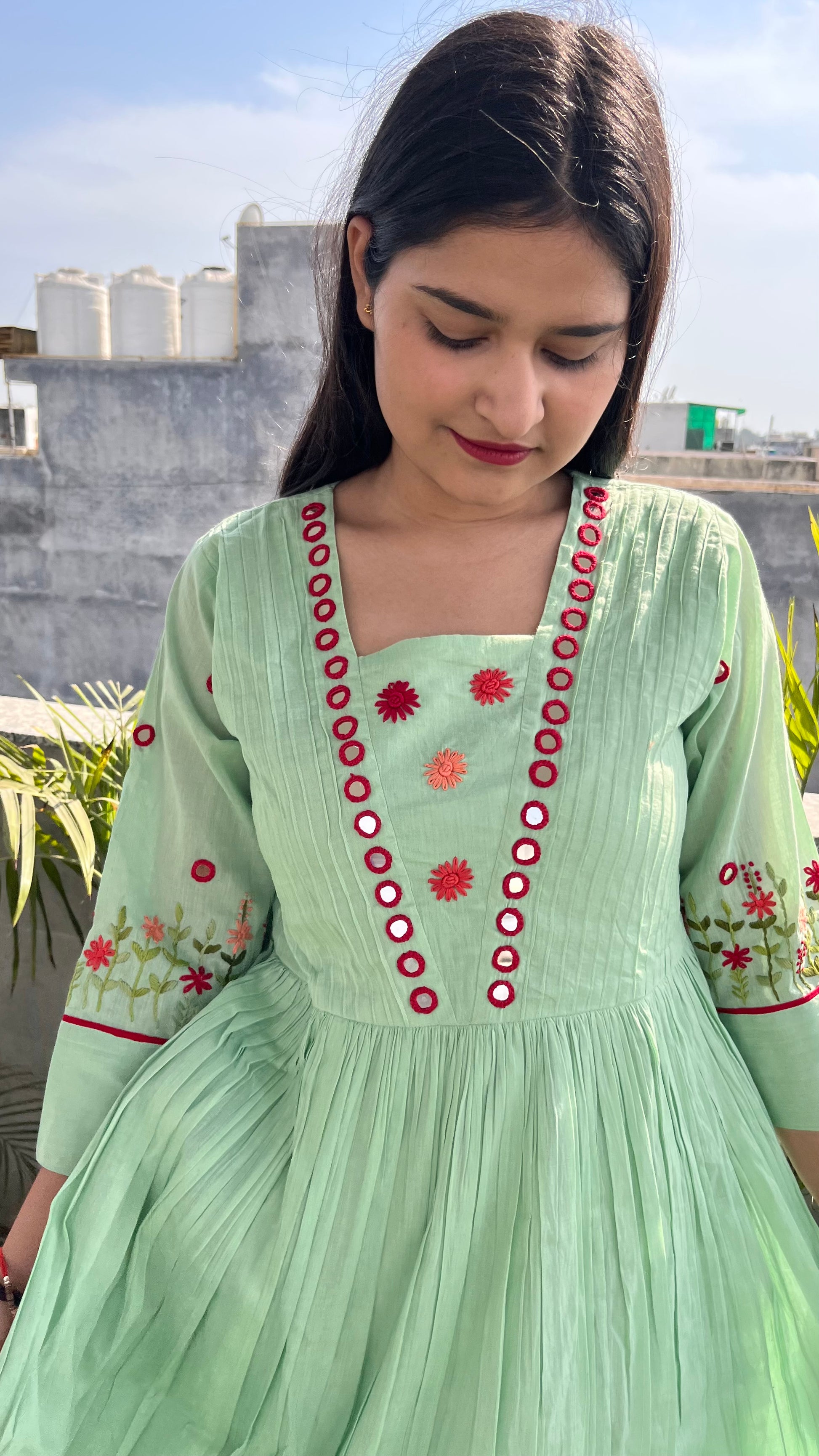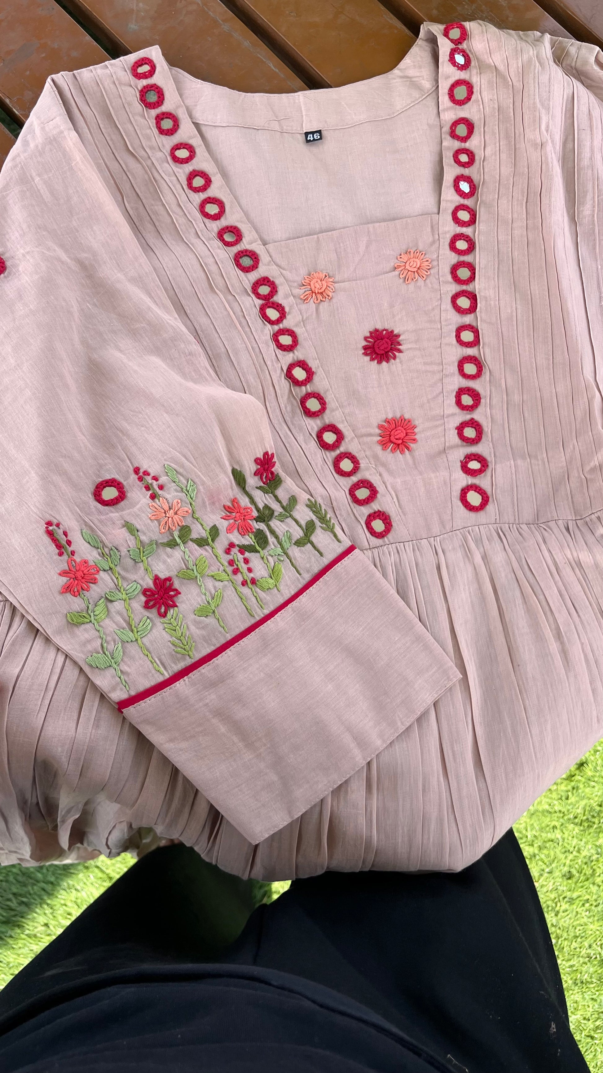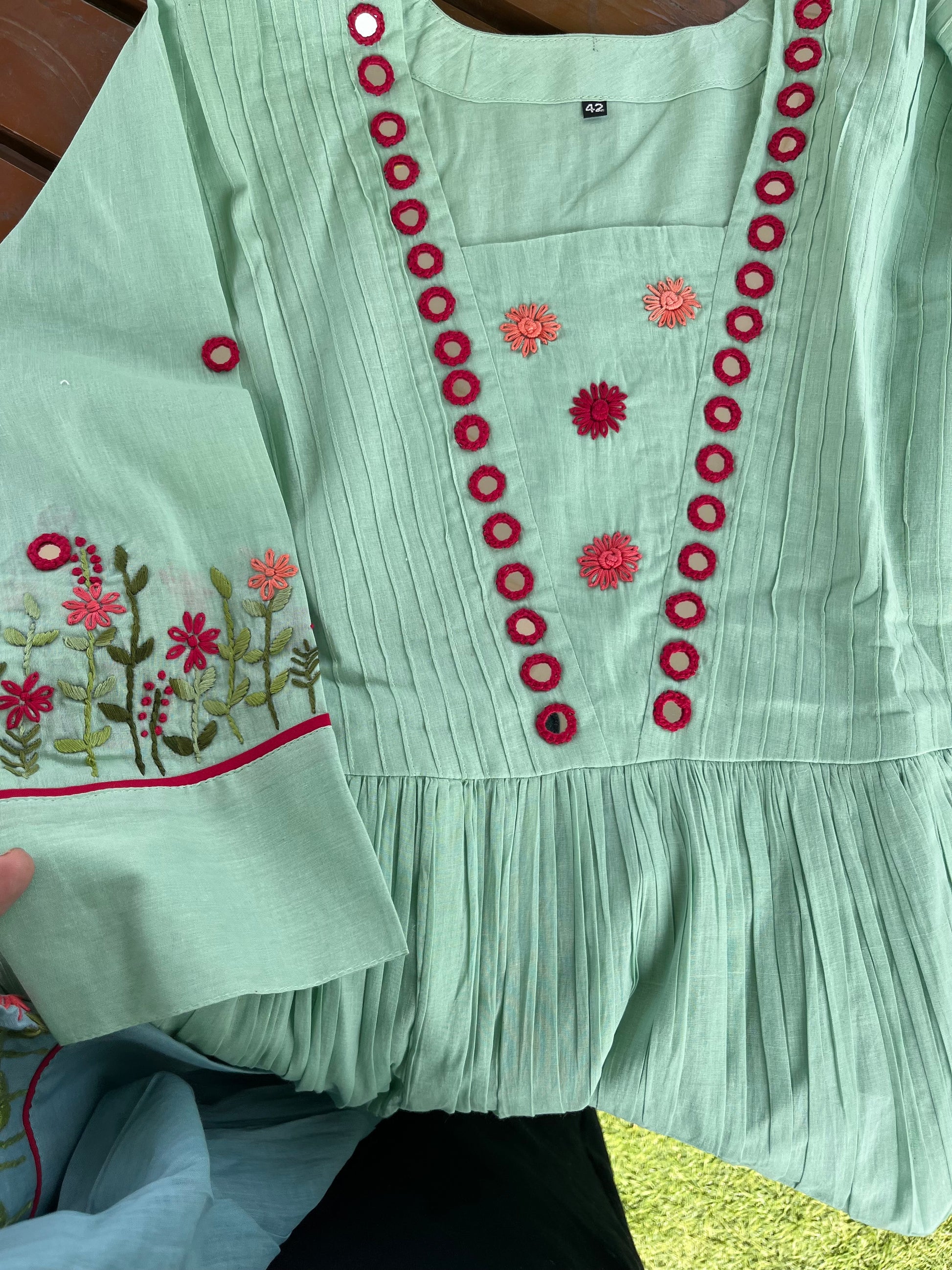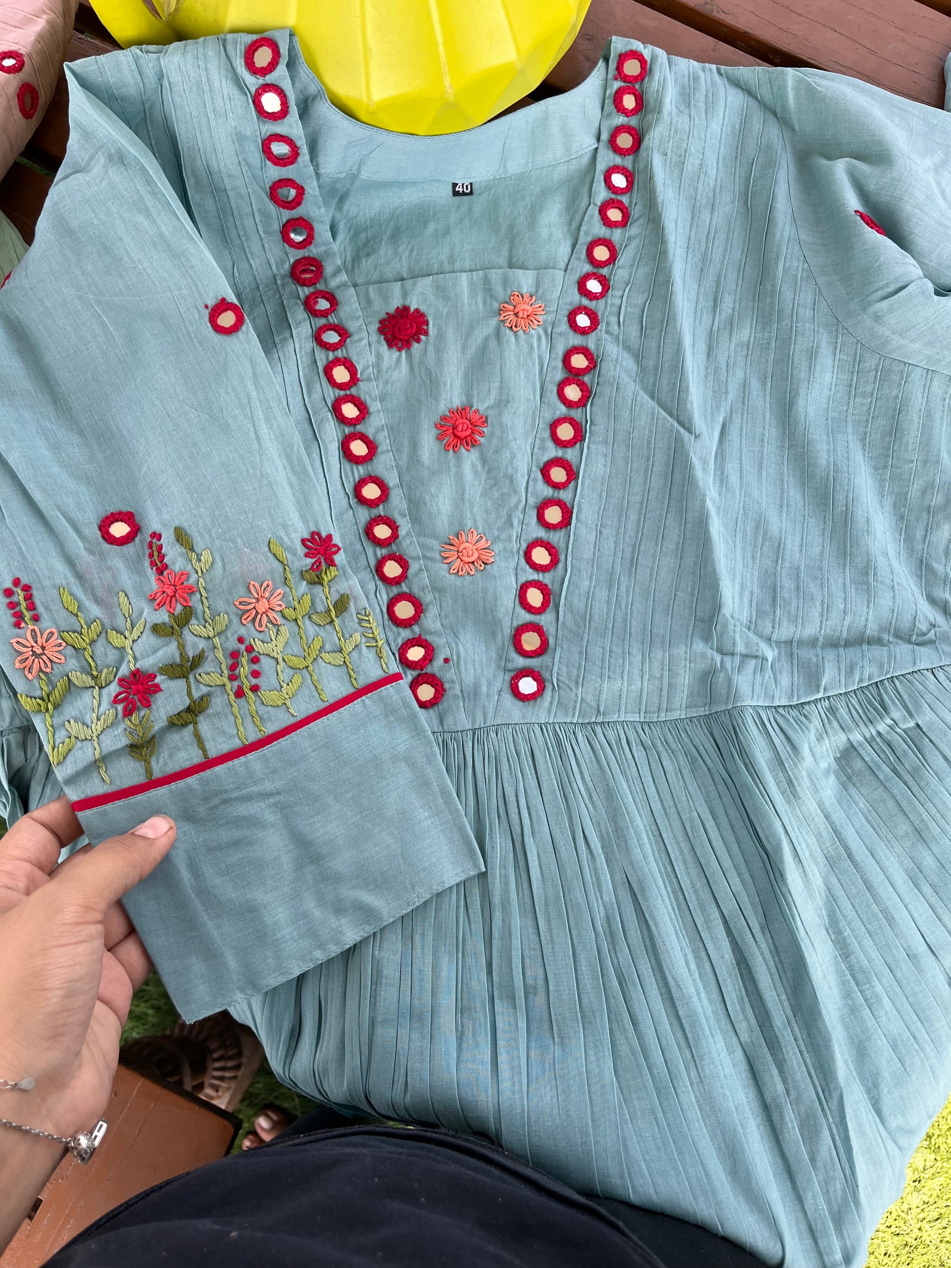 - The design features delicate hand embroidery, showcasing intricate floral patterns on the sleeves and bodice.
