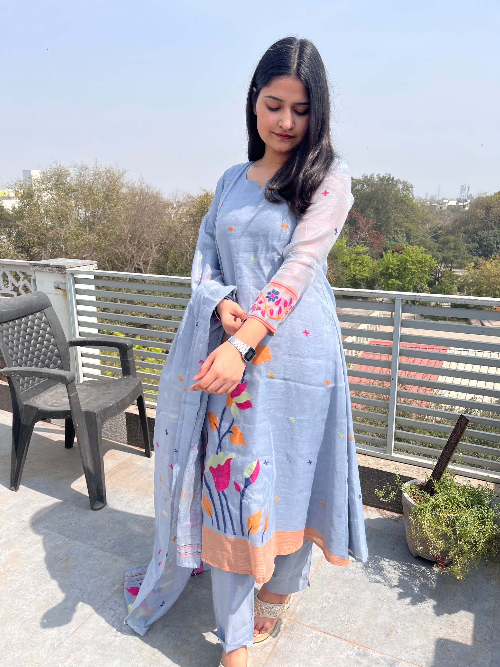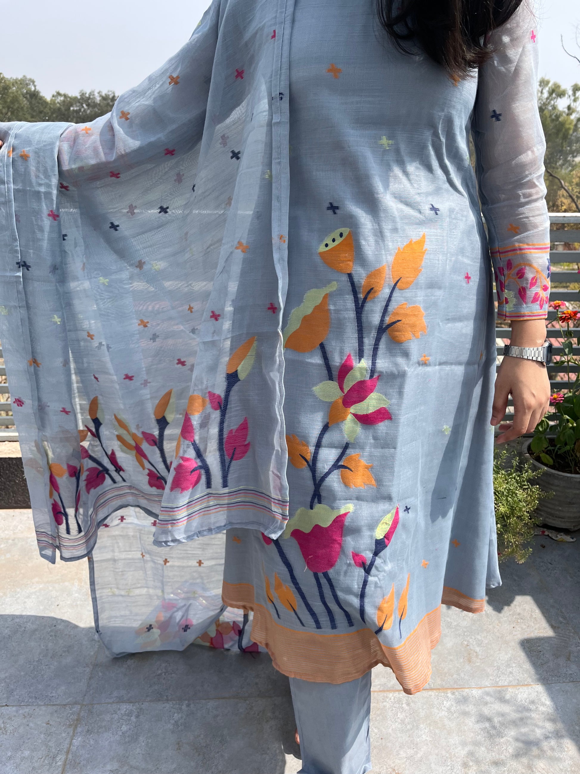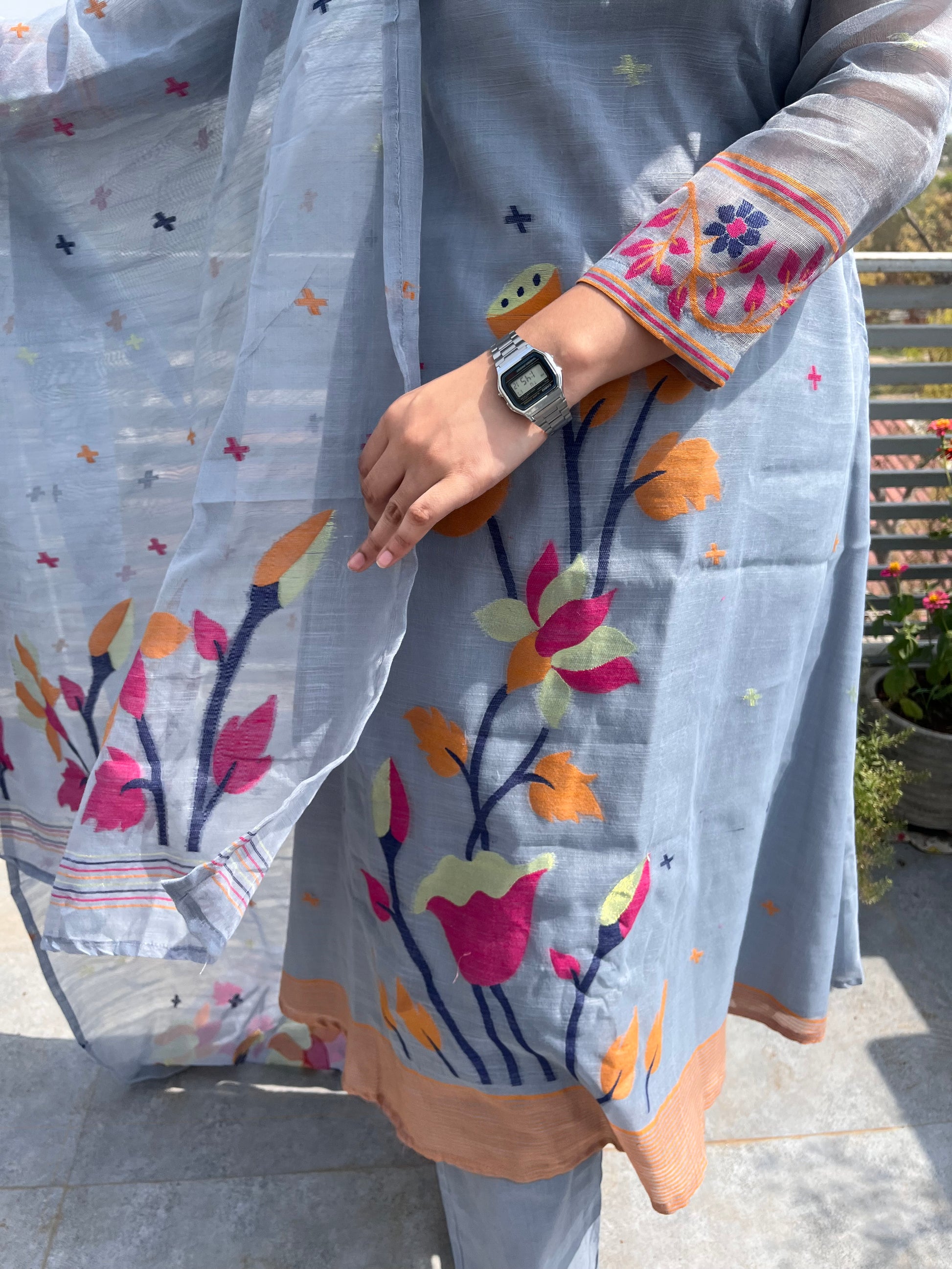 - Jamdani 3 piece suit set features woven jamdani floral patterns.