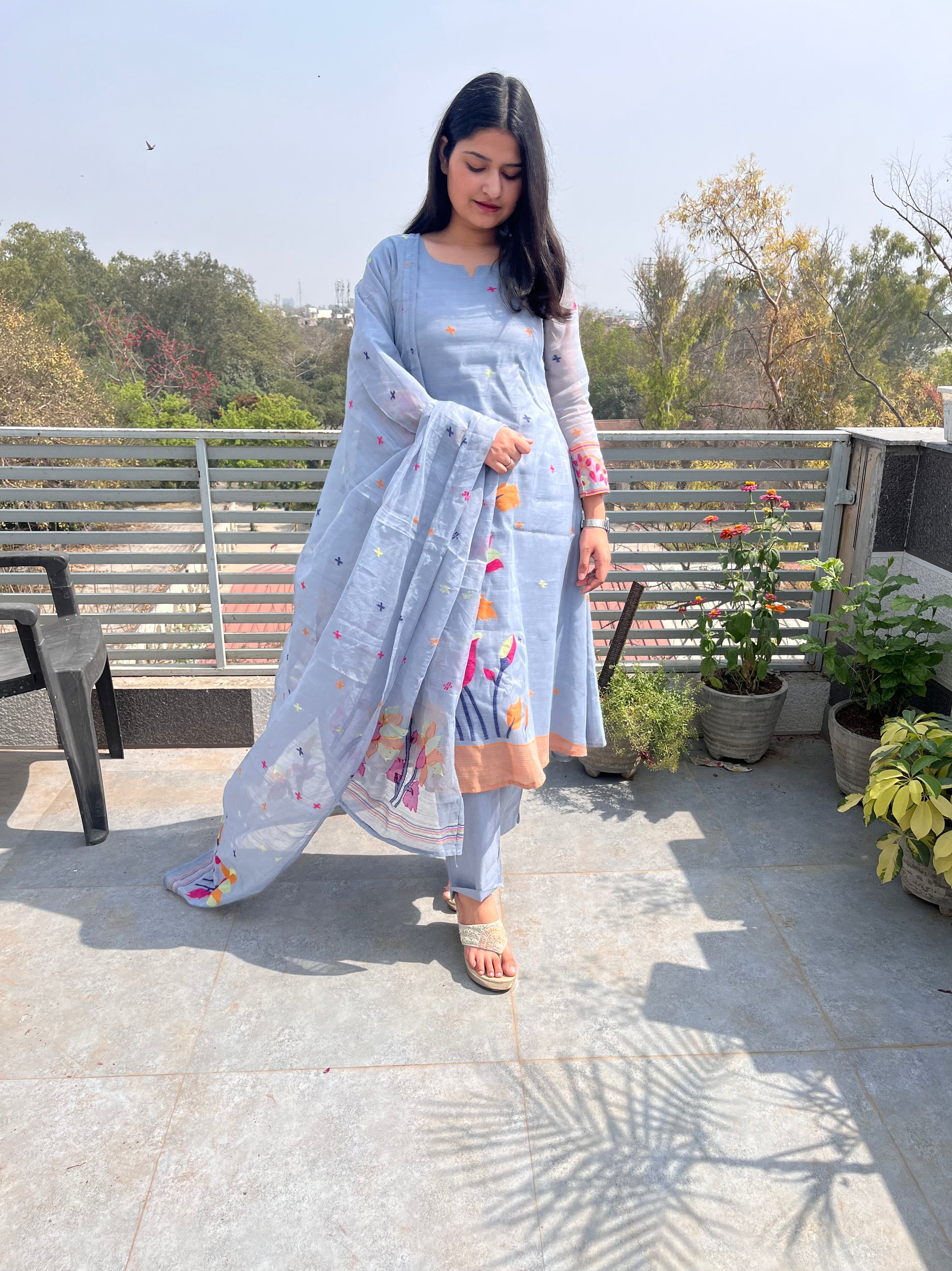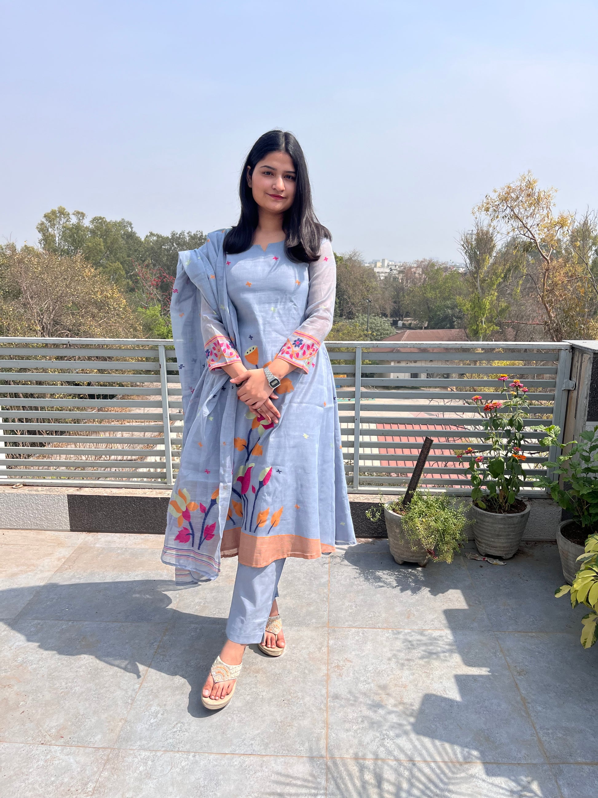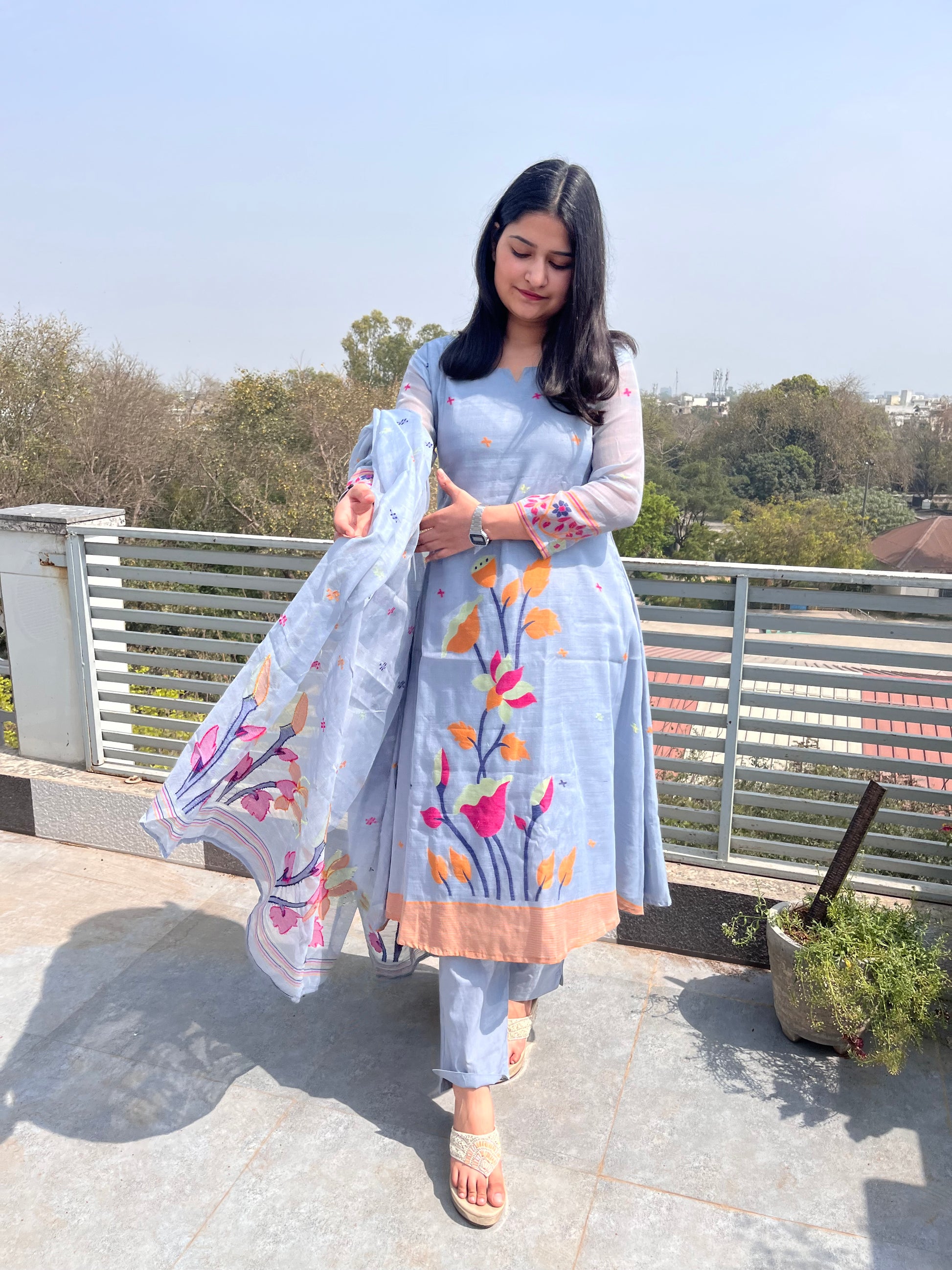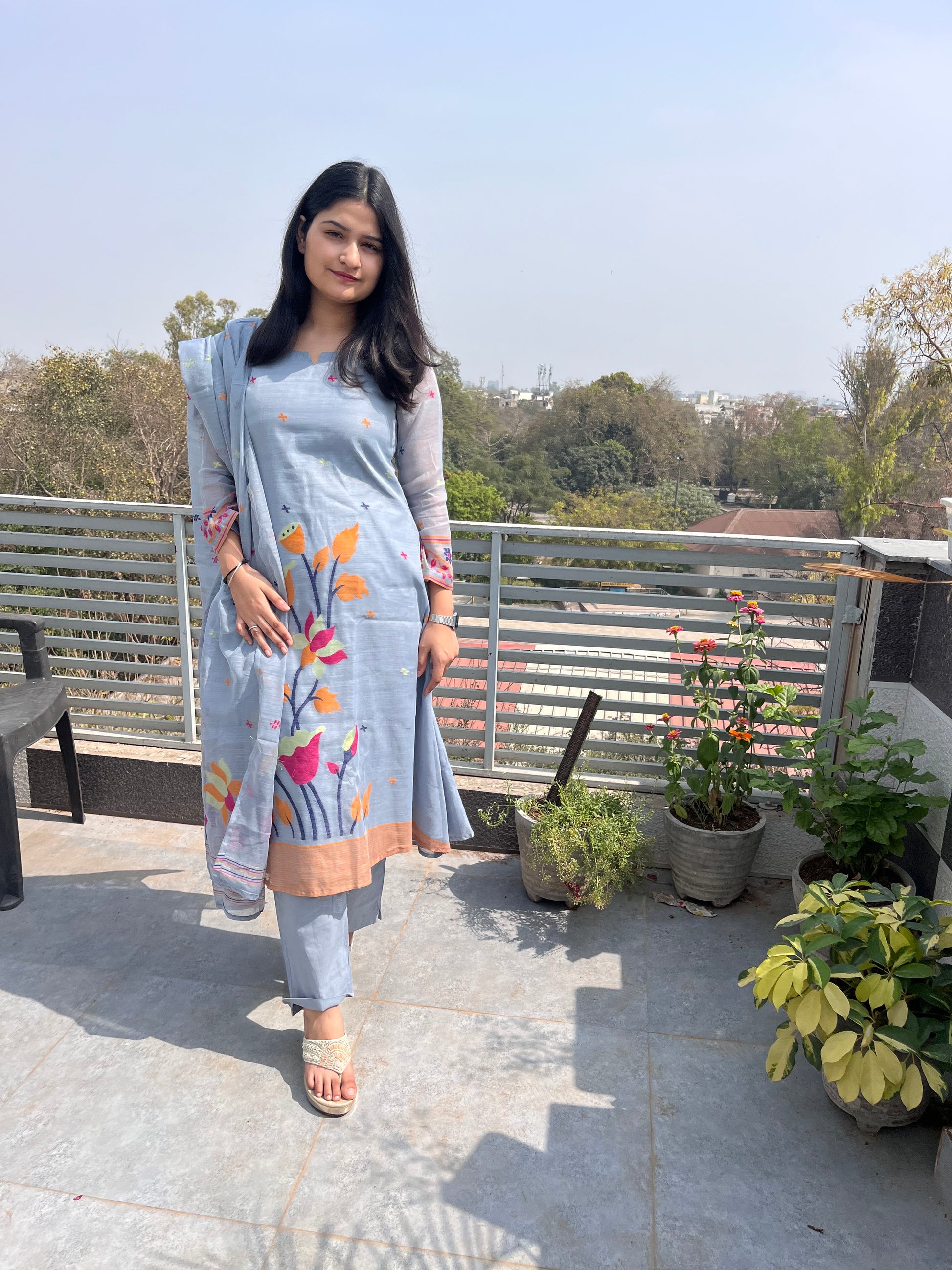 - Jamdani 3 piece suit set features woven jamdani floral patterns.