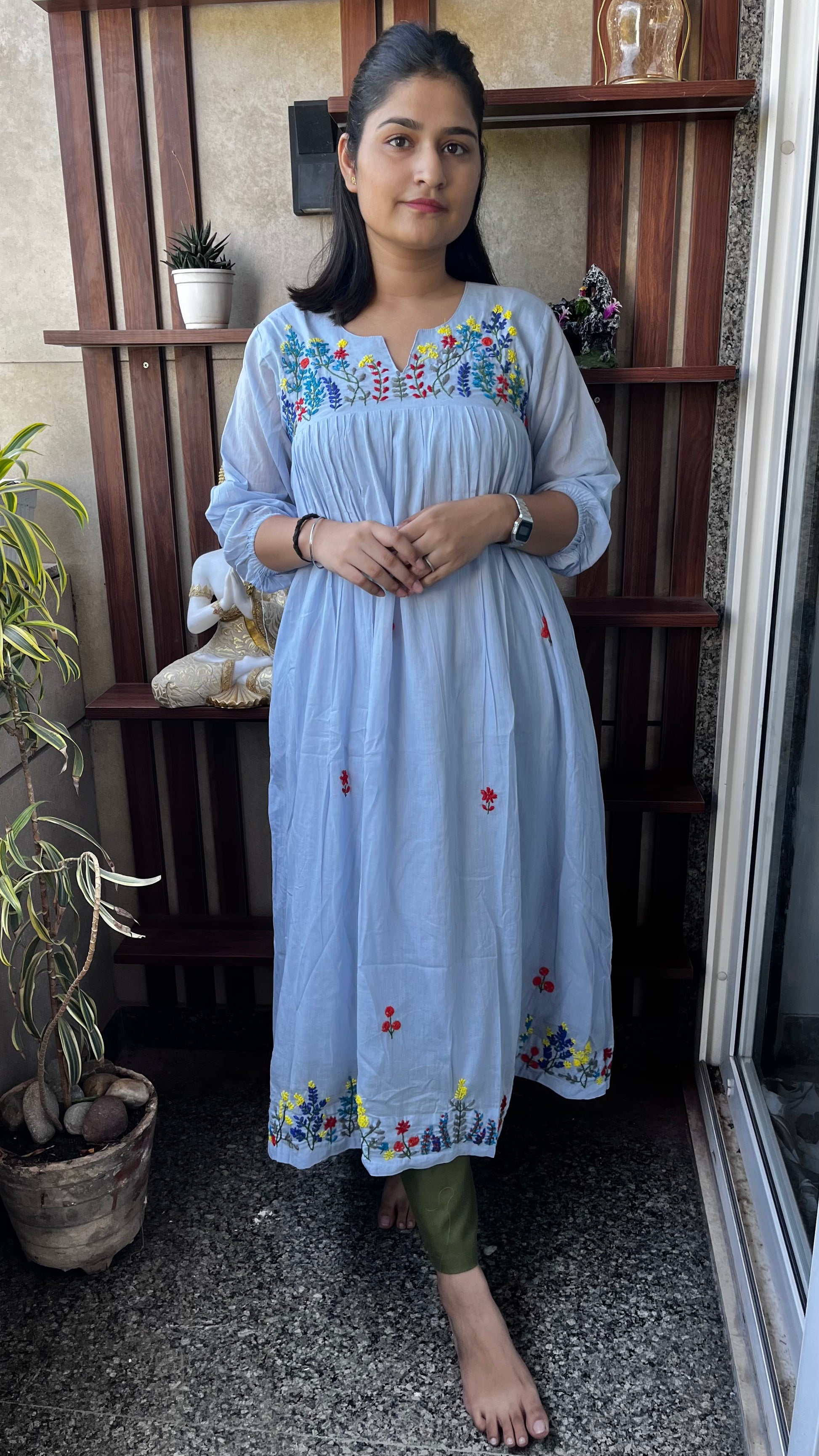 - The vibrant floral hand embroidery on the yoke and ghera enhance its feminine charm, making it a perfect choice for casual outings or festive occasions