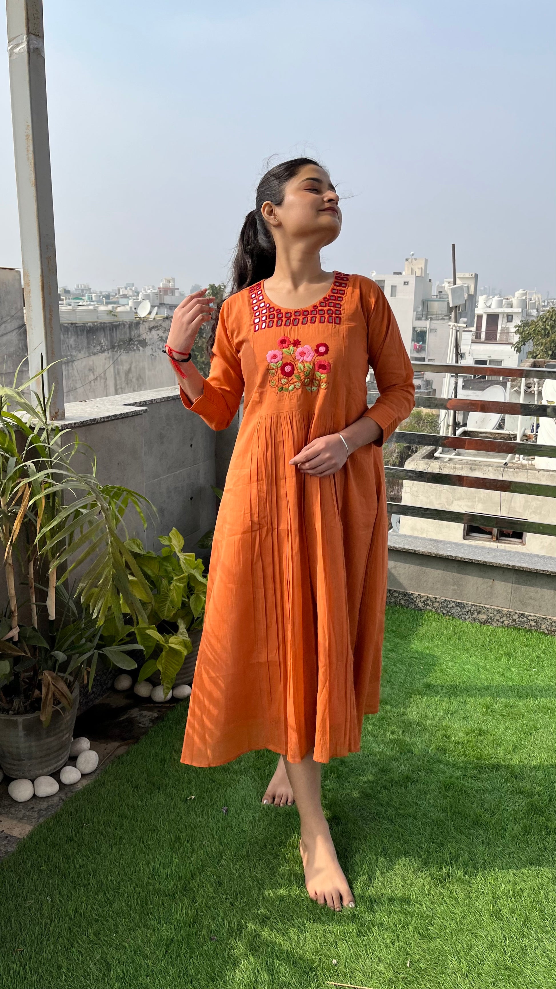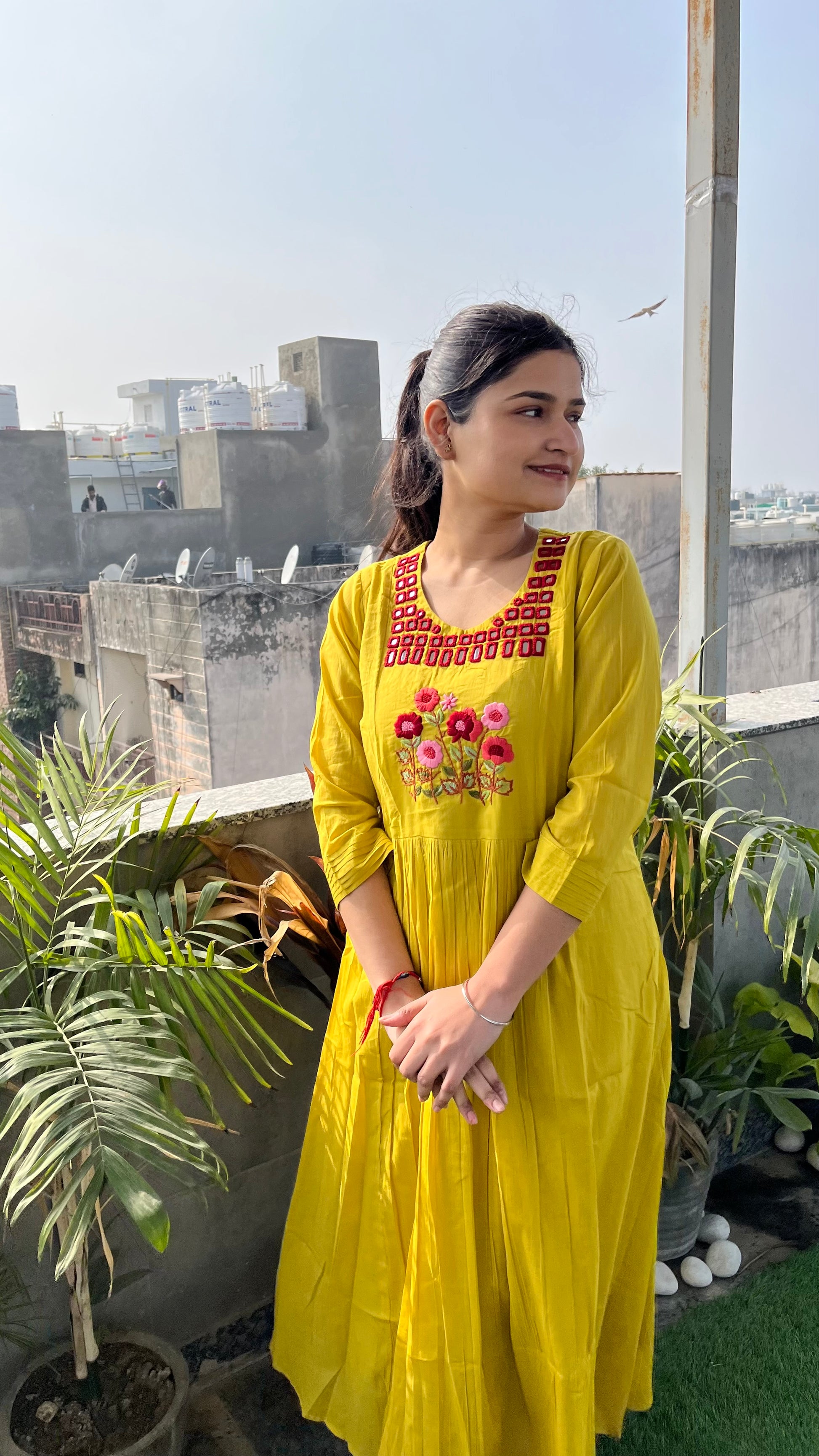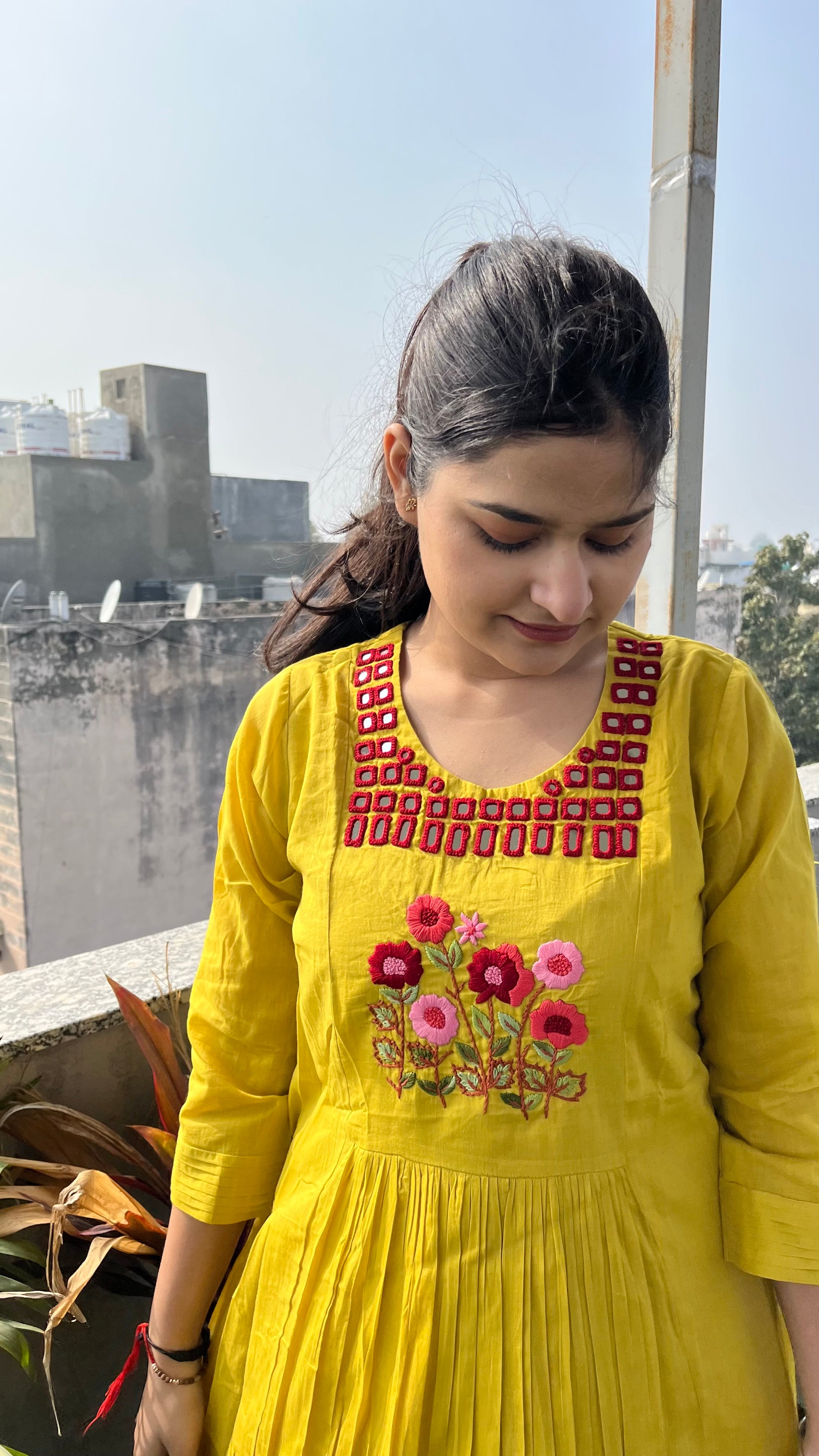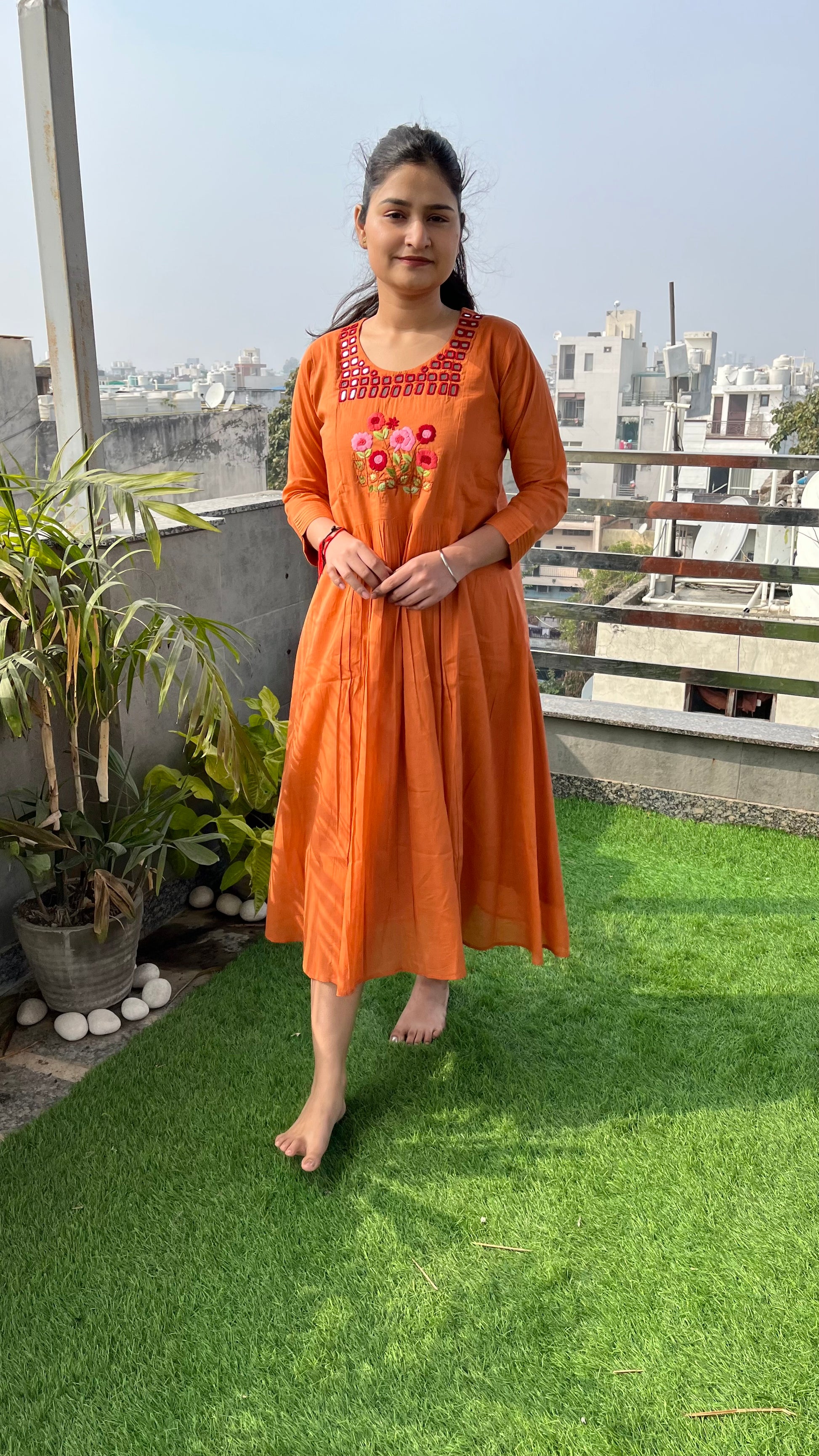 - The detailed hand embroidery with colorful floral patterns adds a touch of elegance, while the mirror work along the neckline enhances its festive charm.