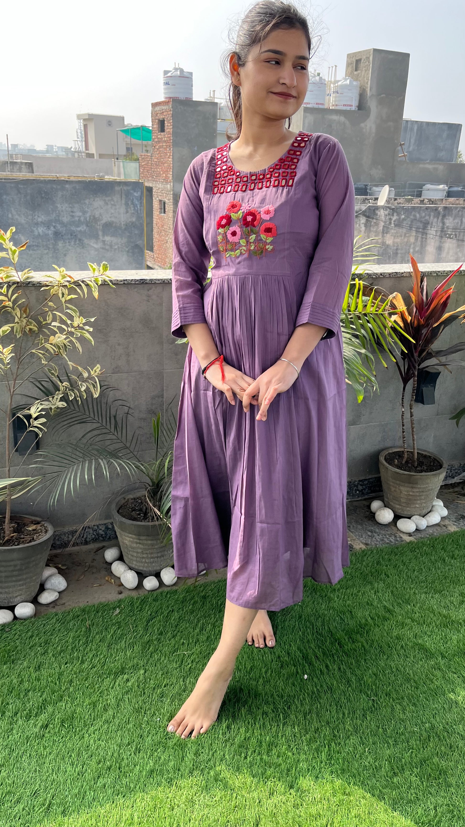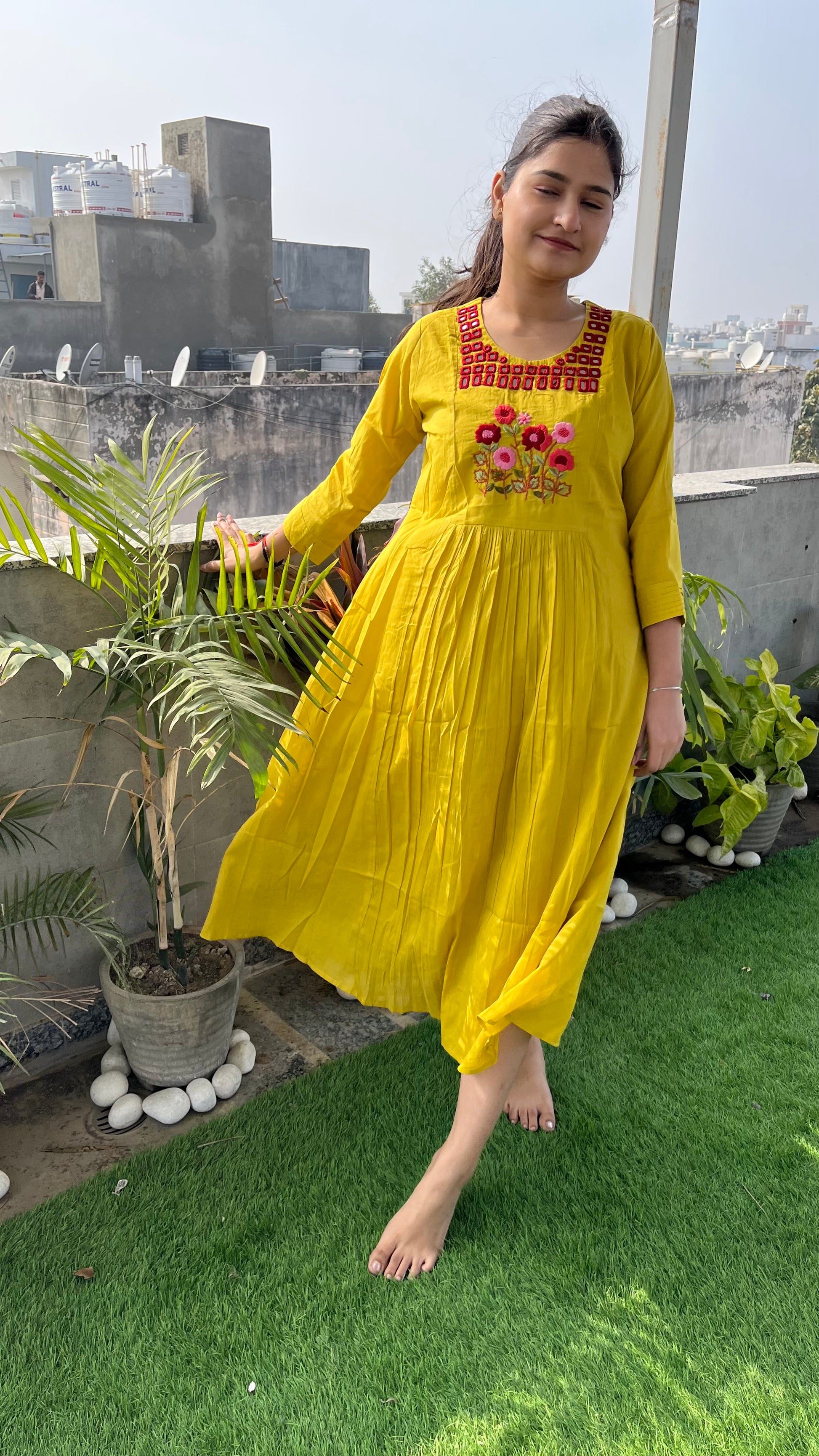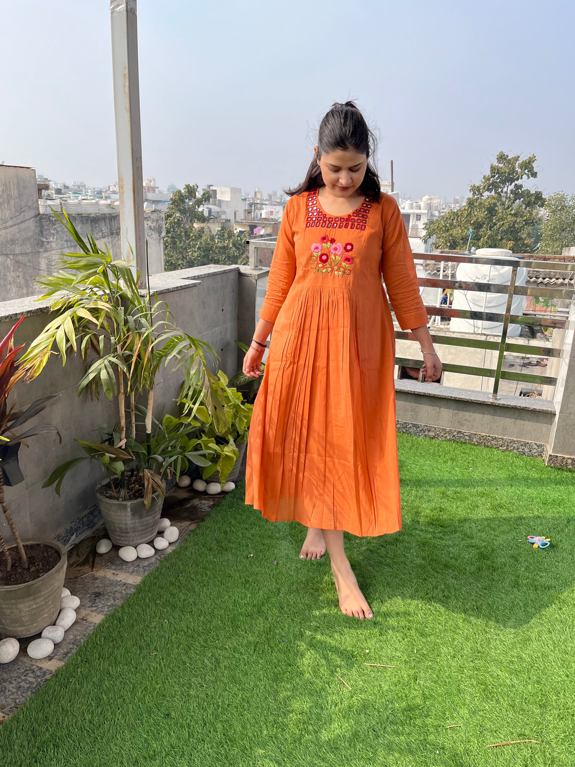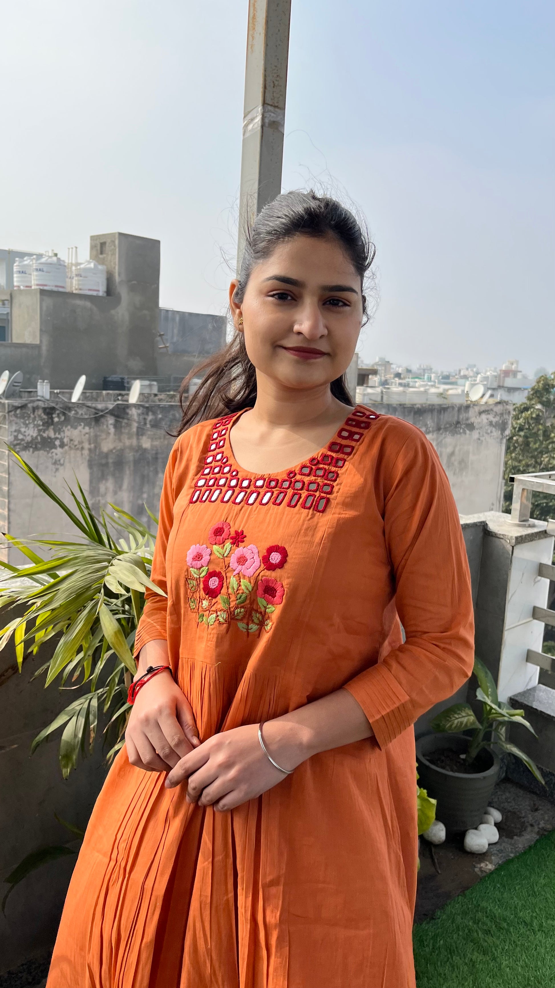 - The detailed hand embroidery with colorful floral patterns adds a touch of elegance, while the mirror work along the neckline enhances its festive charm.