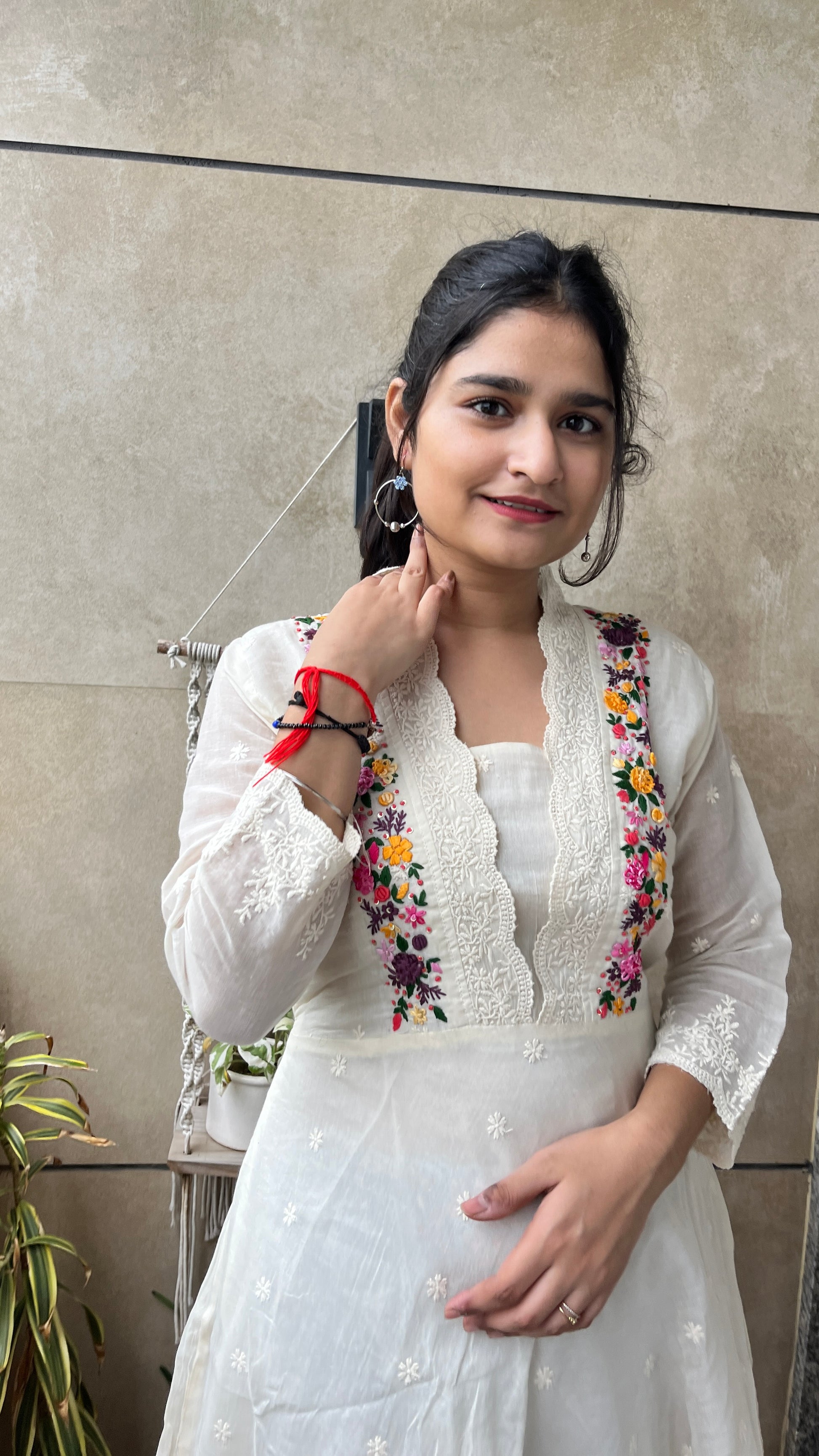 It is beautifully hand embroidered with designer neck. Edges all round have beautiful flower weaving.