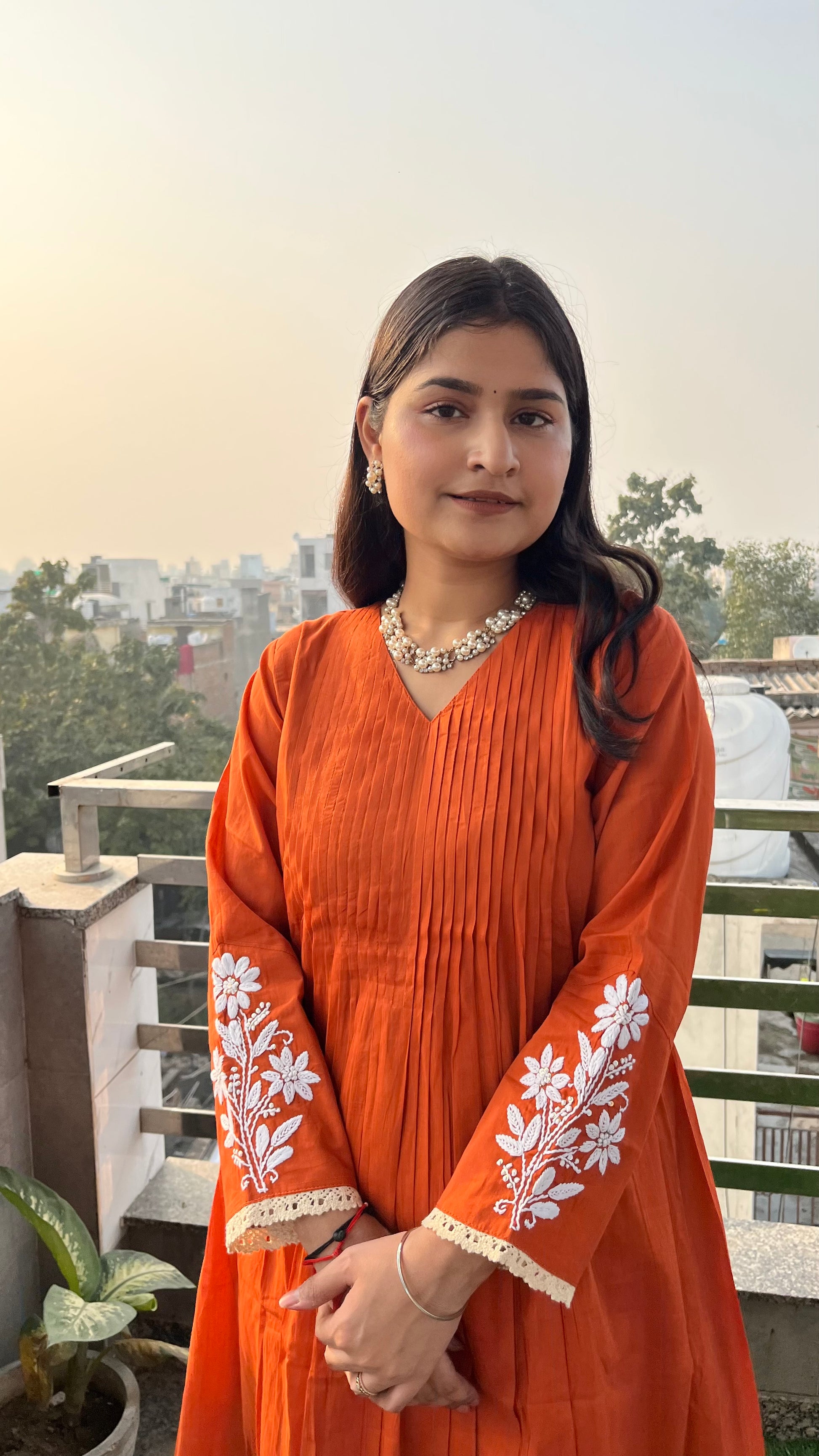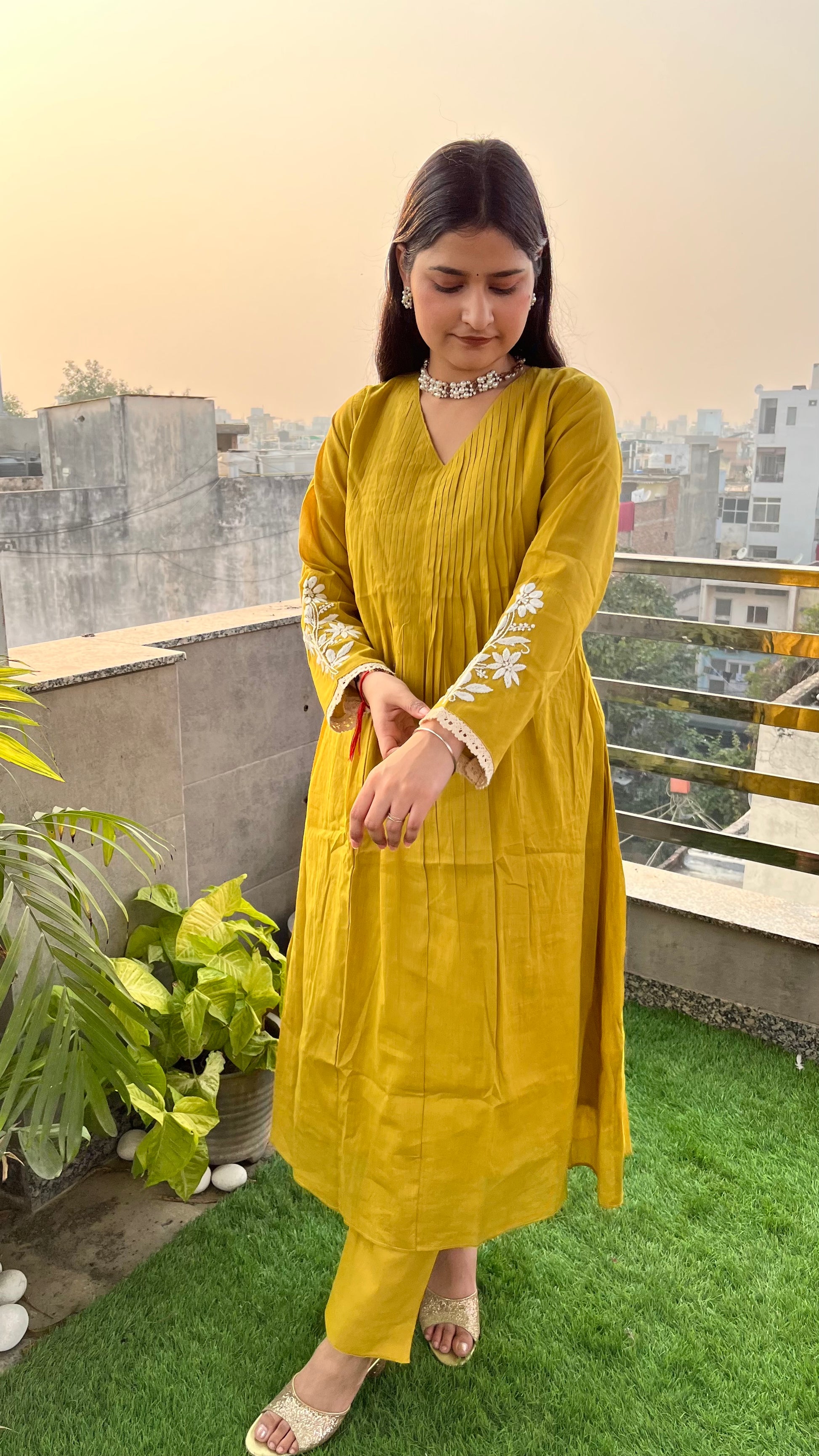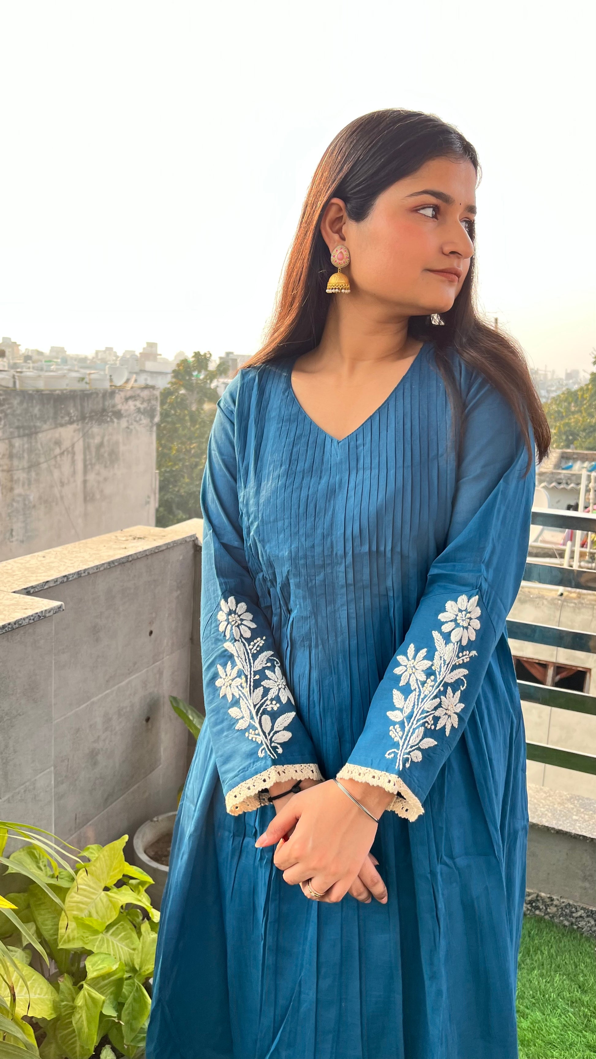 - The V-neck kurta showcases exquisite hand-embroidered Chikankari work on the sleeves and back, complemented by delicate lace detailing around the cuffs.