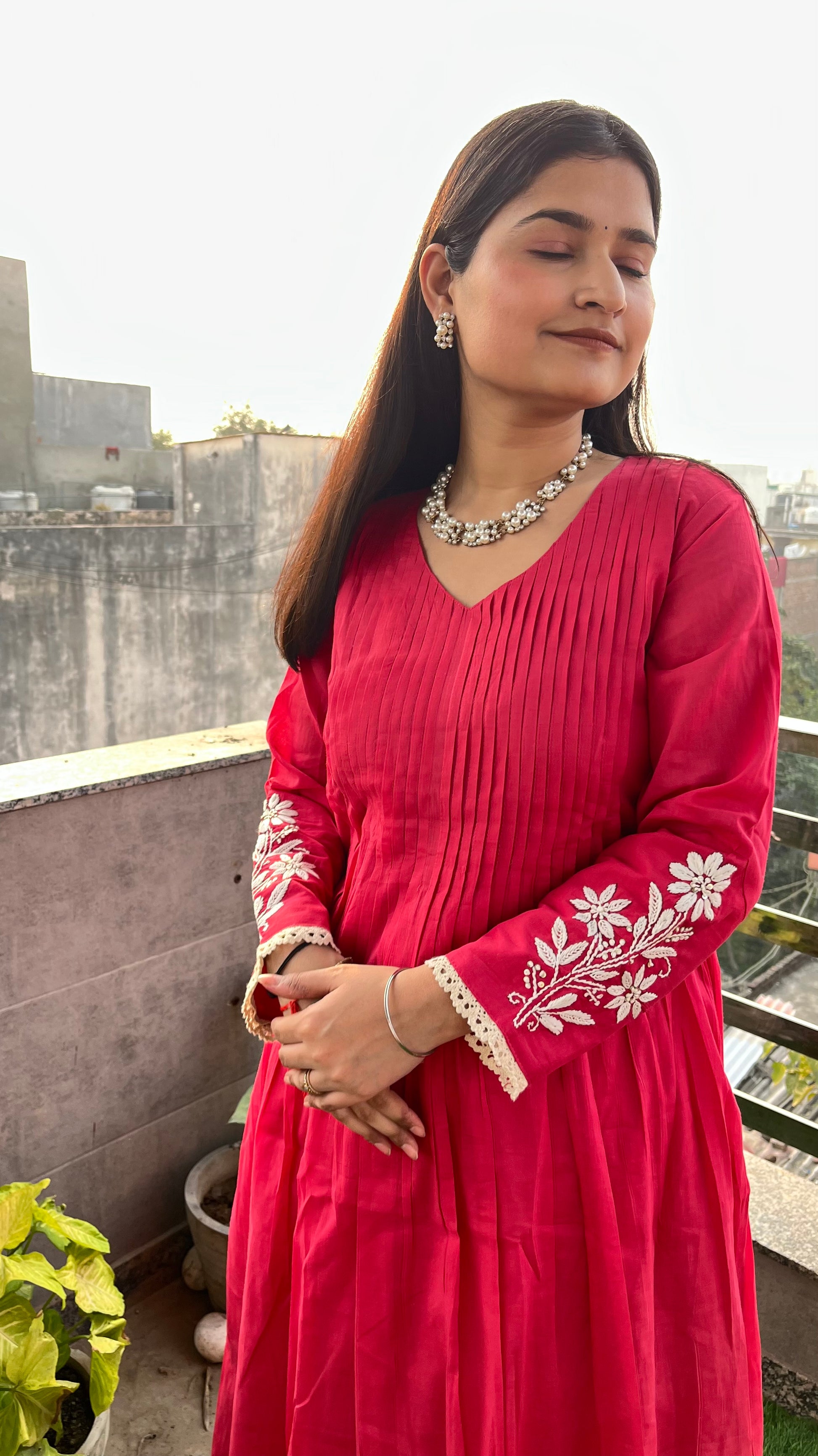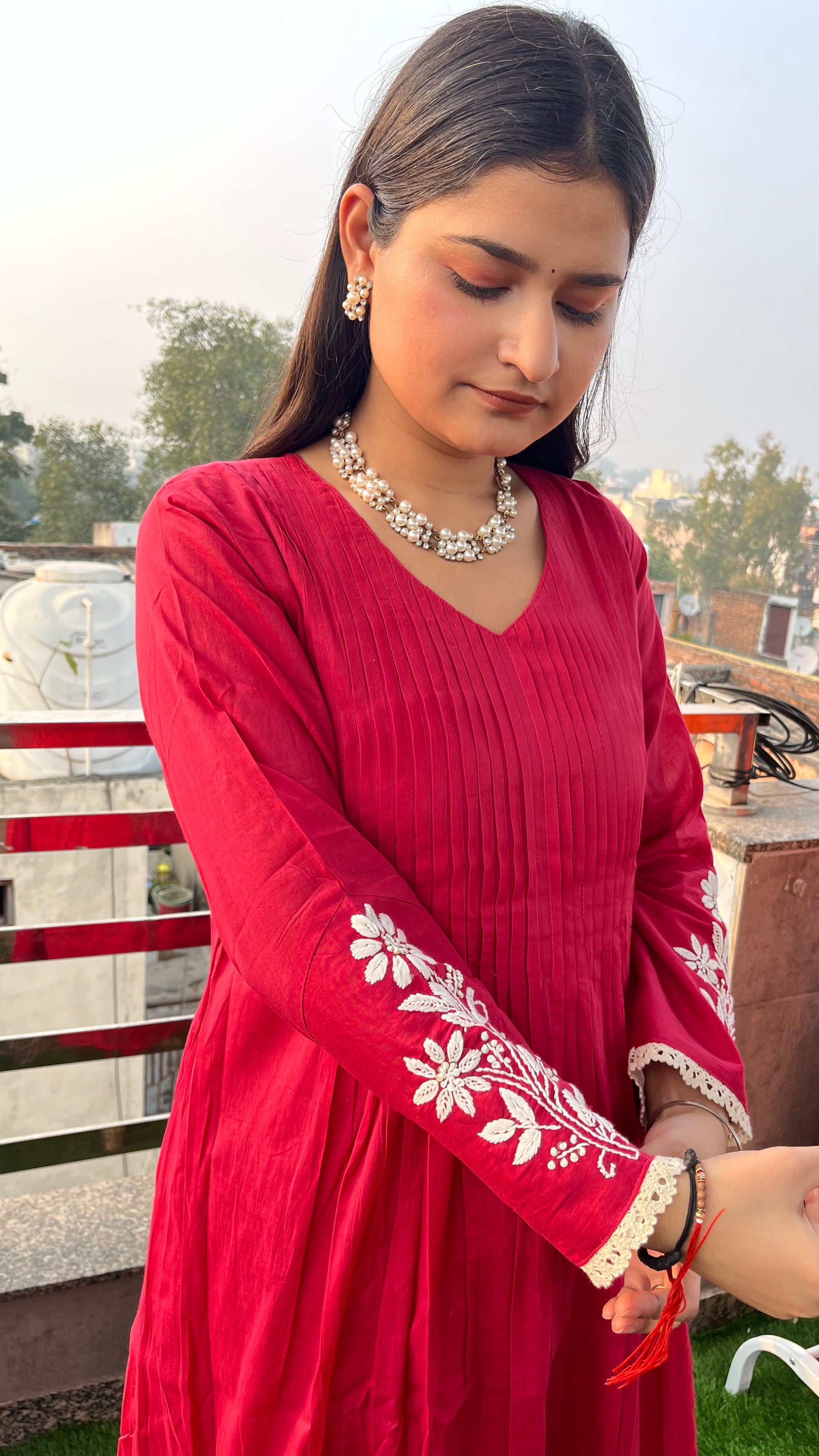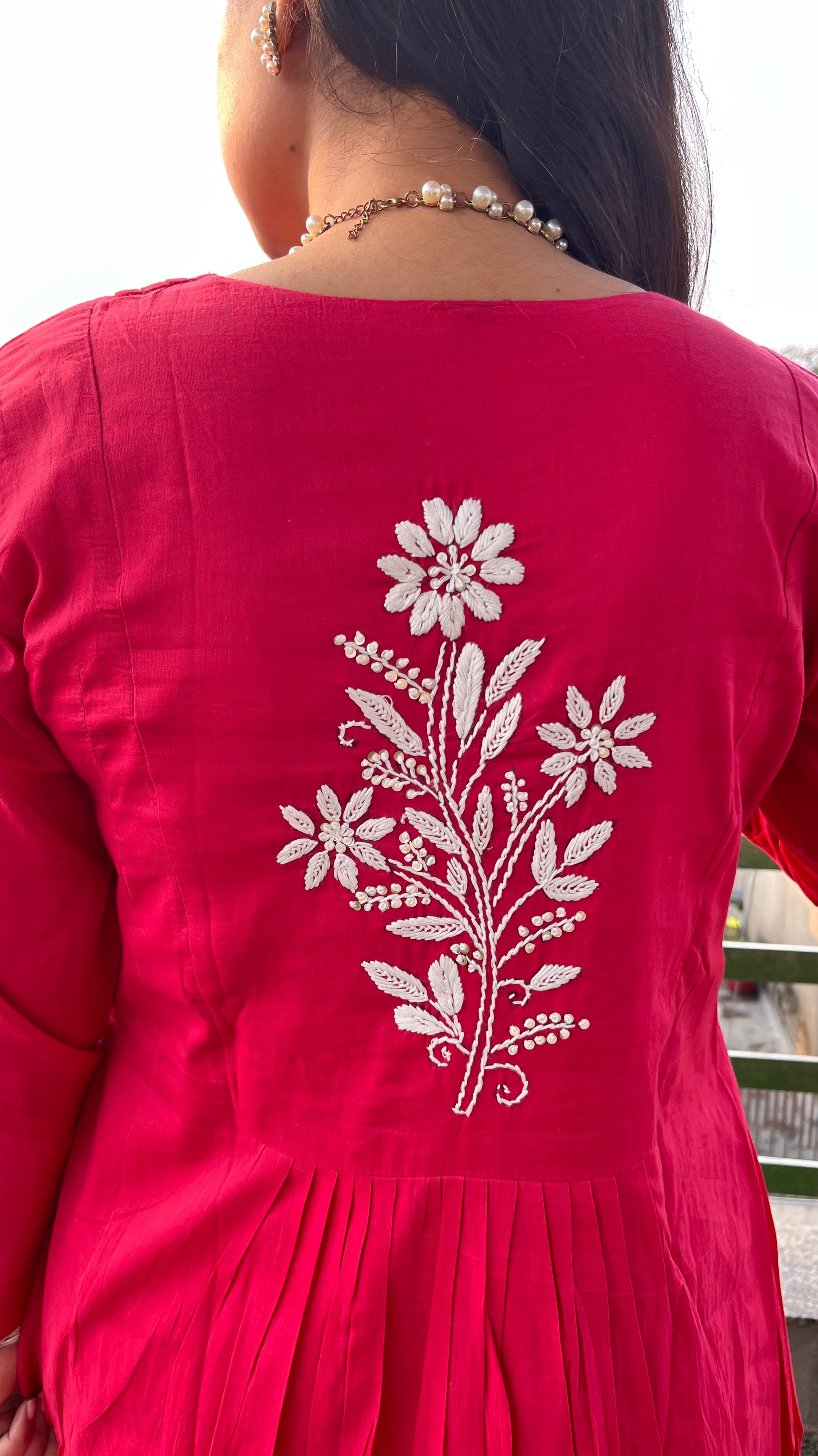 - The V-neck kurta showcases exquisite hand-embroidered Chikankari work on the sleeves and back, complemented by delicate lace detailing around the cuffs.