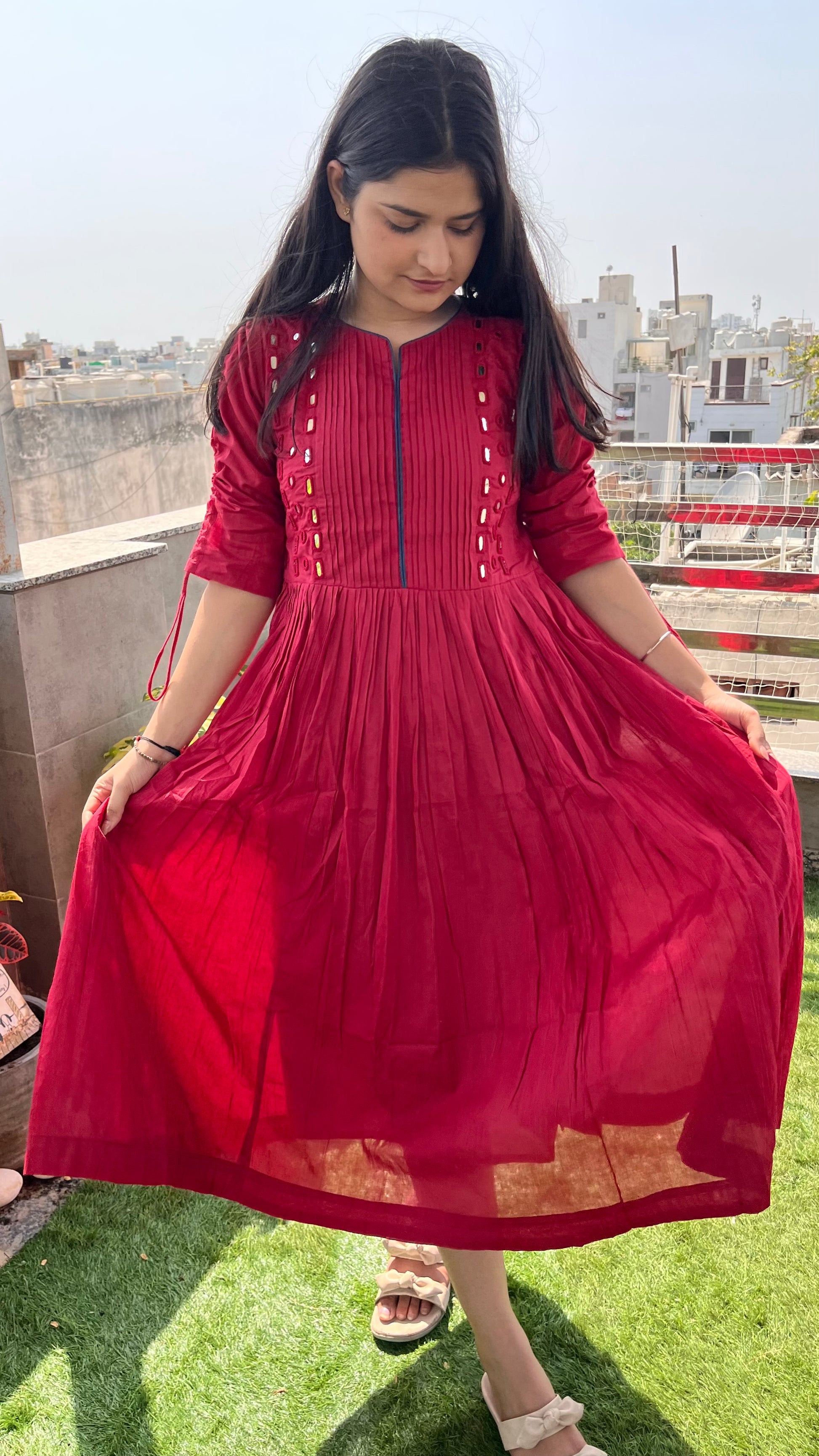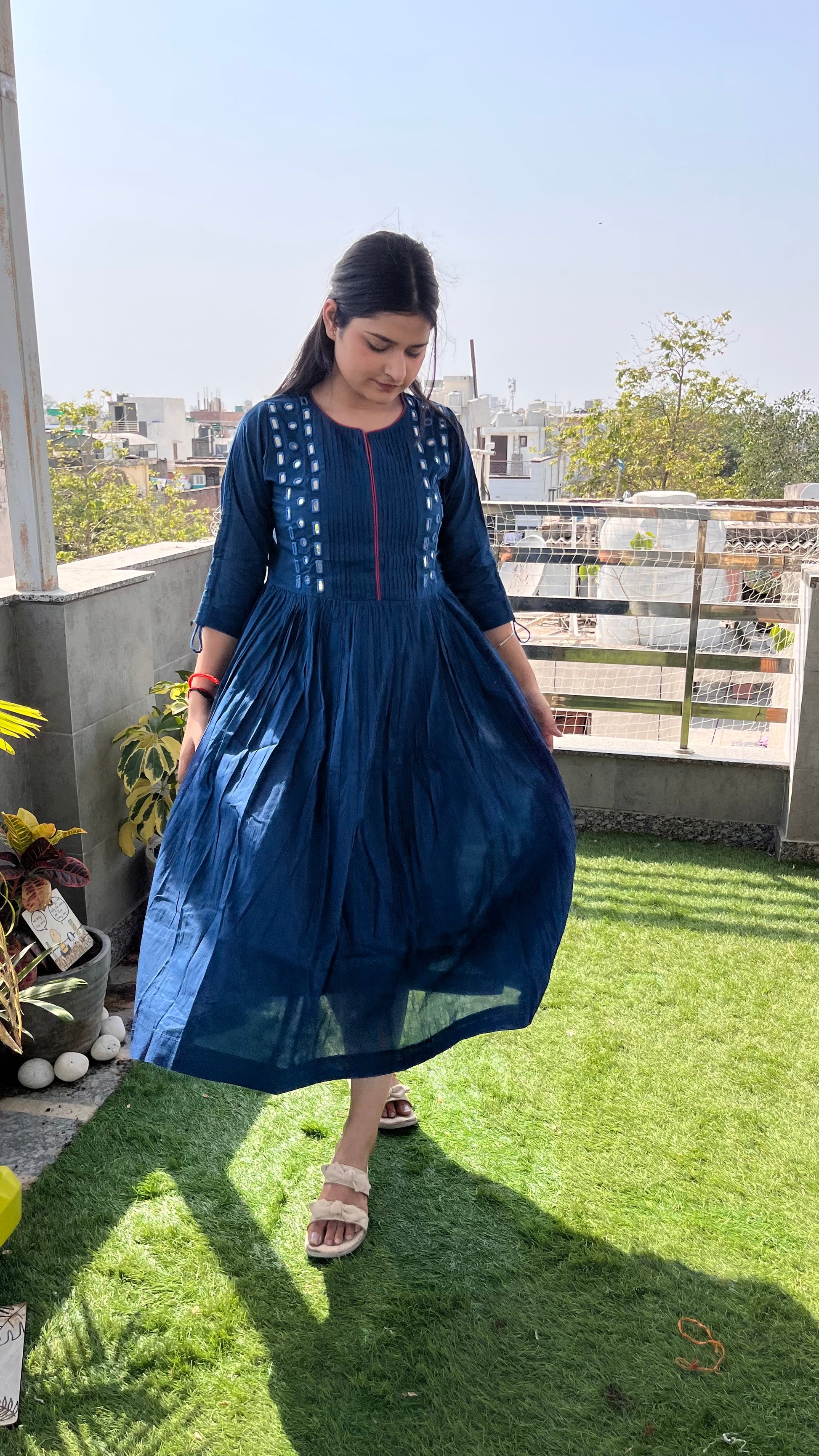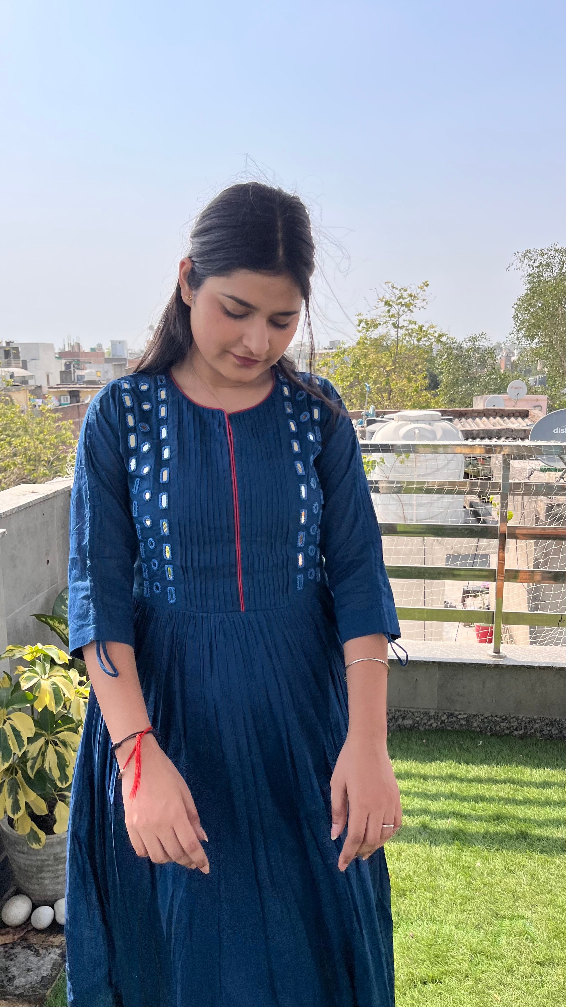 - Beautiful mirror work on neck area with piping design.