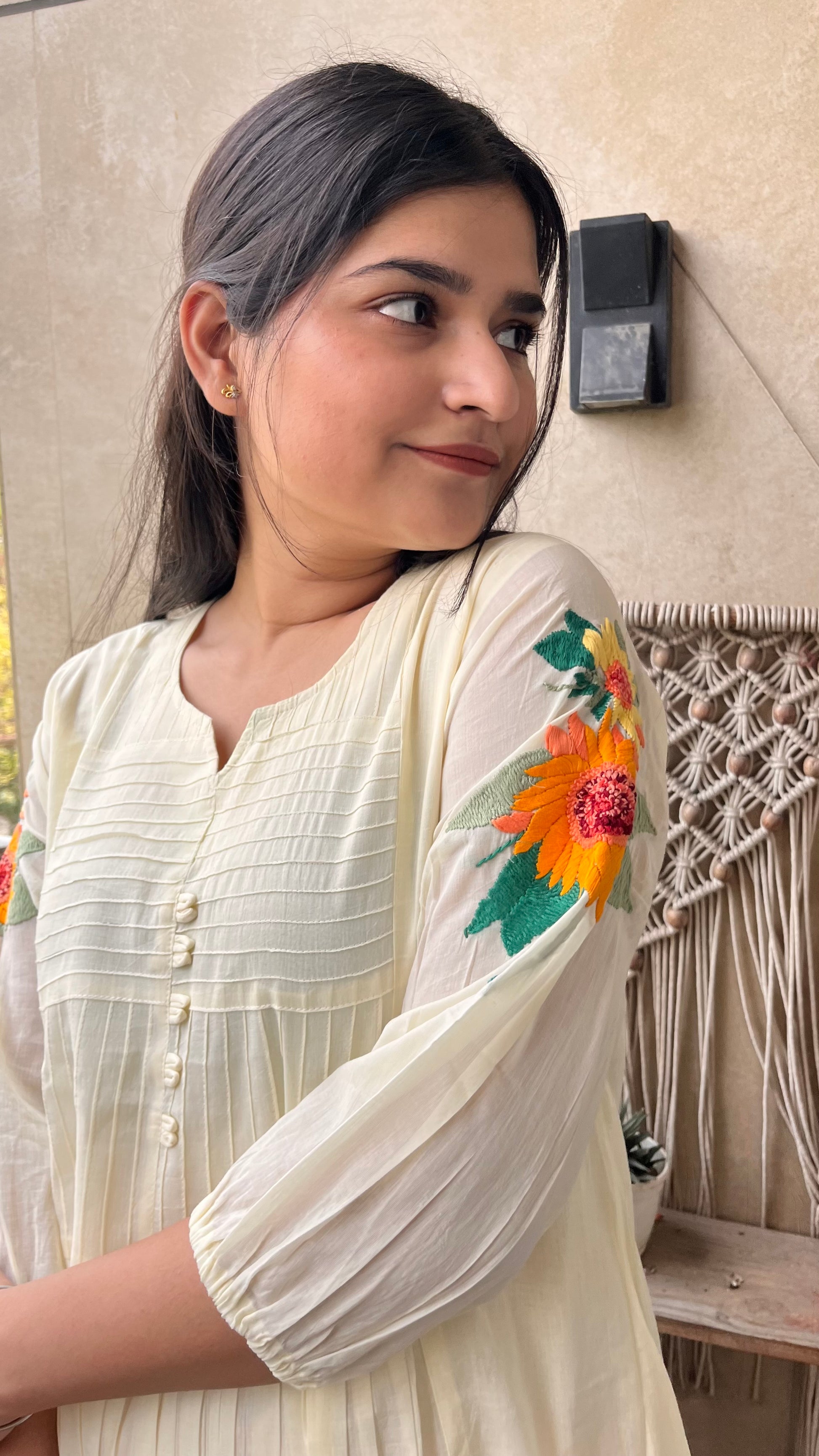 - This exquisite piece features beautiful hand-embroidered sunflowers on the sleeves, adding a touch of artisanal flair.
