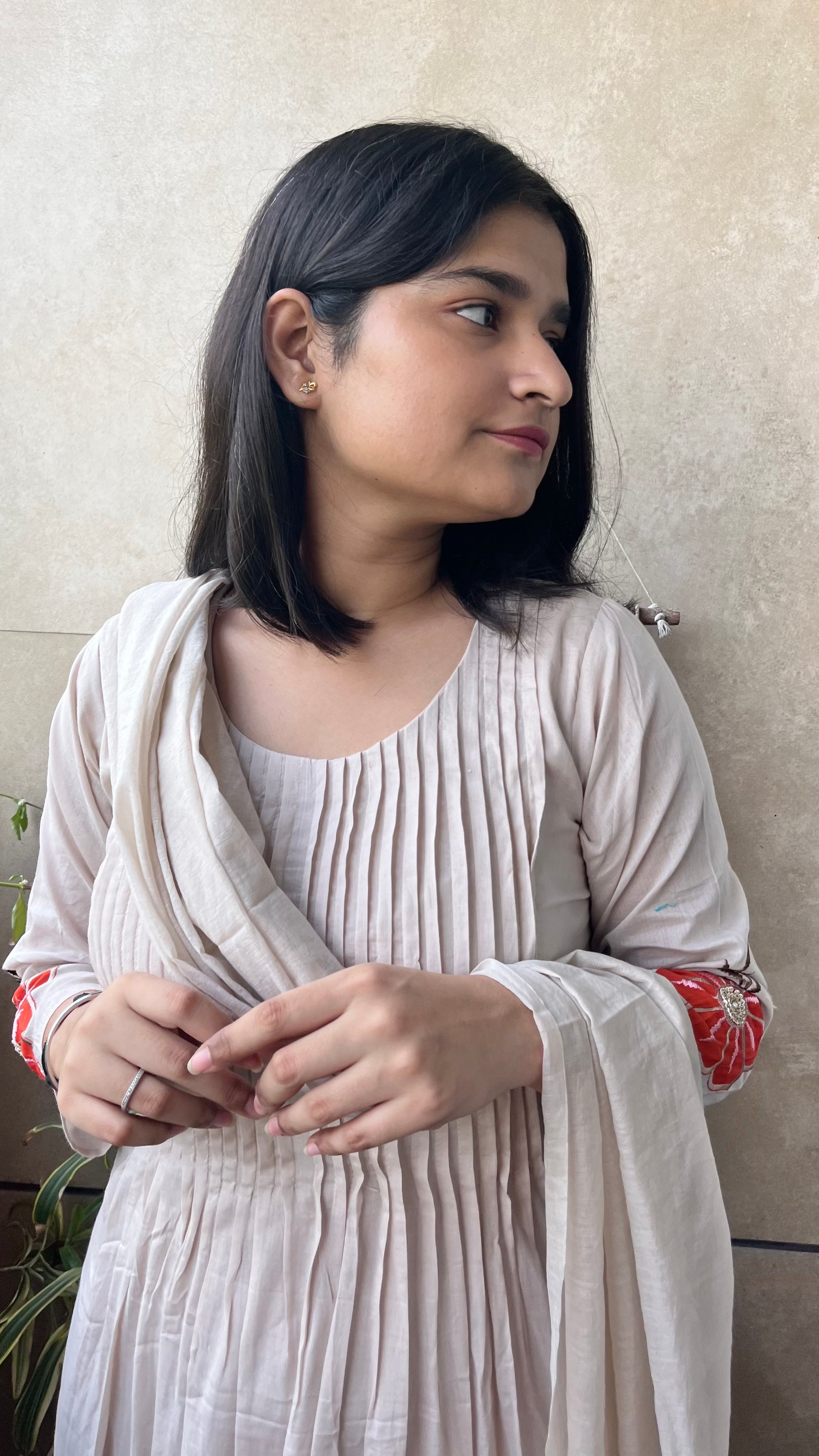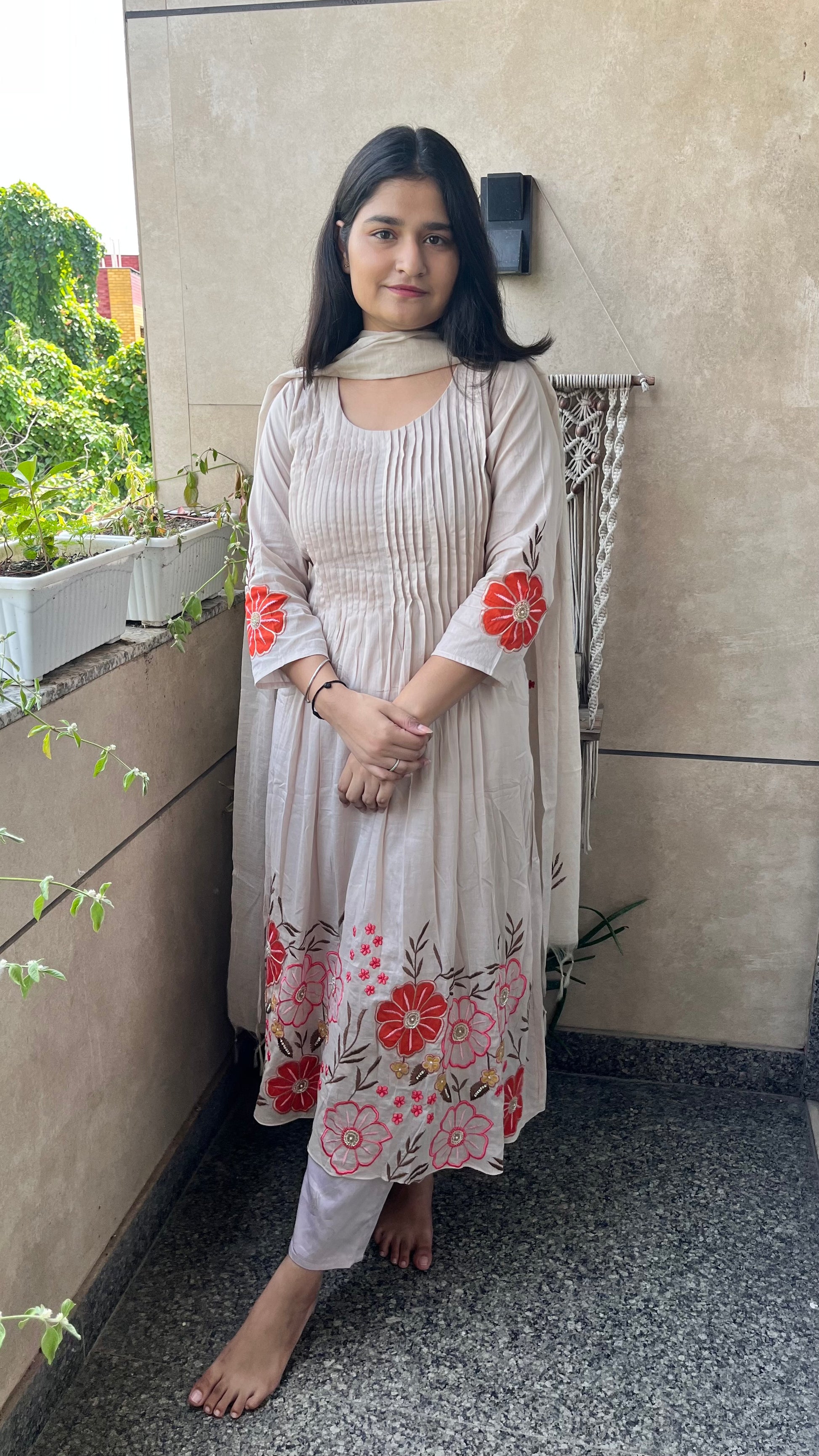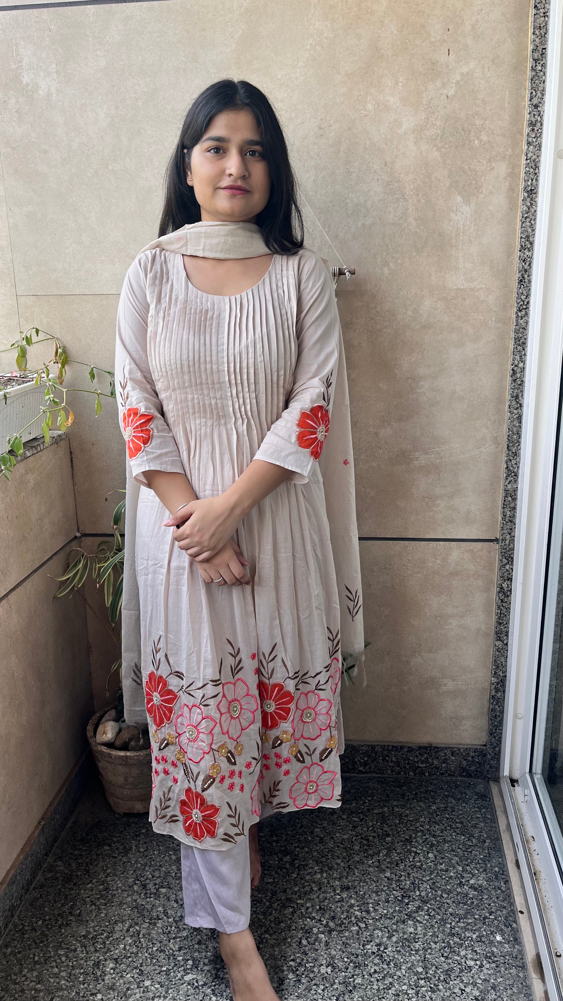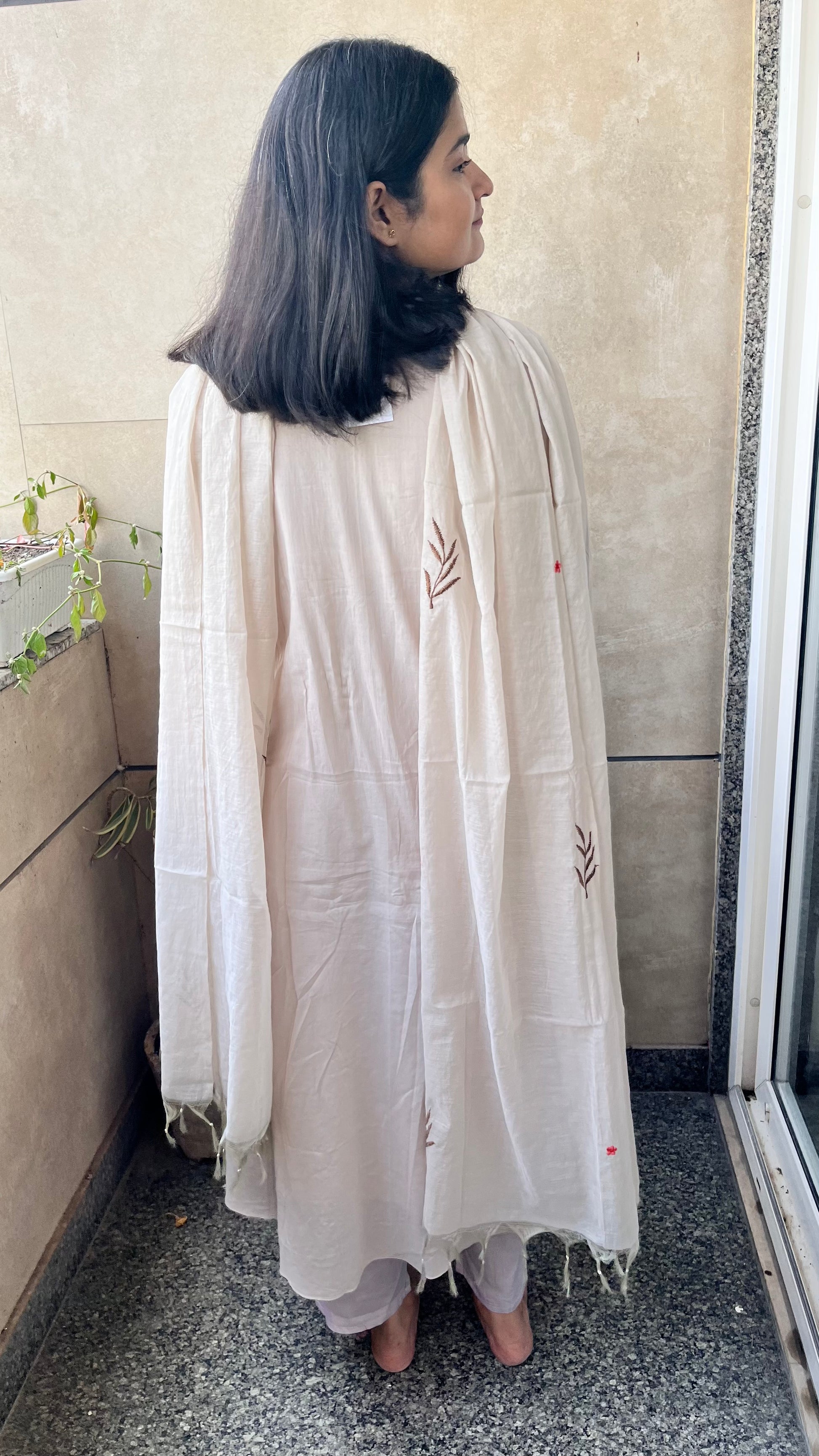 It is a 3 piece set with kurta pant and duptta set. Kurta is of mul mul with mul lining, dupatta is of mul chanderi and pant is of satin.